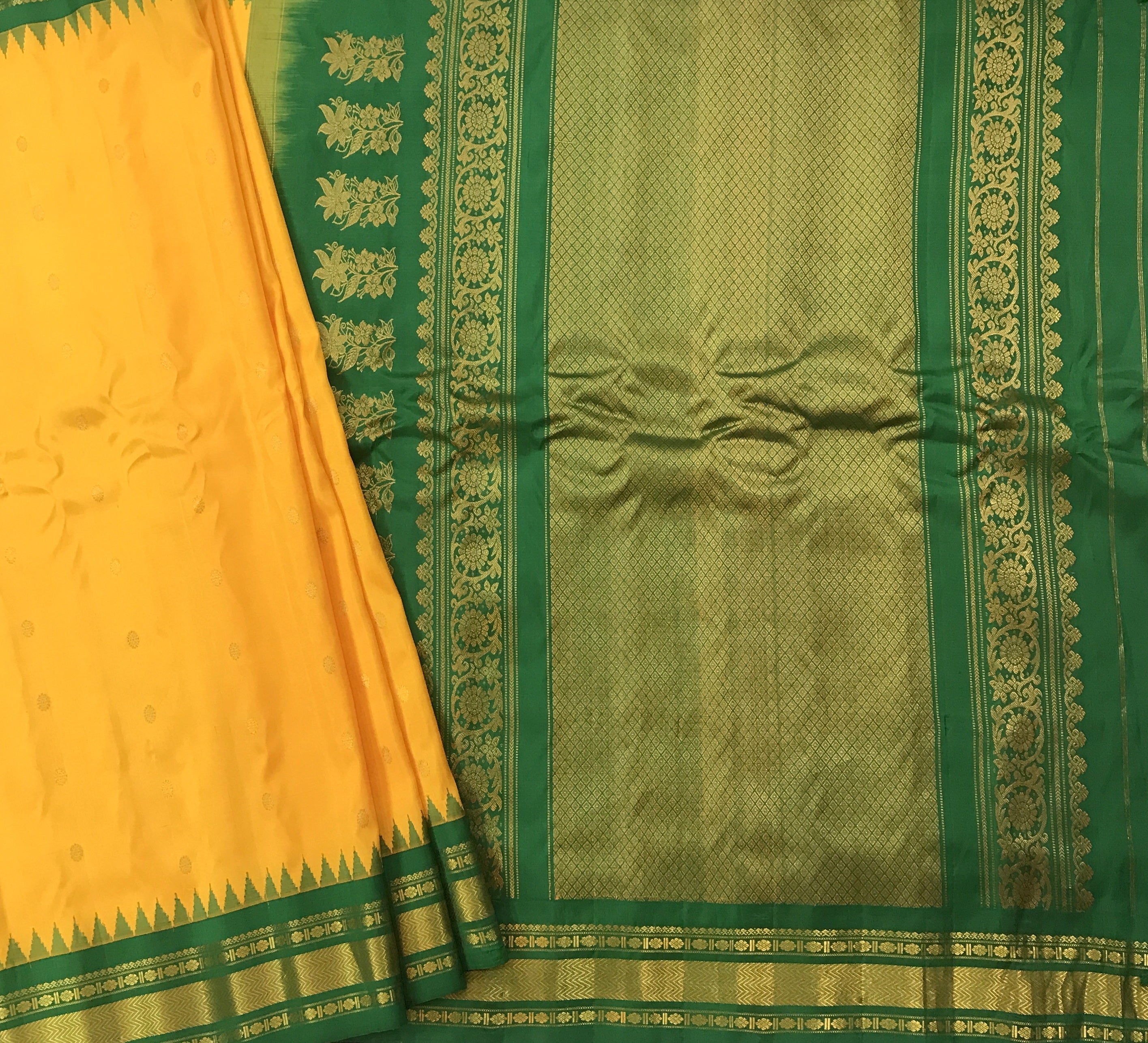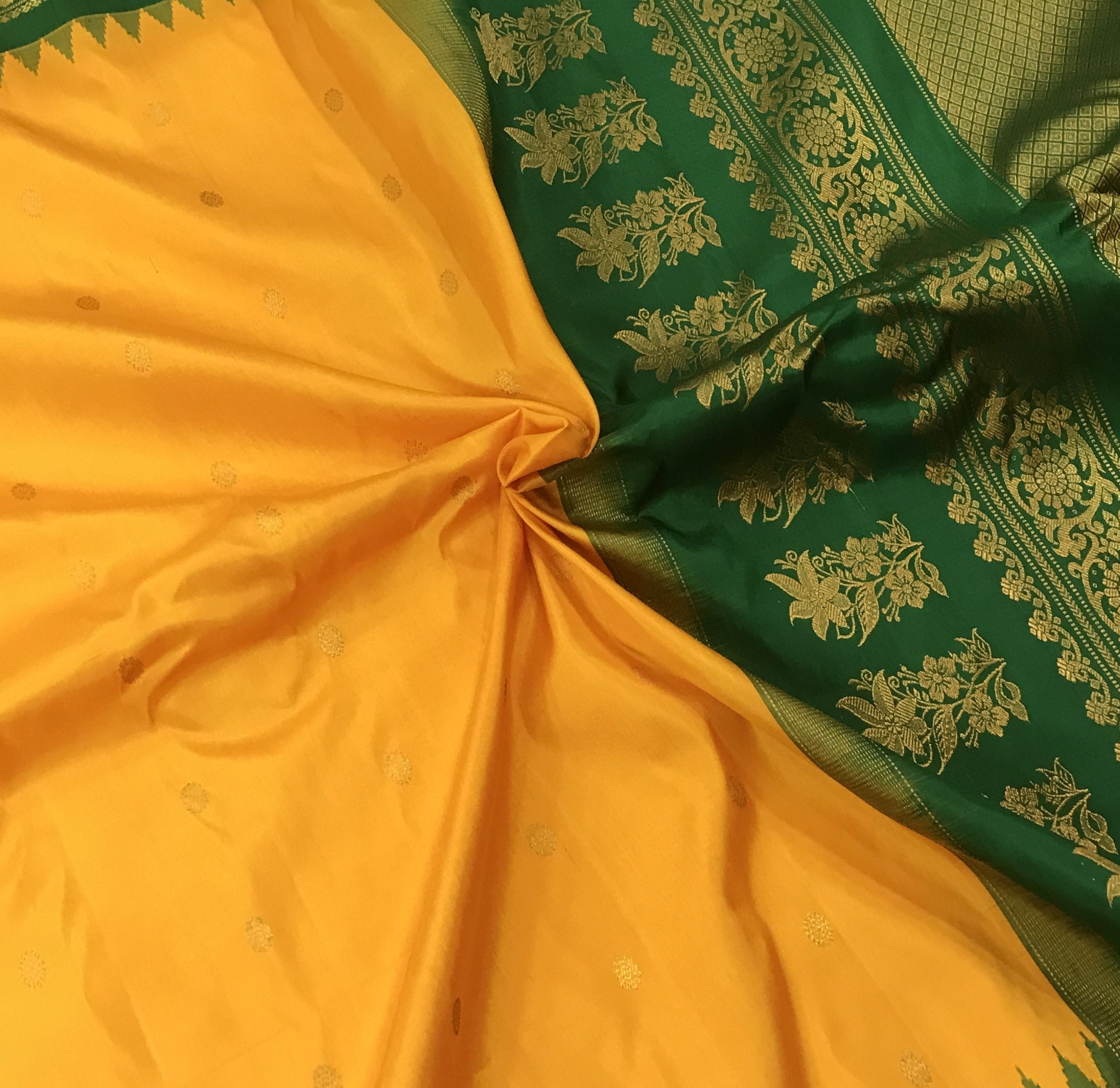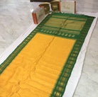 This elegant Mango Yellow Gadwal saree features a striking contrast green border, adding a vibrant touch to its classic appeal. The body is adorned with delicate zari butti, offering a rich and graceful look. A beautifully woven contrast pallu enhances its traditional charm, making it perfect for festive occasions and celebrations