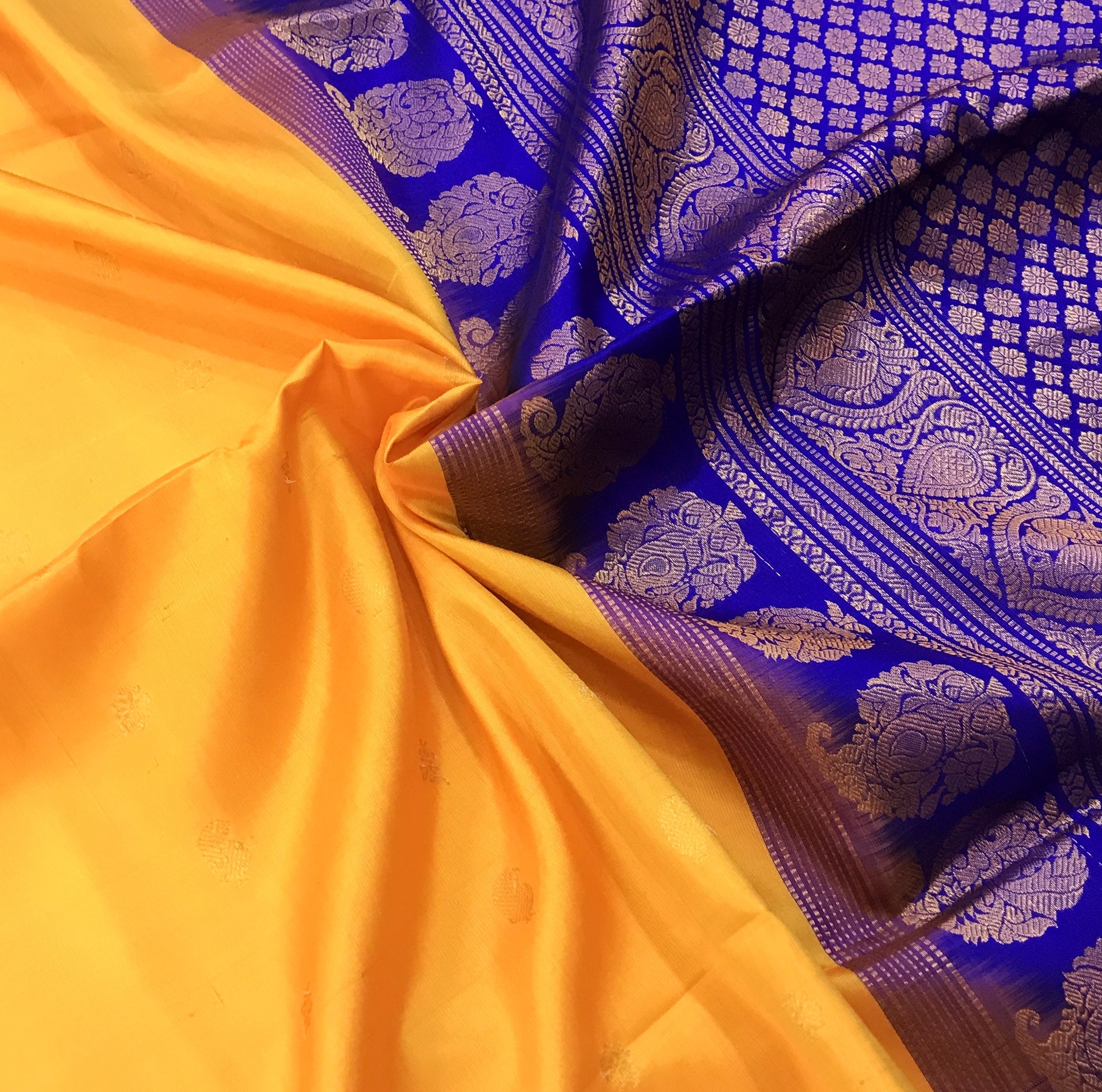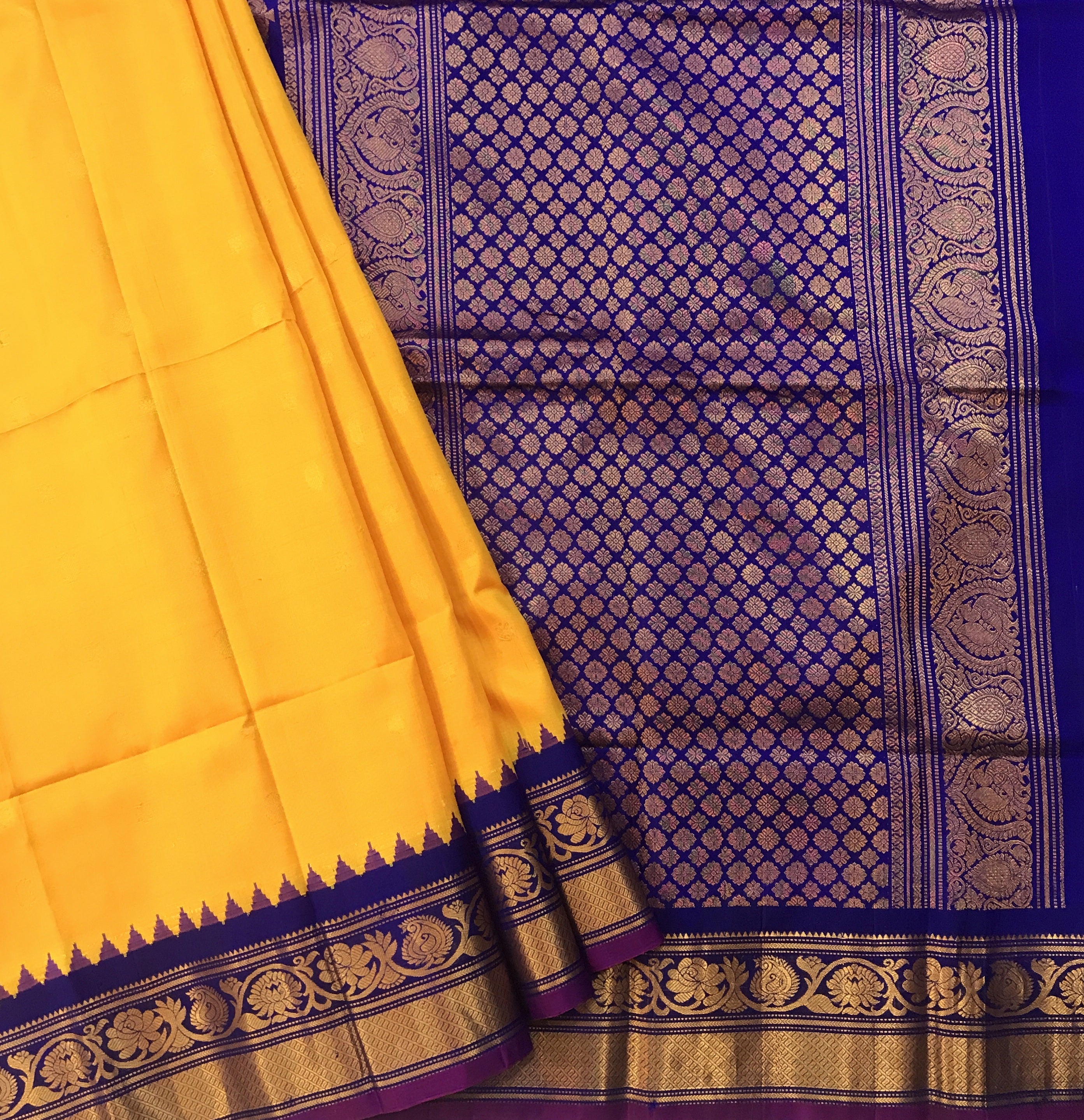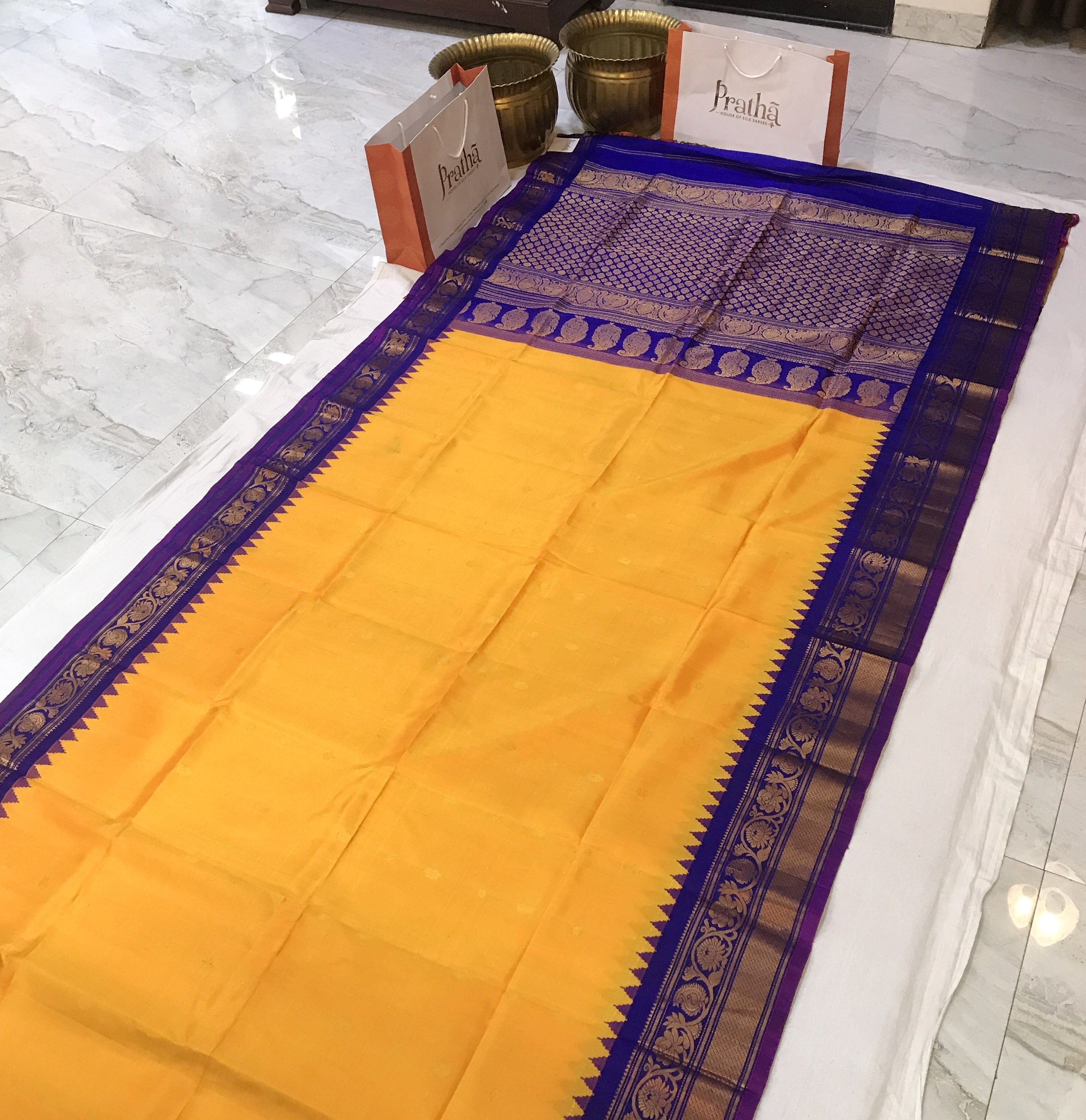 A fresh and gorgeous shade of mango-yellow with contrasting blue border with intricate design is a unique combination in traditional Gadhwal. This Gadhwal has uncommon 'peacock feather' golden zari butti all over the saree look great. The specialty of this saree is that it has a temple border and golden zari design pallu which gives this saree a unusual grace! This saree will look great on a bride or at traditional function. This is one of Pratha's favorite!