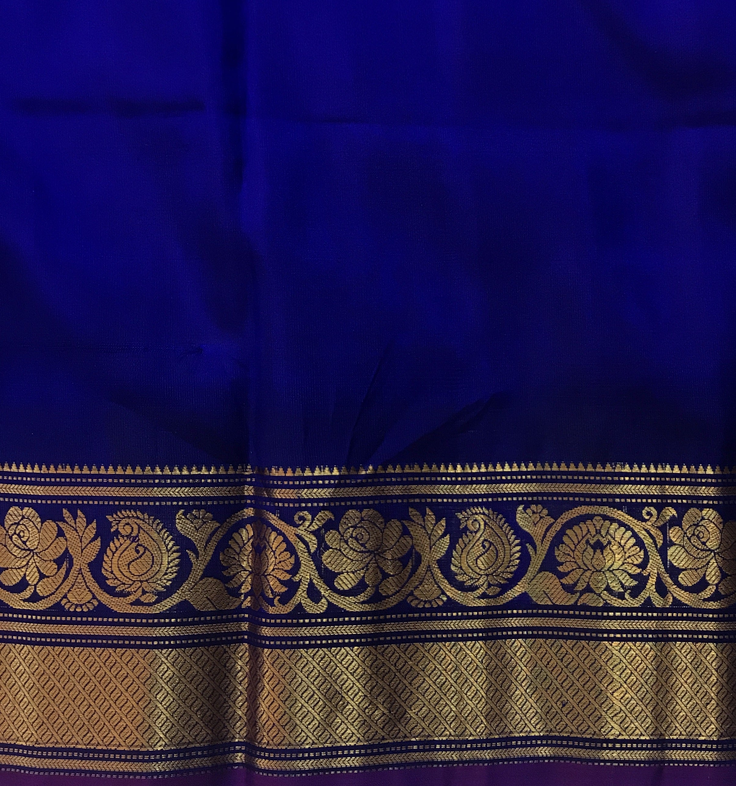 Blouse Colour: Contrast ( Blue with golden zari border )