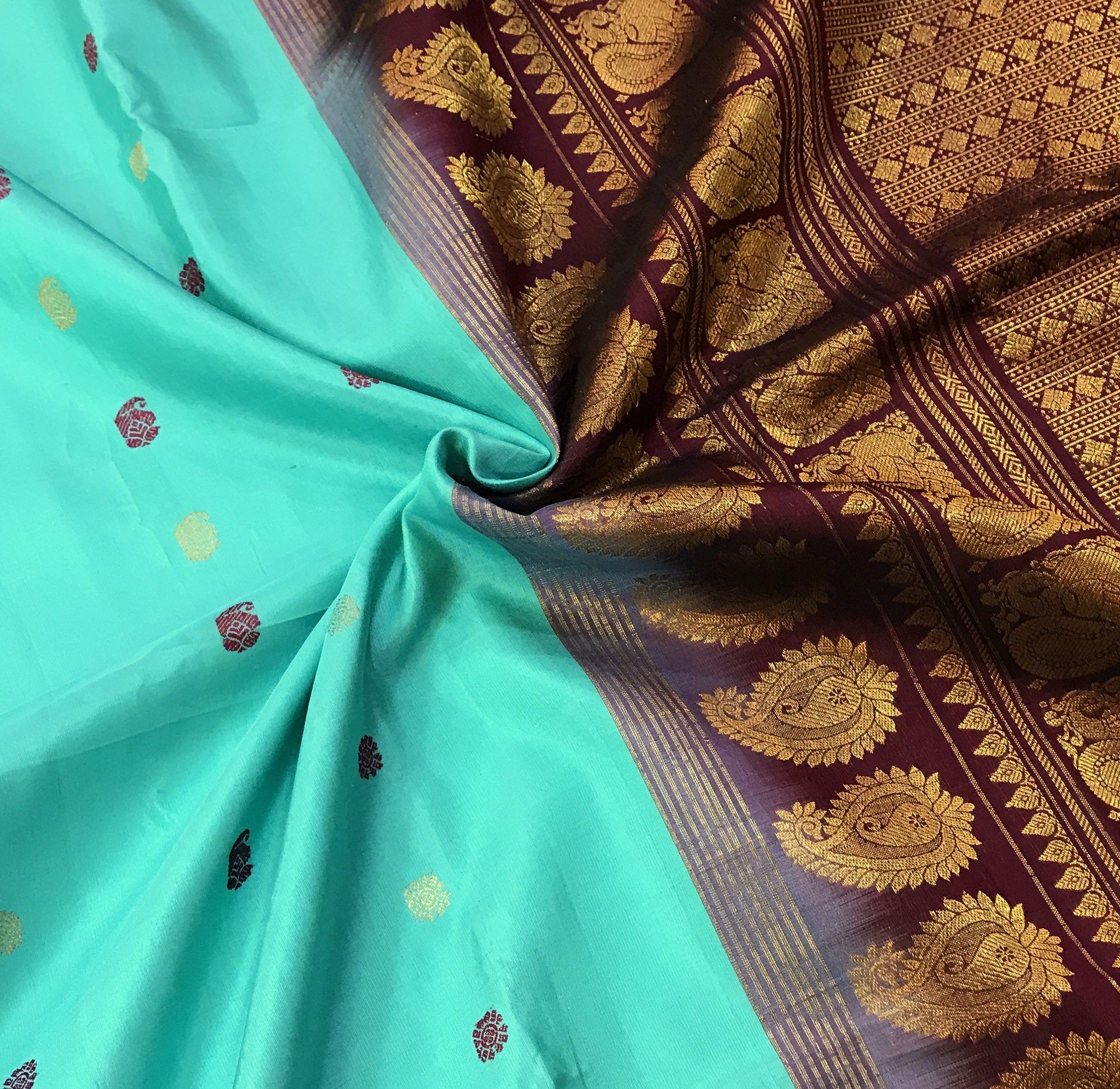 This is a gorgeous and unusual combination and a unique one too! Bluish green with an brown zari border and pallu. The traditional style woven border makes the brown stand beautifully against the bluish green saree! The butti design of this saree is equally beautiful in alternate forms of big circle floral and koyari butti in red silk thread with contrast golden zari pallu .For those who are on the lookout for something unique, this one is just for you!