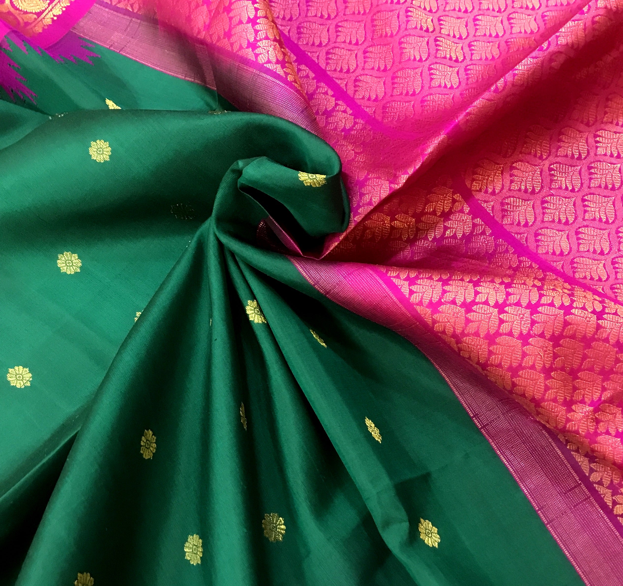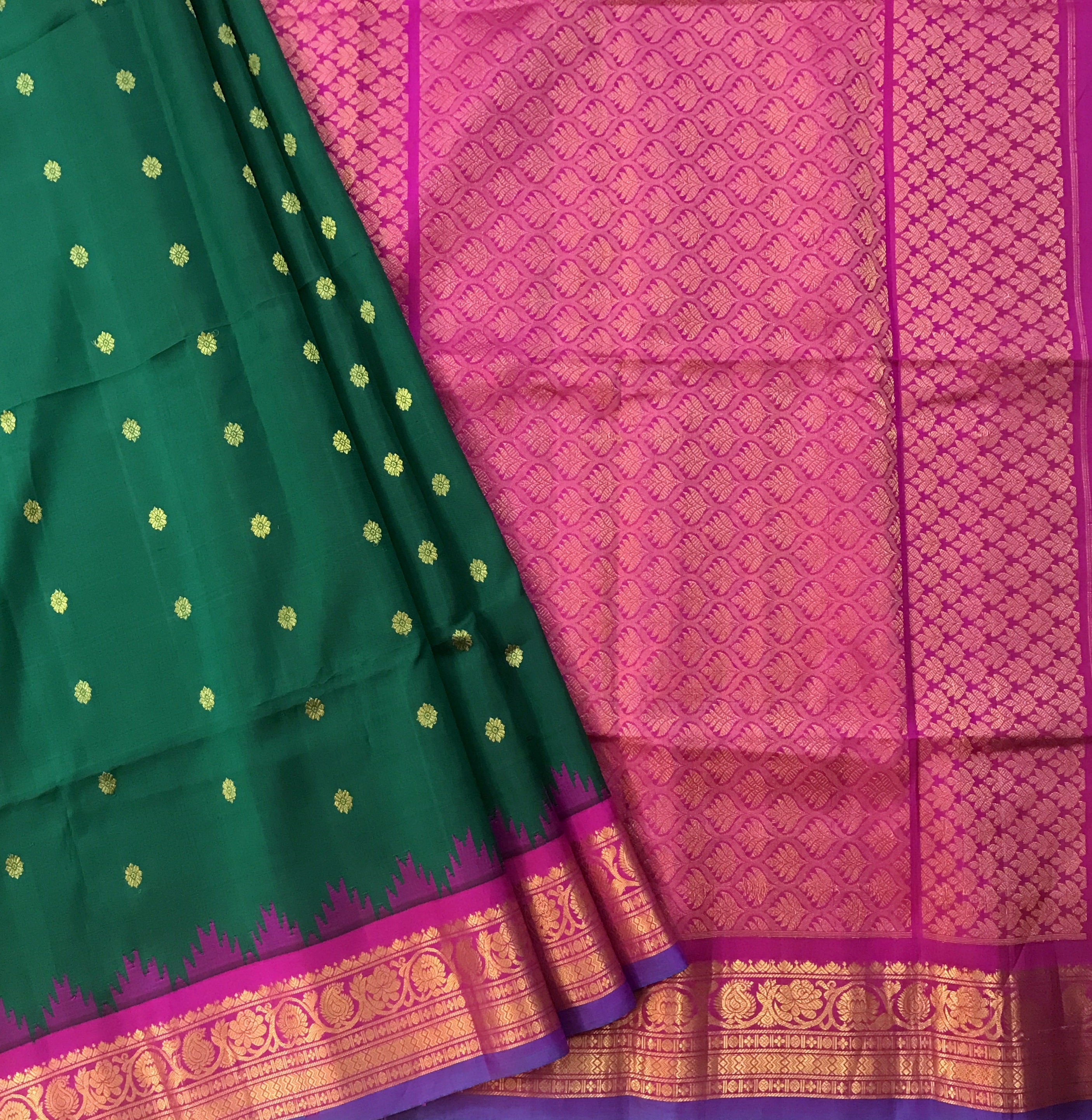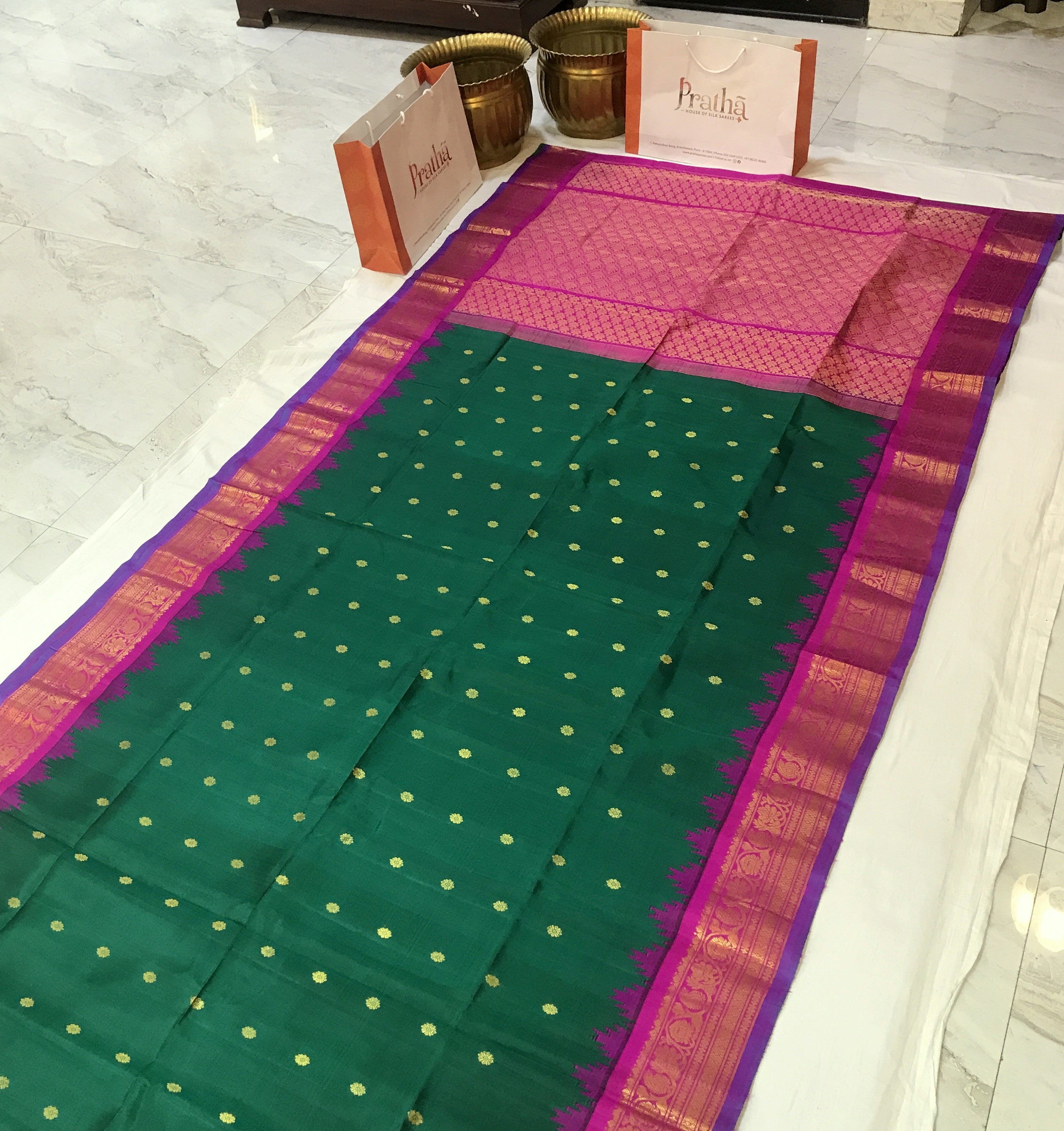 A fresh and gorgeous shade of green with contrasting pink border with intricate design is a unique combination in traditional Gadhwal. This Gadhwal has floral shaped golden zari butti all over the saree look great. The specialty of this saree is that it has a temple border and intricate design zari pallu which gives this saree a unusual grace! This saree will look great on a bride or at traditional function. This is one of Pratha's favorite!