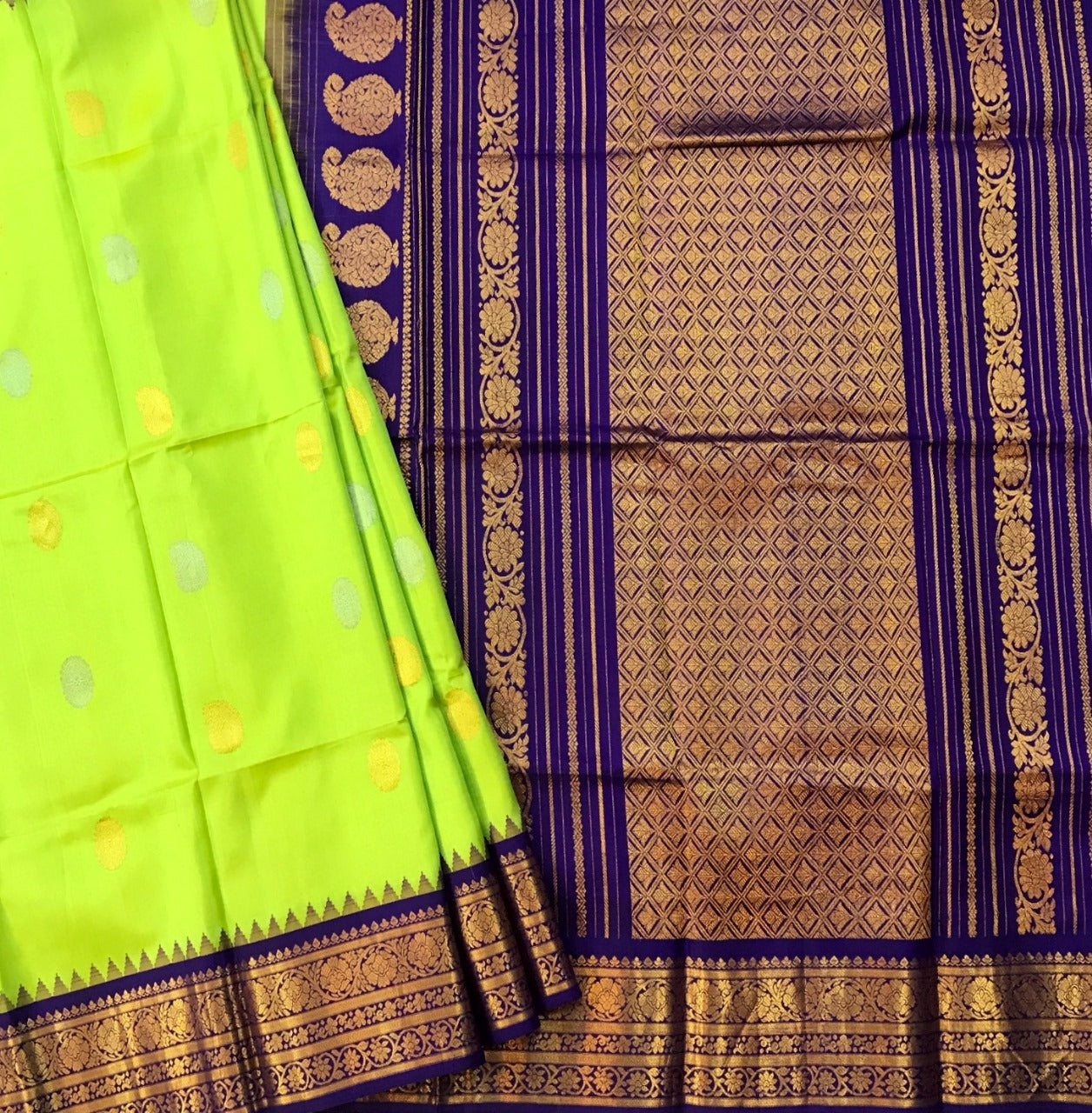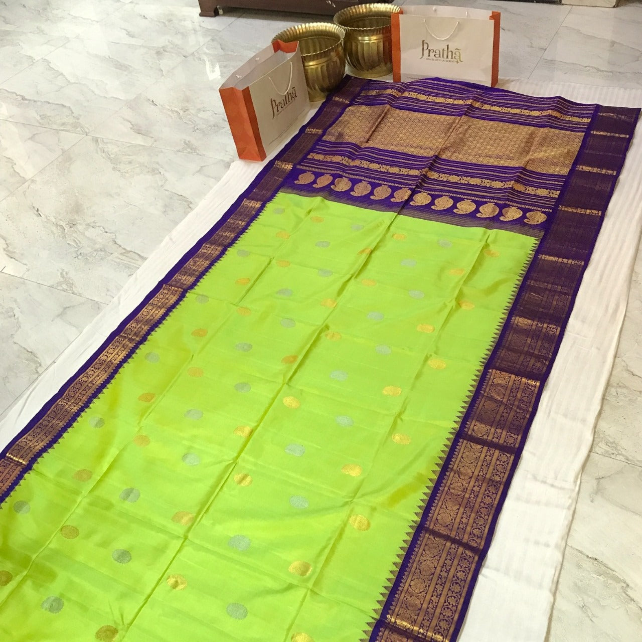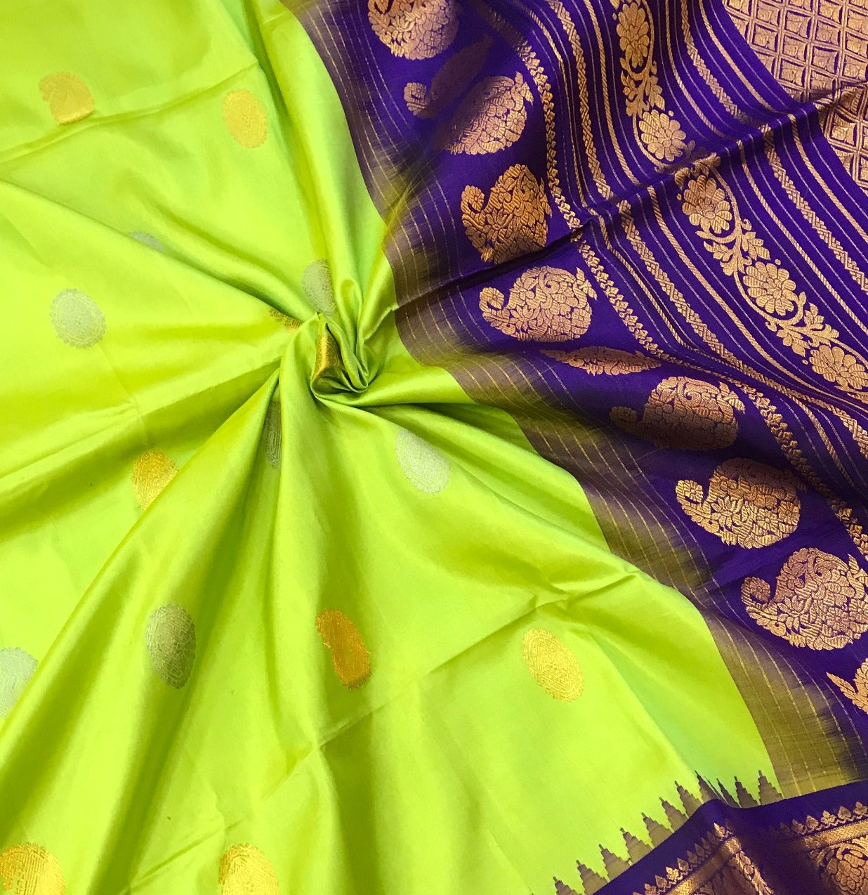 This fresh Parrot-Green Gadhwal with a traditional border is a unique saree. This Parrot-Green combination with the stunning Purple zari border and pallu makes this saree class apart! The alternate silver and gold Koyari butti design of this saree is equally outstanding and different with woven golden-silver zari thread look festive and grand.