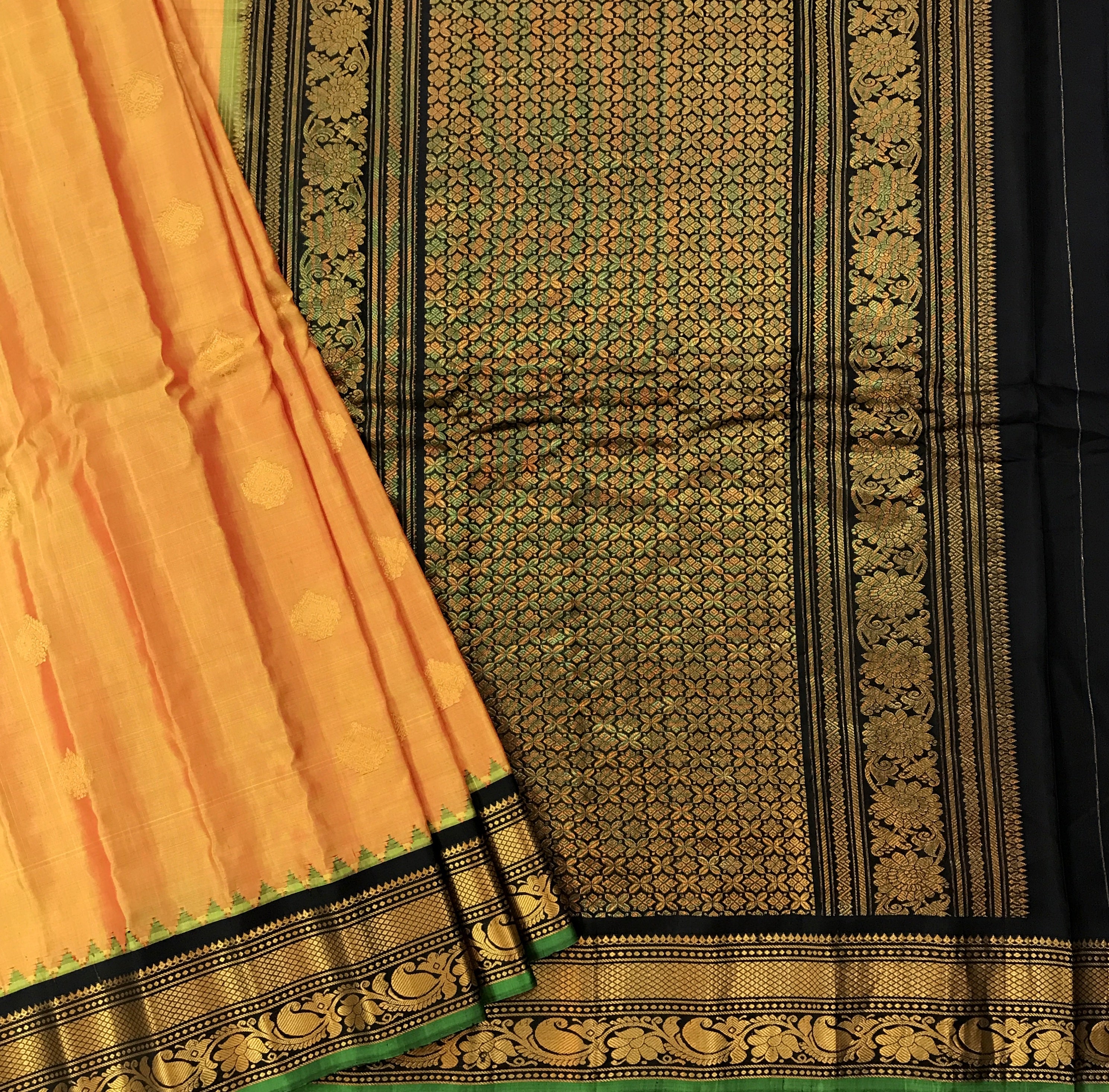 The soothing shade of mango-yellow and black combination wins hearts across traditions and cultures! This beautiful Gadhwal, the 'floral' design intricate butti and the black golden zari border with an elaborate temple design make this weave a charmer! The intricately woven pallu adds to the beauty of this saree!