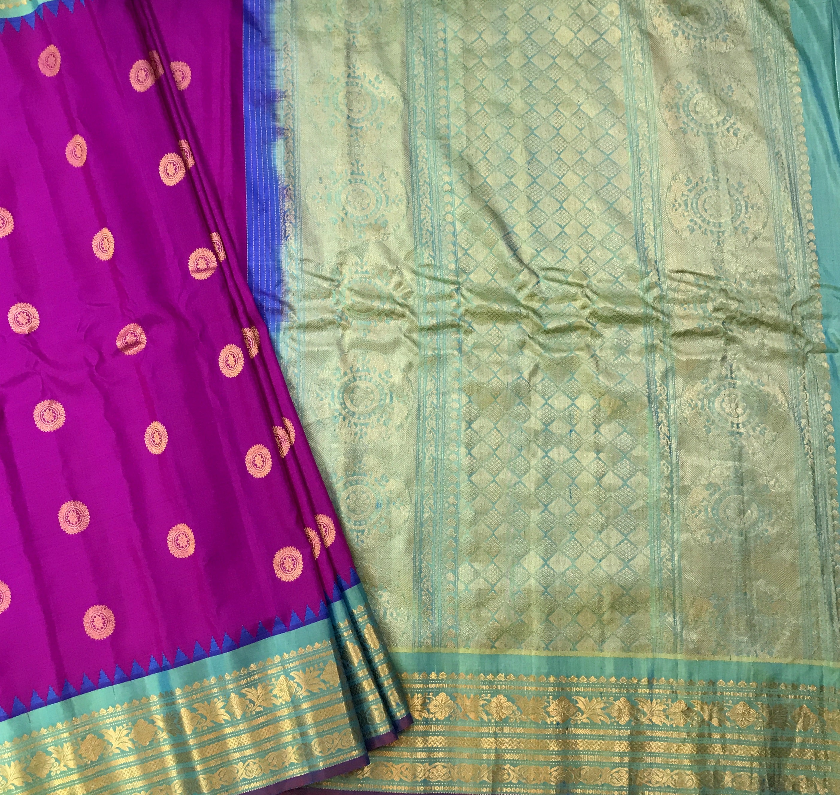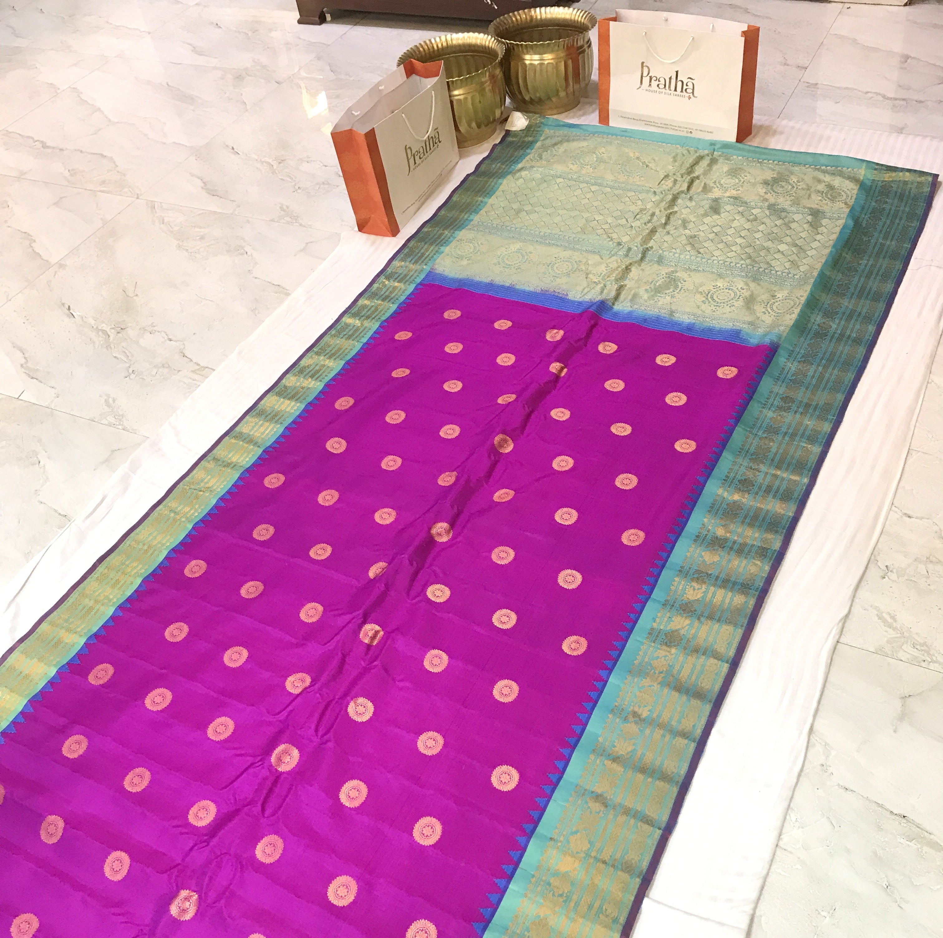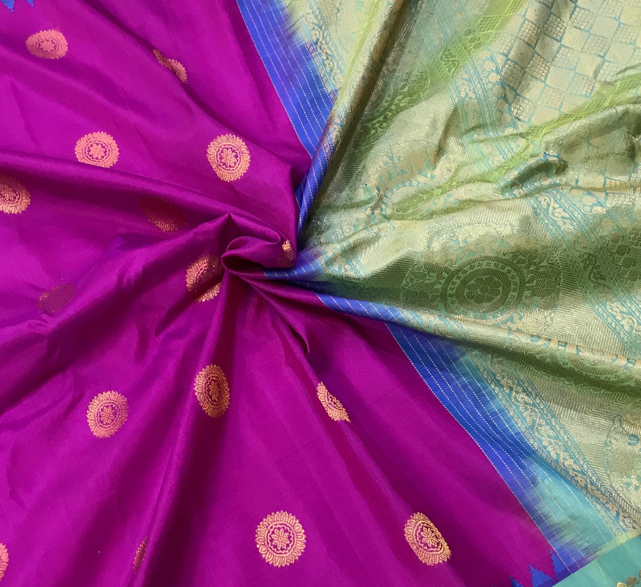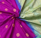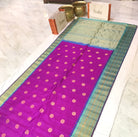 This is a gorgeous and unusual combination and a unique one too! l Magenta with a blue zari border and pallu. The traditional style woven border makes the blue stand beautifully against the magenta saree! The butti design of this saree is equally beautiful in forms of big circle shape with contrast blue golden zari pallu . For those who are on the lookout for something unique, this one is just for you!