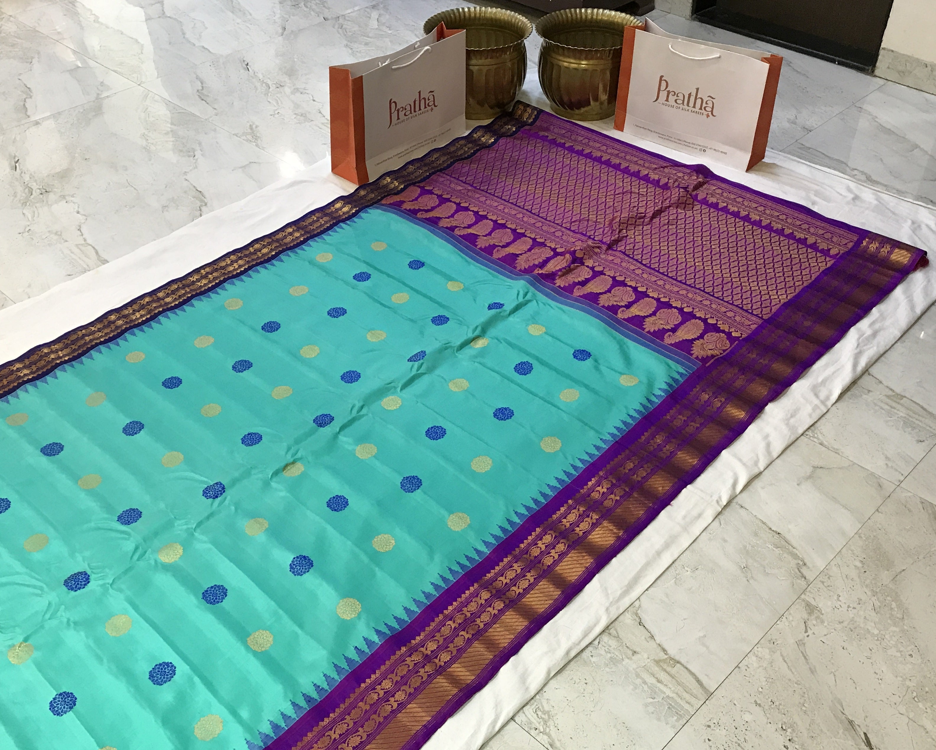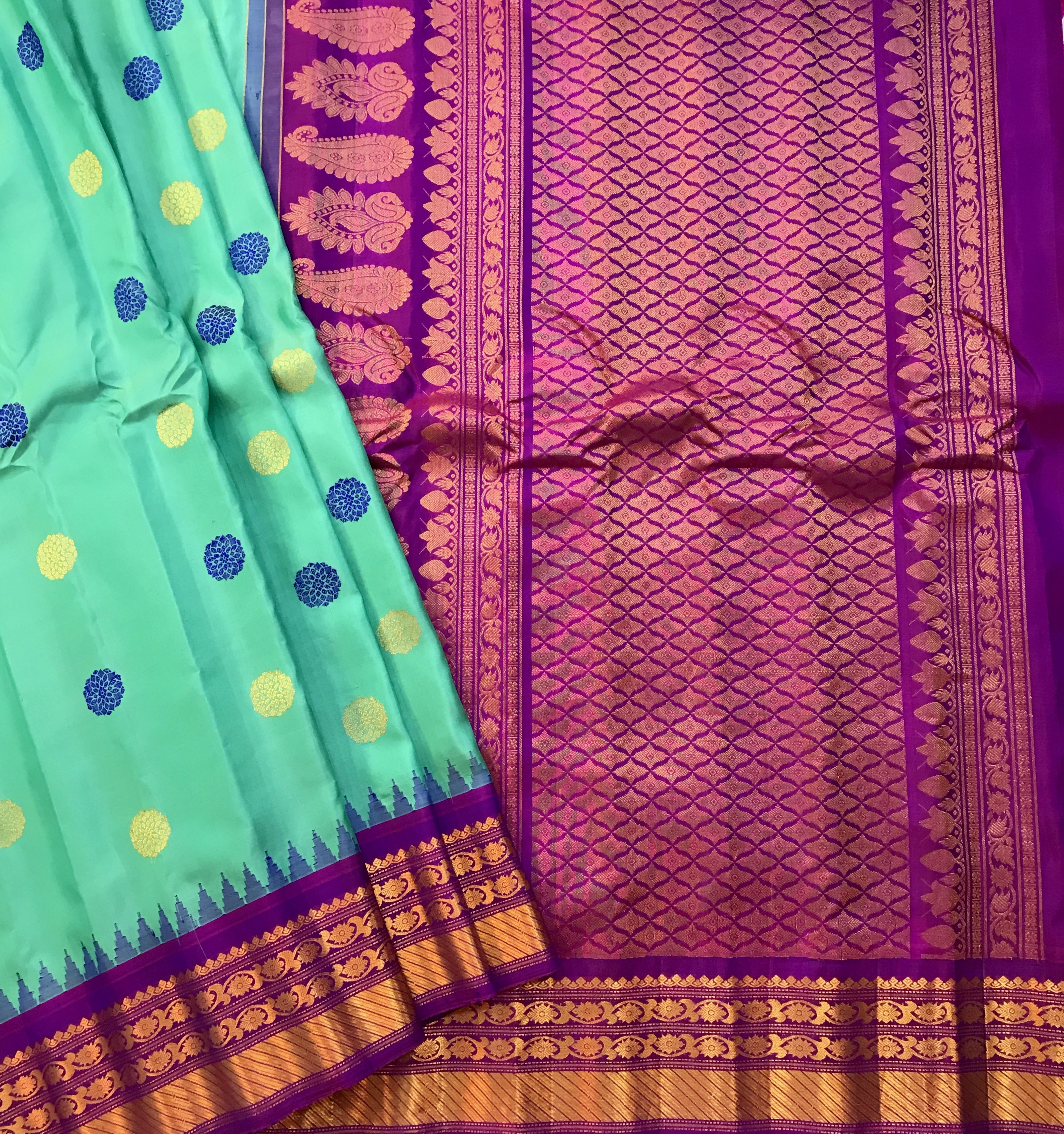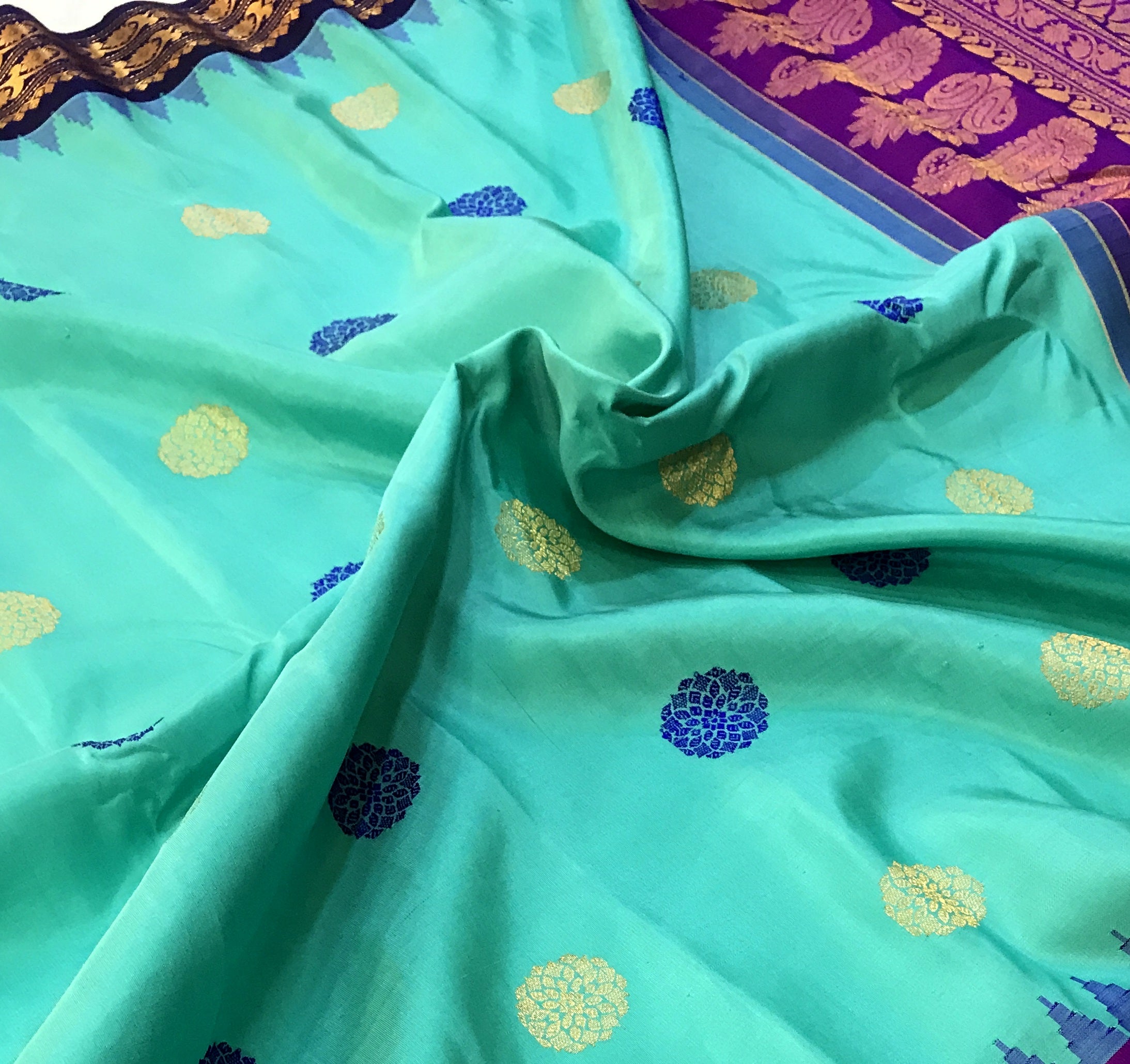 This is an incredible shade of aqua green-golden Gadhwal with pinkish purple temple design golden zari border. This saree is truly a masterpiece by the weavers! This saree has uncommon shaped butti gives a incredible weave. This pure handloom Gadhwal with golden zari pallu. Do not miss thatm this saree has 'Ganga-Jamuna' border ( on top black coloured and on bottom purple coloured ) add beauty to thhis soothing weave! If your are person for unique colour combination, this one should be your pick!
