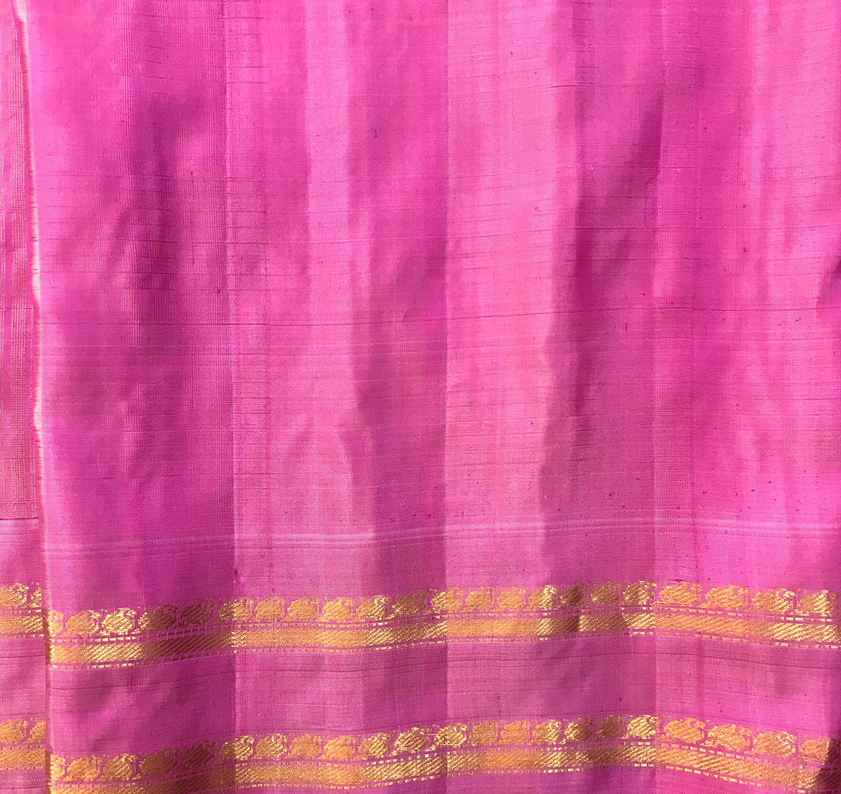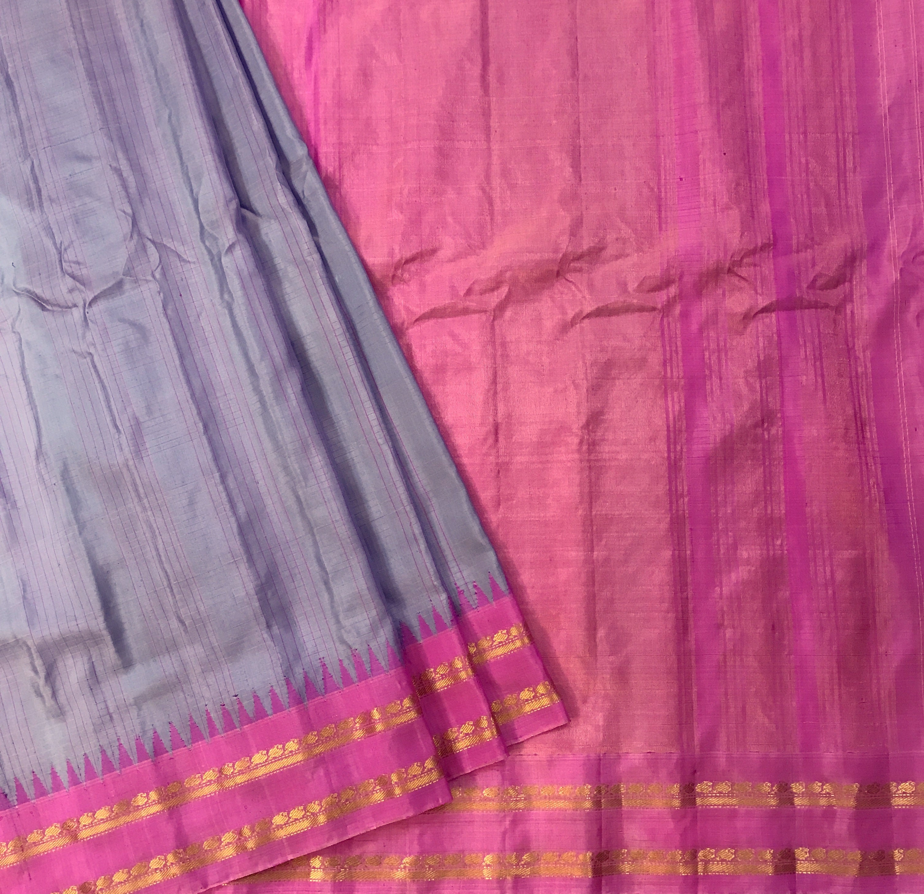 This is an incredible light lavenderish color with grey ting Gadhwal with pink golden zari border. This saree has a vertical lines design without any typical butti that is very attractive. The dainty golden zari design weaving at its border and pallu add a charm to this otherwise subtal Gadhwal weave.