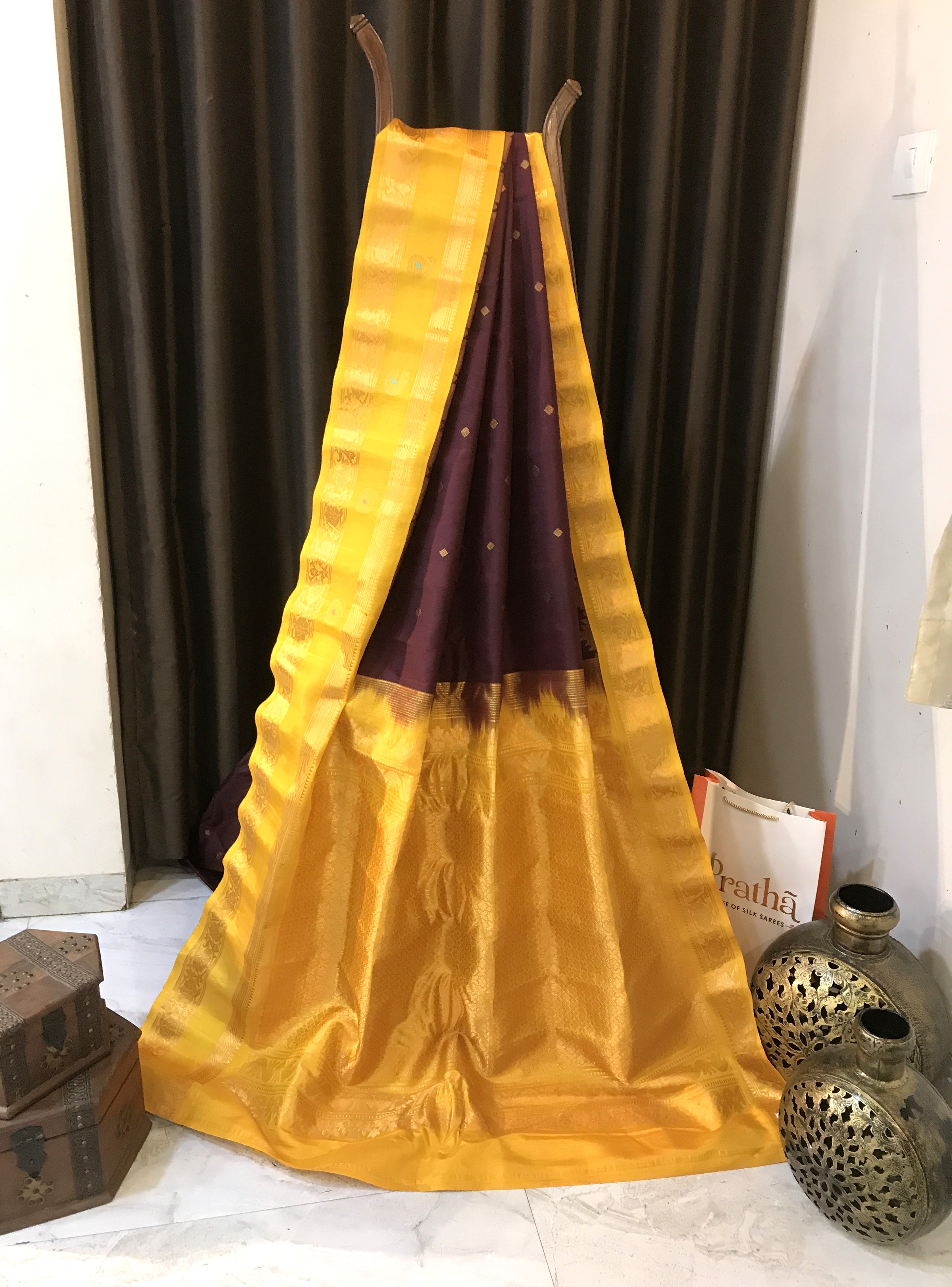 A classic Gadhwal creation, this saree features a delightful blend of colors that is always appealing. The vibrant, fresh shade of brown beautifully with the yellow, creating a stunning visual effect. Made of silk, it drapes elegantly and flows gracefully. The saree boasts a intricate design temple border, complemented by intricate floral butti and a zari pallu, enhancing its overall charm and adding to the serene elegance of this exquisite weave.