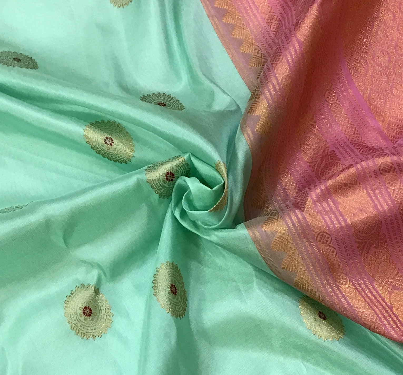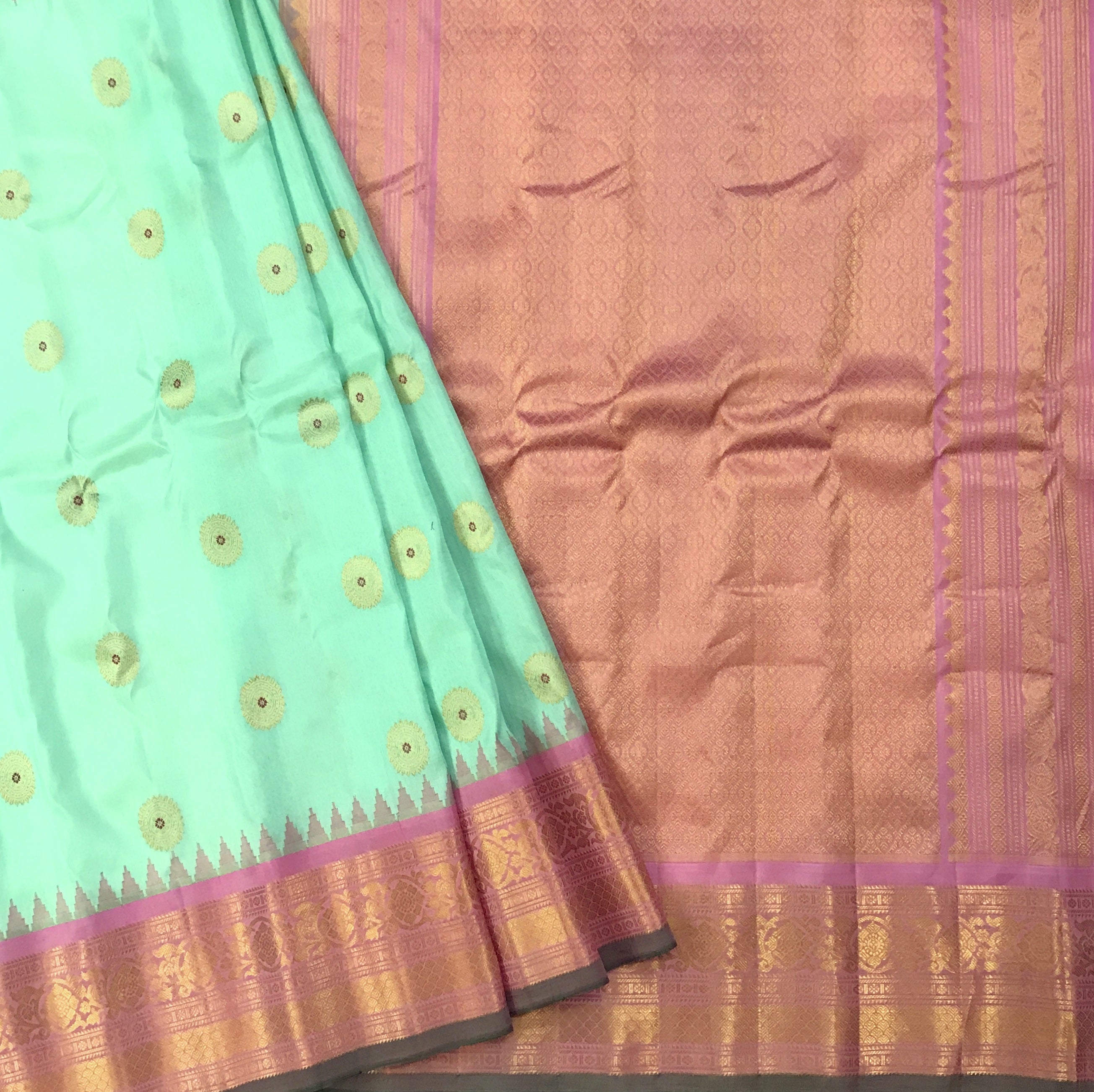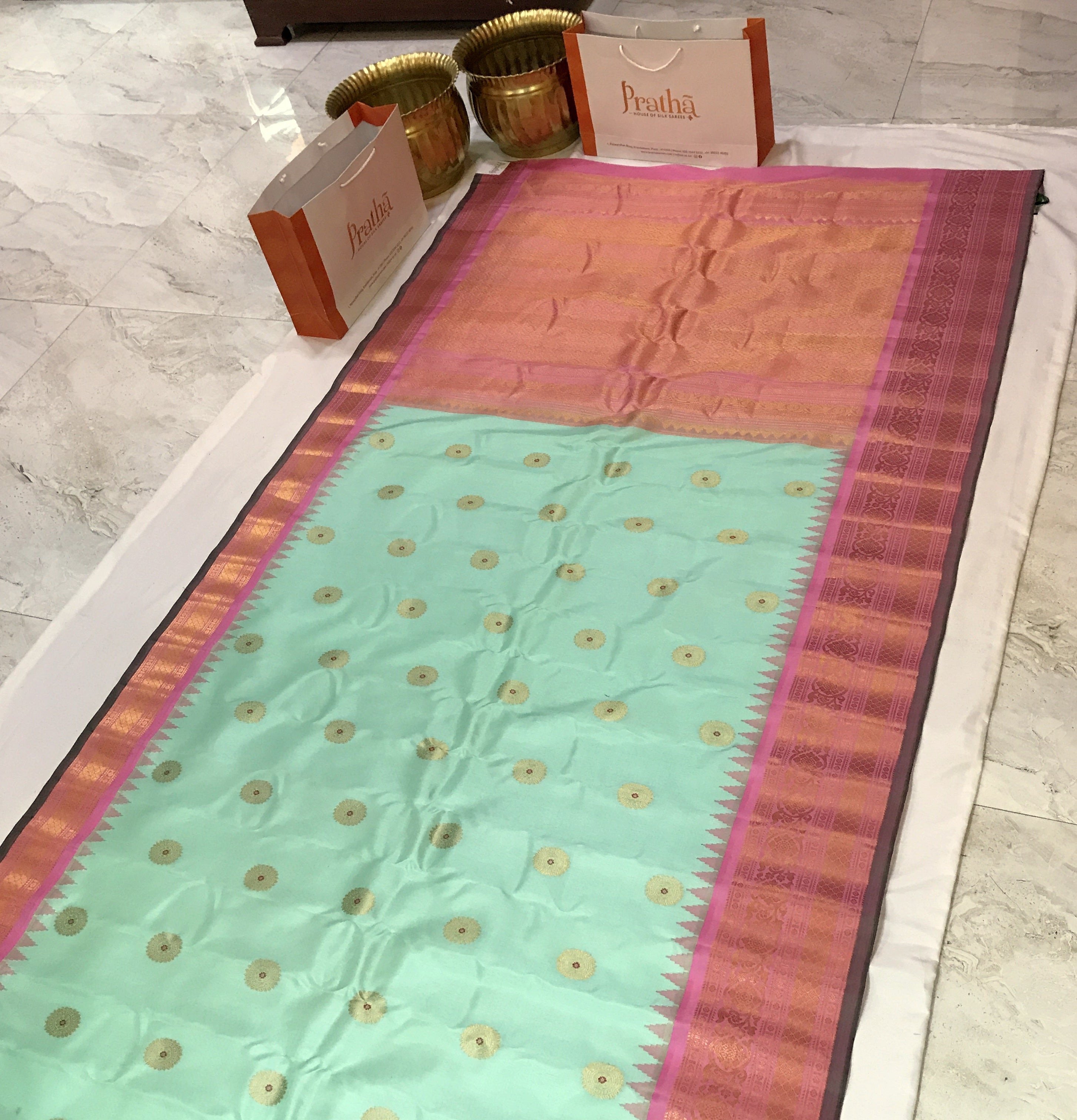 This is a gorgeous and unusual combination and a unique one too! Green with a peach zari border and pallu. The traditional style woven border makes the green stand beautifully against the pink saree! The butti design of this saree is equally beautiful in forms of big floral shape with contrast zari pallu . For those who are on the lookout for something unique, this one is just for you!