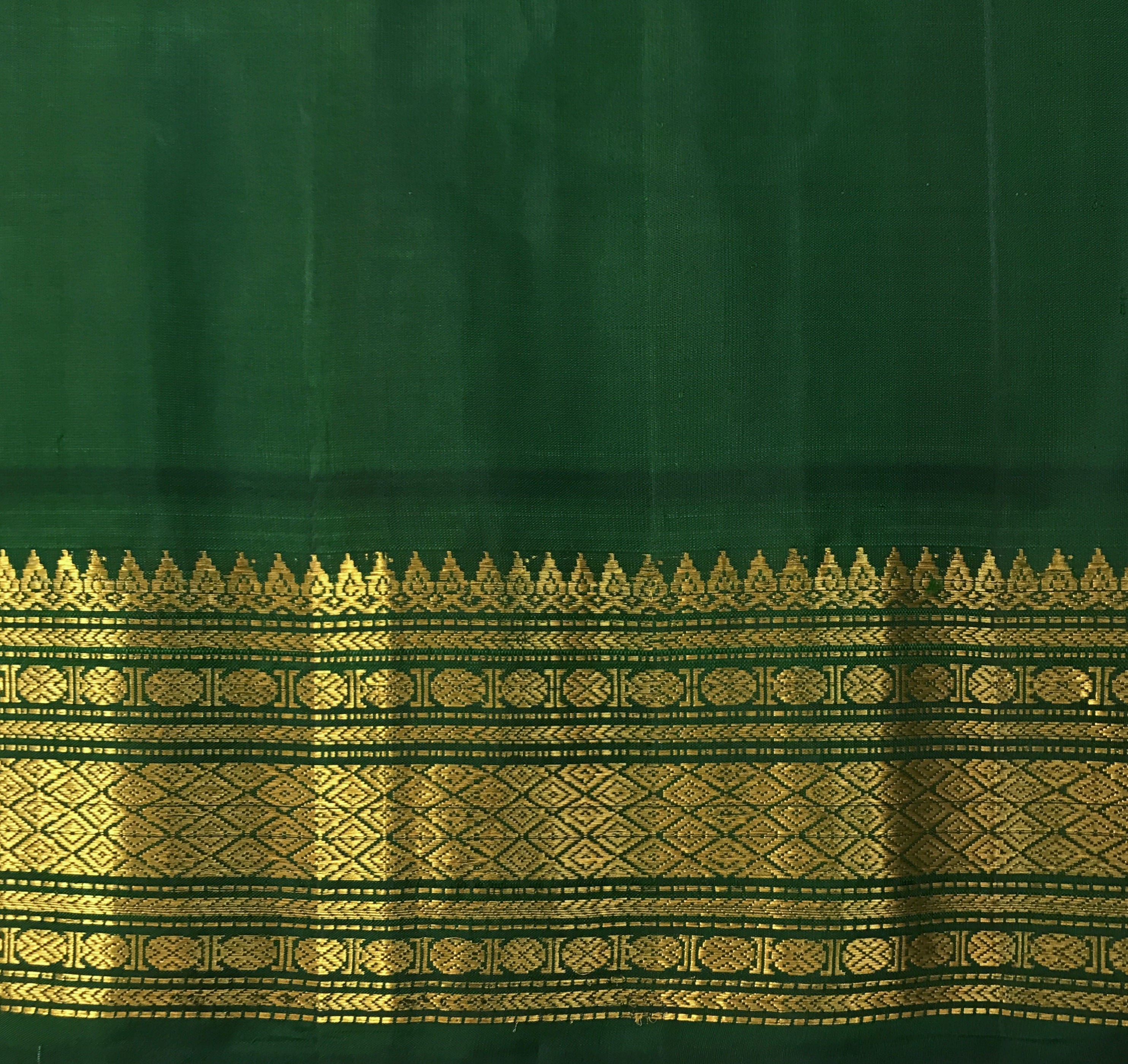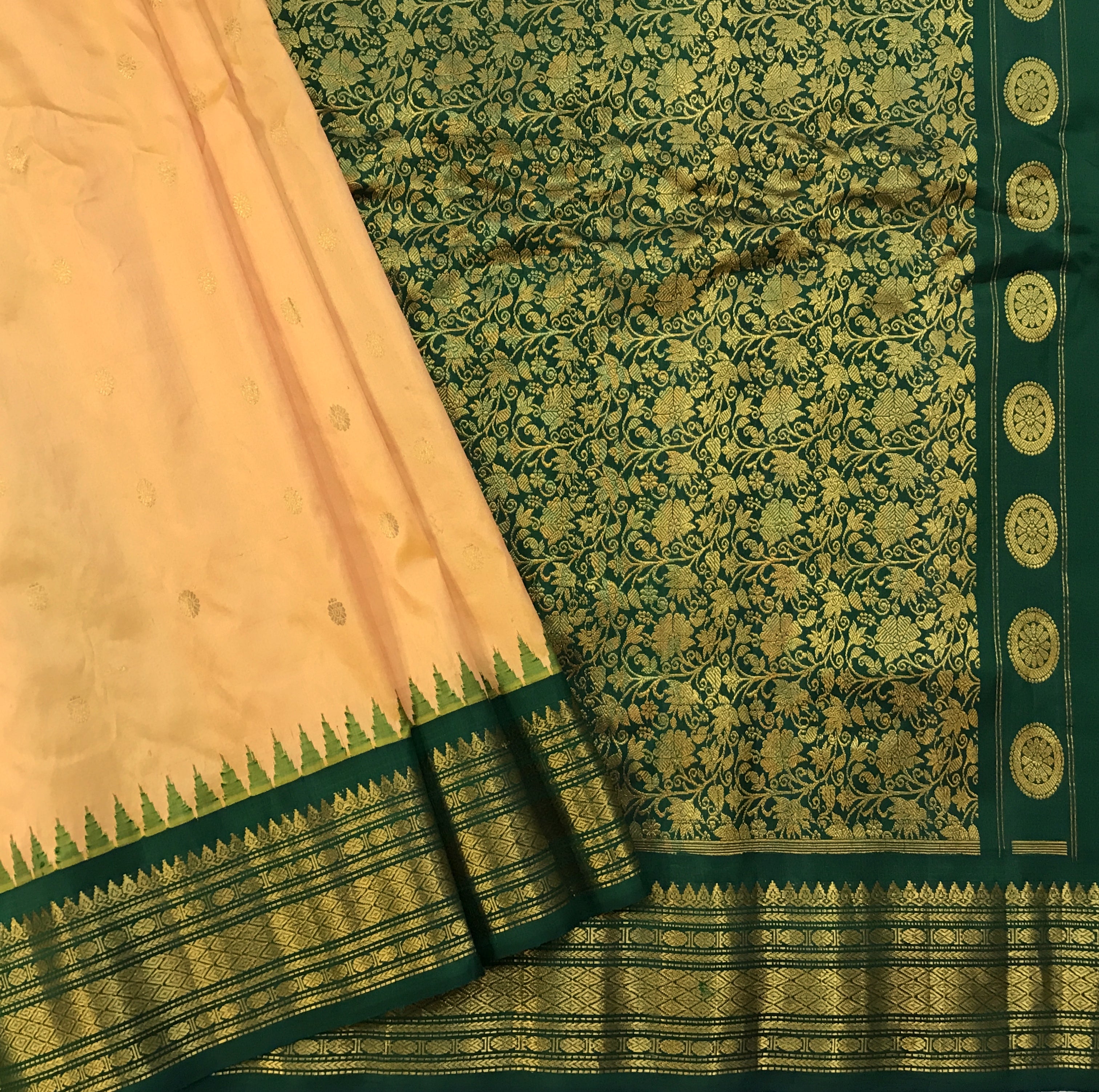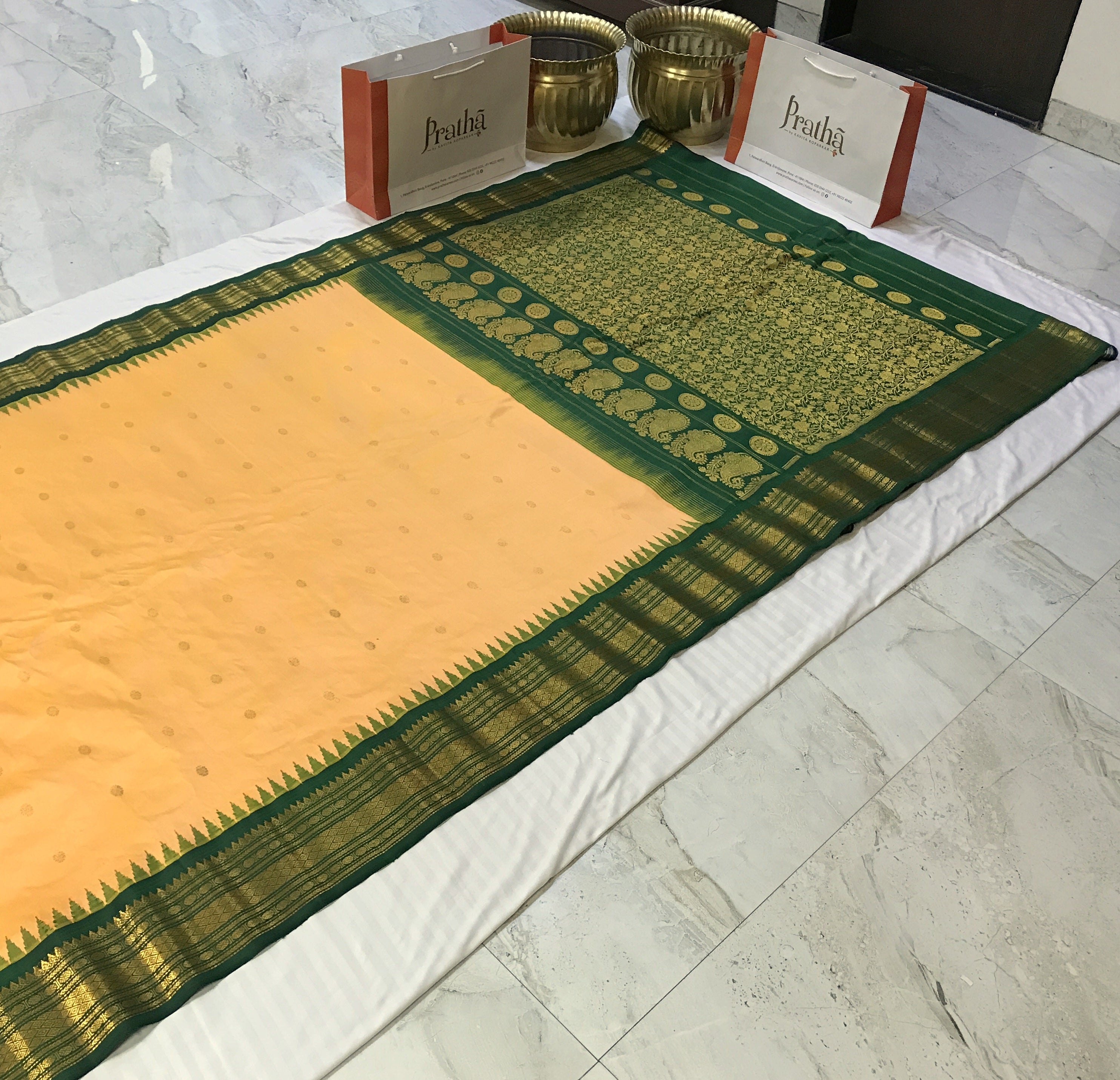 This saree is truly a masterpiece by the weavers! This is an incredible rotating shade of yellow-peach colour Gadhwal with very pretty green temple zari border. This saree has delicate golden floral butti gives a incredible weave. This pure handloom Gadhwal with zari pallu. The specialty of this saree is that it has a fantastic combination which gives this saree a unique grace!