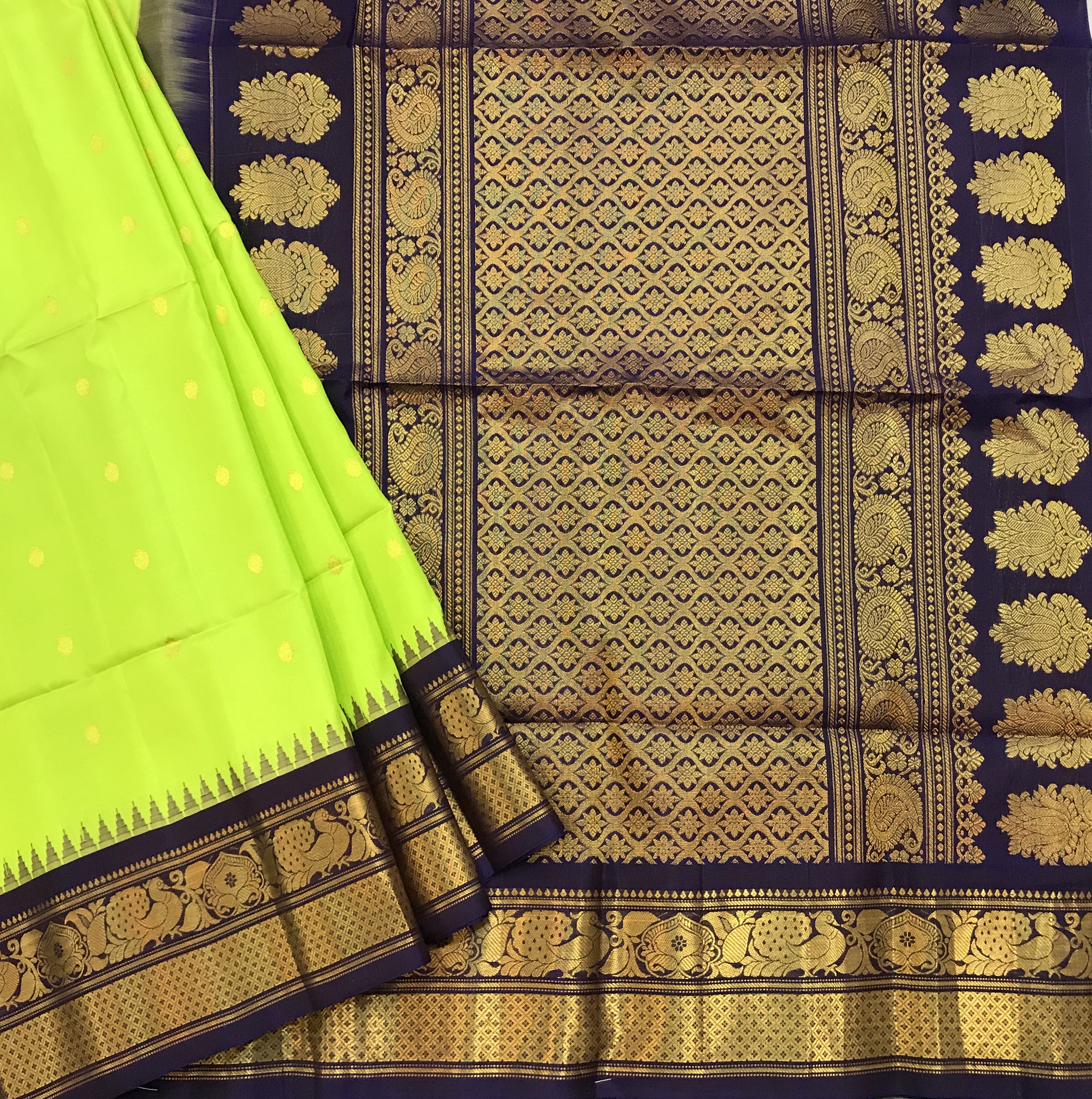 A very pretty shade of fresh green and fantastic magenta-wine temple border in pure silk Gadhwal looks beautiful in day light as well as night time. This one is special weave, the unique shaped small 'floral' butti evenly woven in golden zari thread through the saree give it festive touch. The contrast colour temple design golden zari border and the traditional pallu complement beautifully with this saree. This is the perfect choice for someone who is looking for traditional saree.