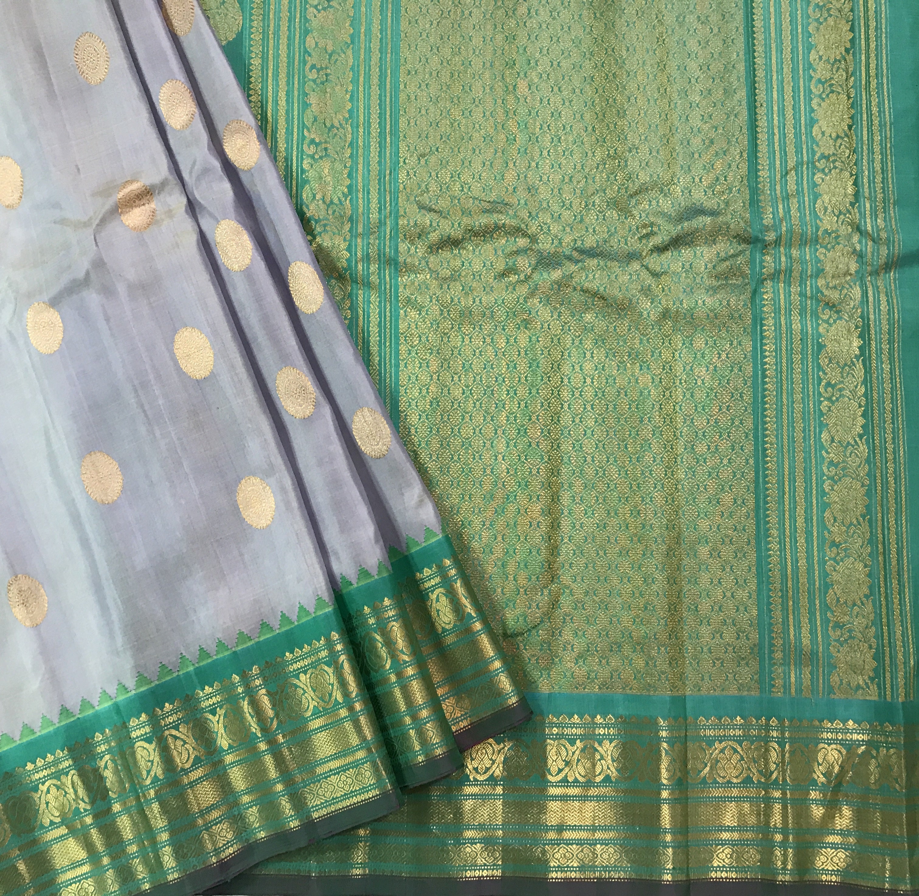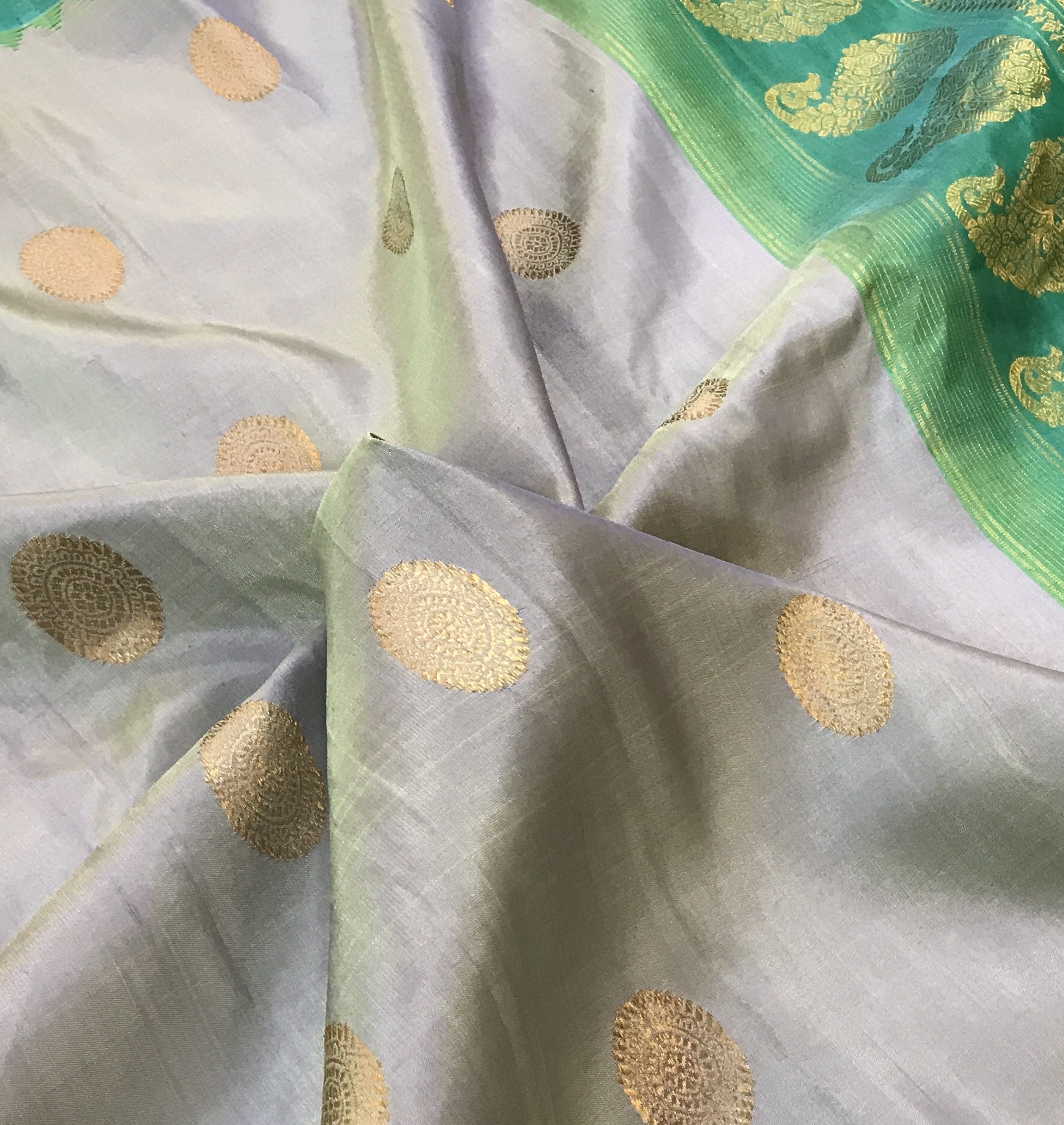 A light shade of grey and fantastic green border in pure silk Gadhwal looks beautiful in day light as well as night time. This one is special weave, the big shaped floral butta evenly woven in golden zari through the saree give it festive touch. The golden zari border and the traditional pallu complement beautifully with this saree. This is the perfect choice for someone who is looking for traditional saree.