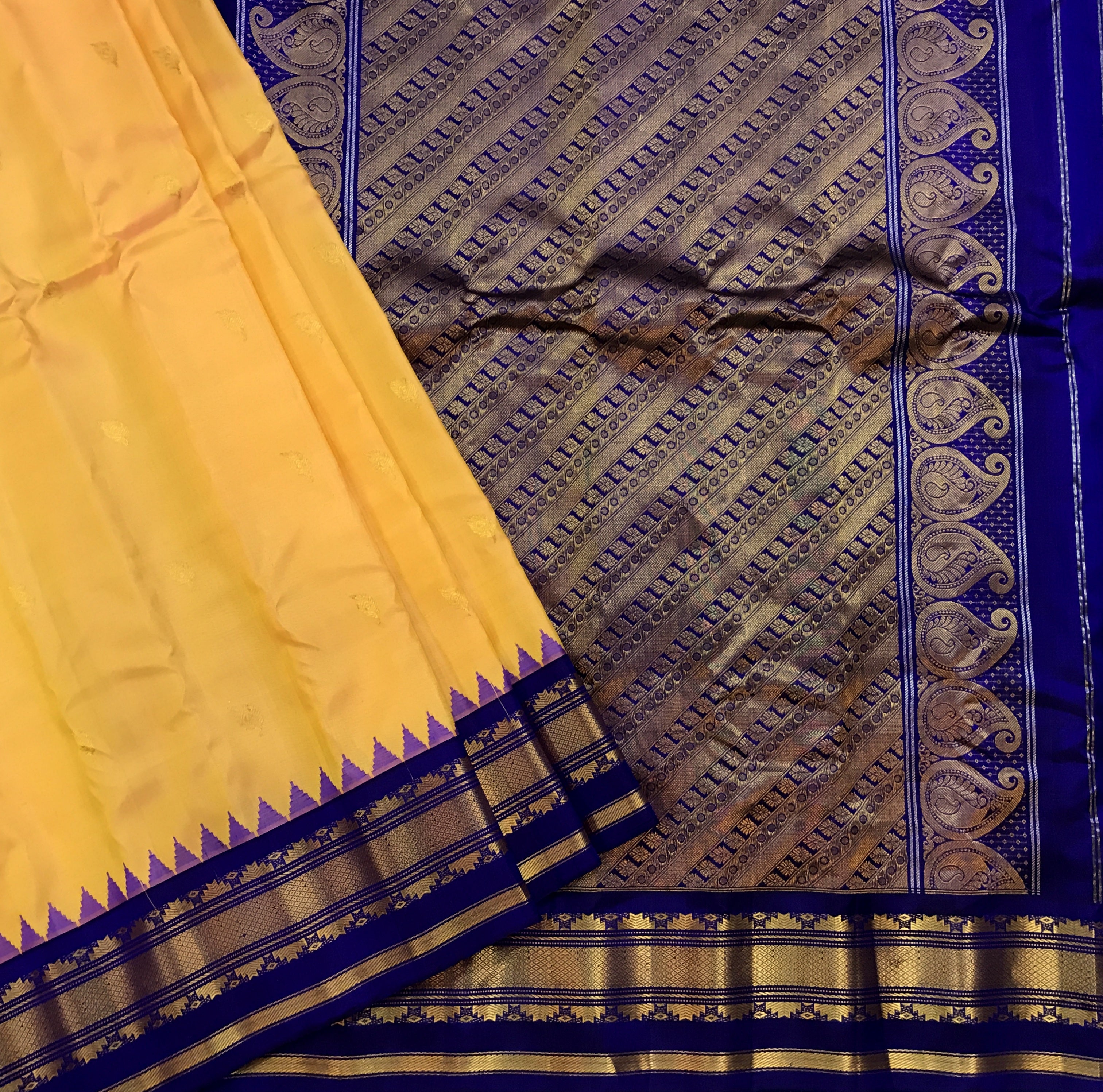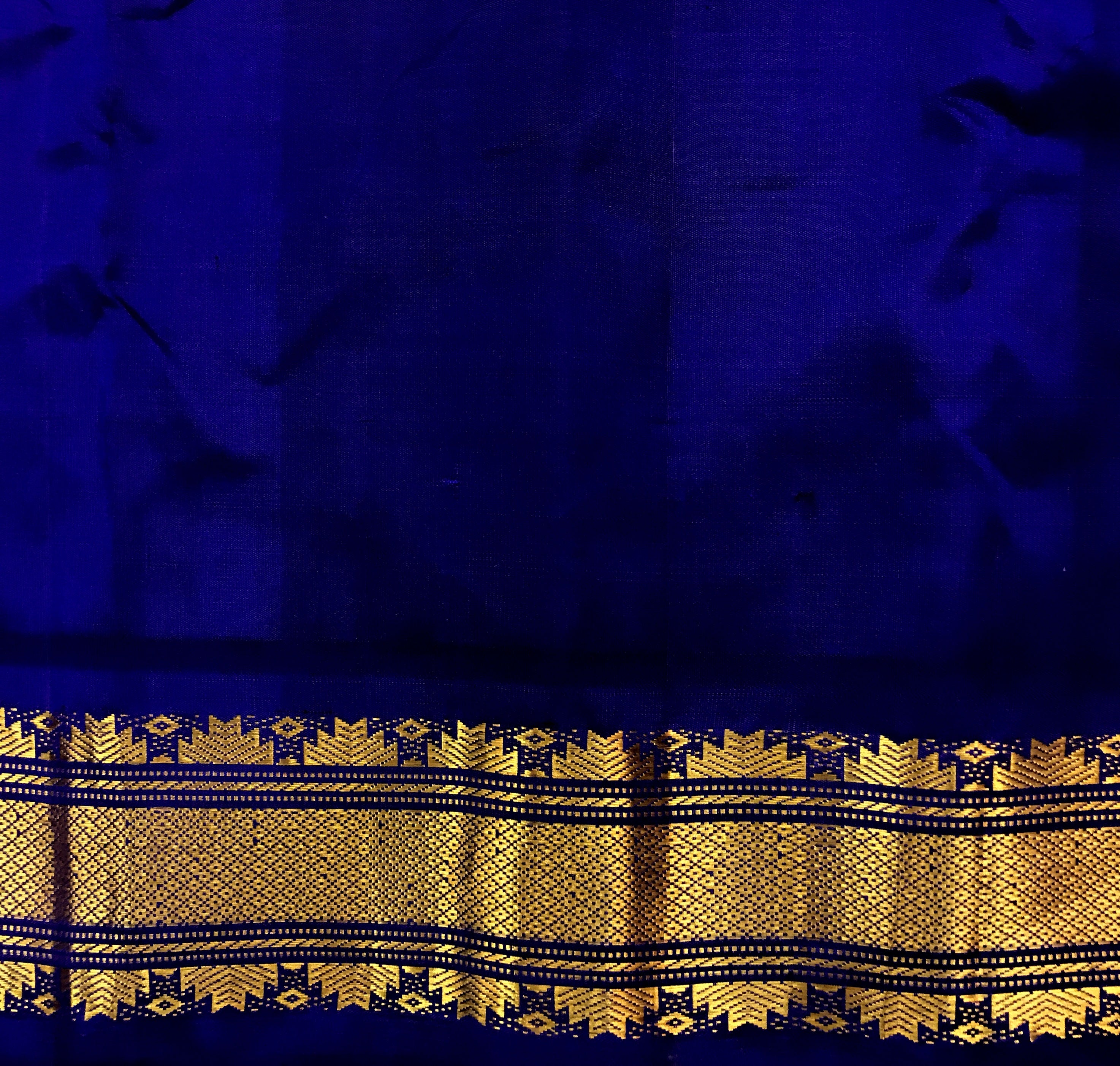 Blouse Colour: Contrast ( Blue with golden zari border )
