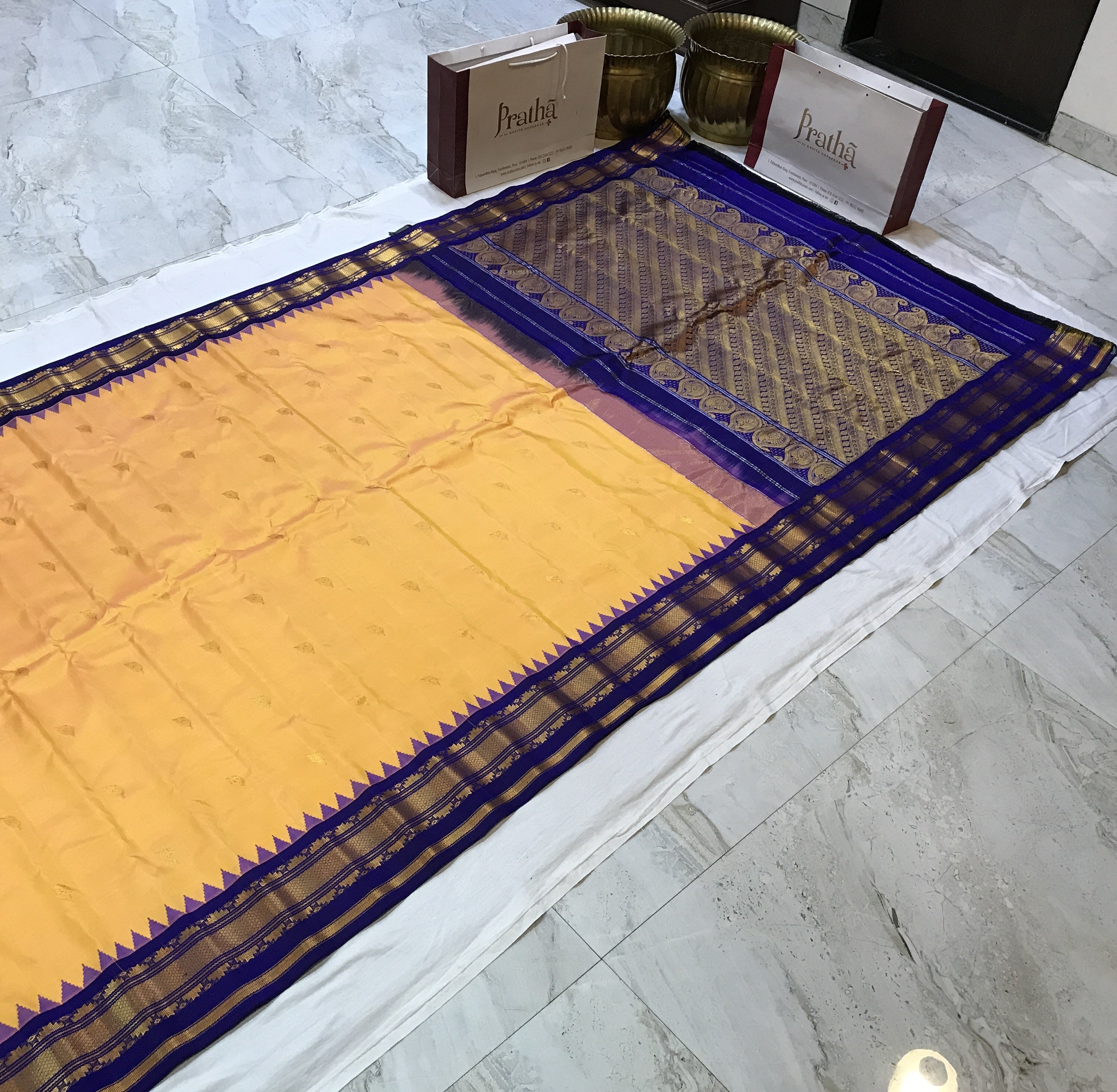 A fresh and gorgeous shade of peach with contrasting blue border with intricate design is a unique combination in traditional Gadhwal. This Gadhwal has uncommon 'peacock feather' golden zari butti all over the saree look great. The specialty of this saree is that it has a temple border and golden zari design pallu which gives this saree a unusual grace! This saree will look great on a bride or at traditional function. This is one of Pratha's favorite!