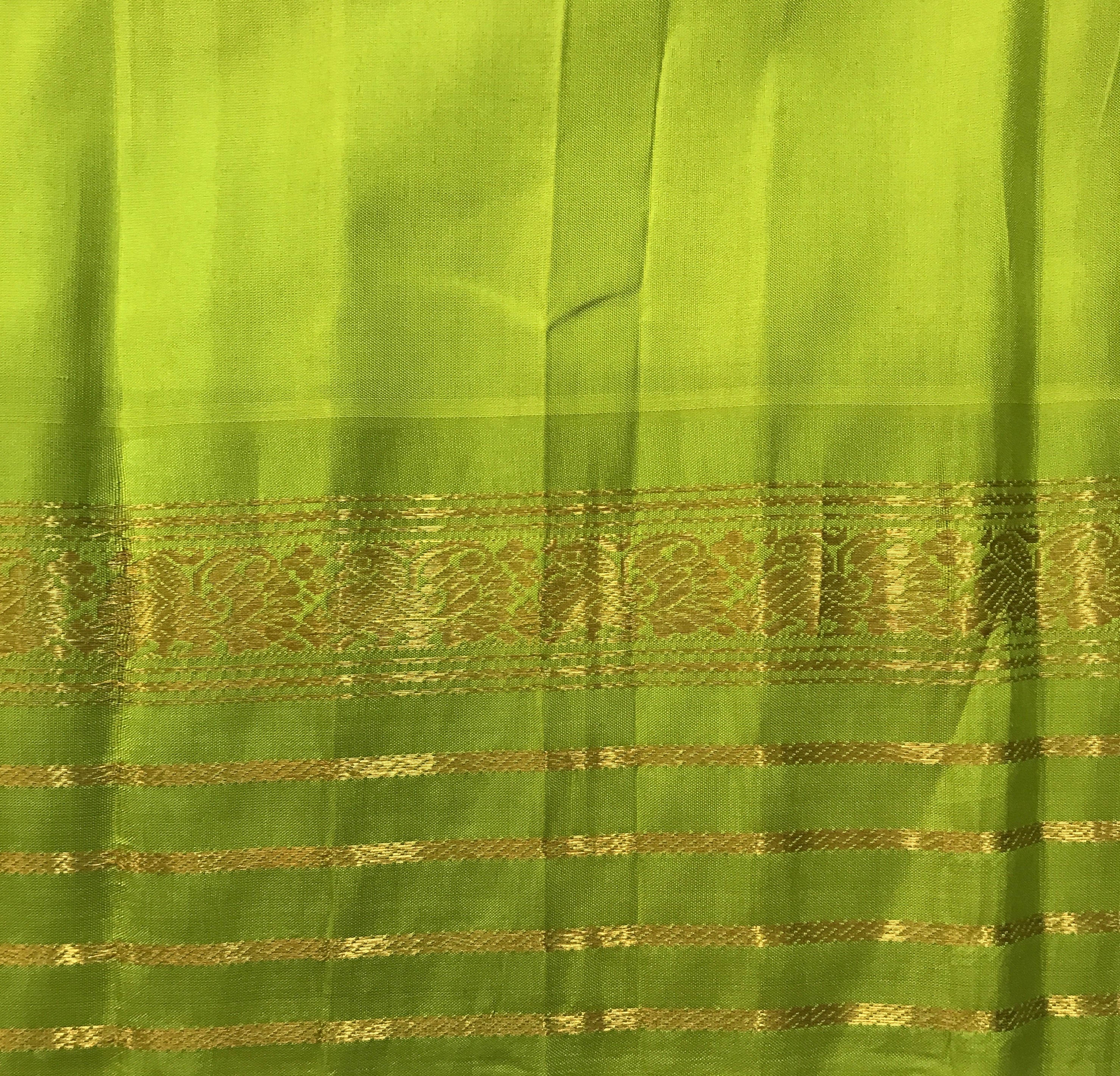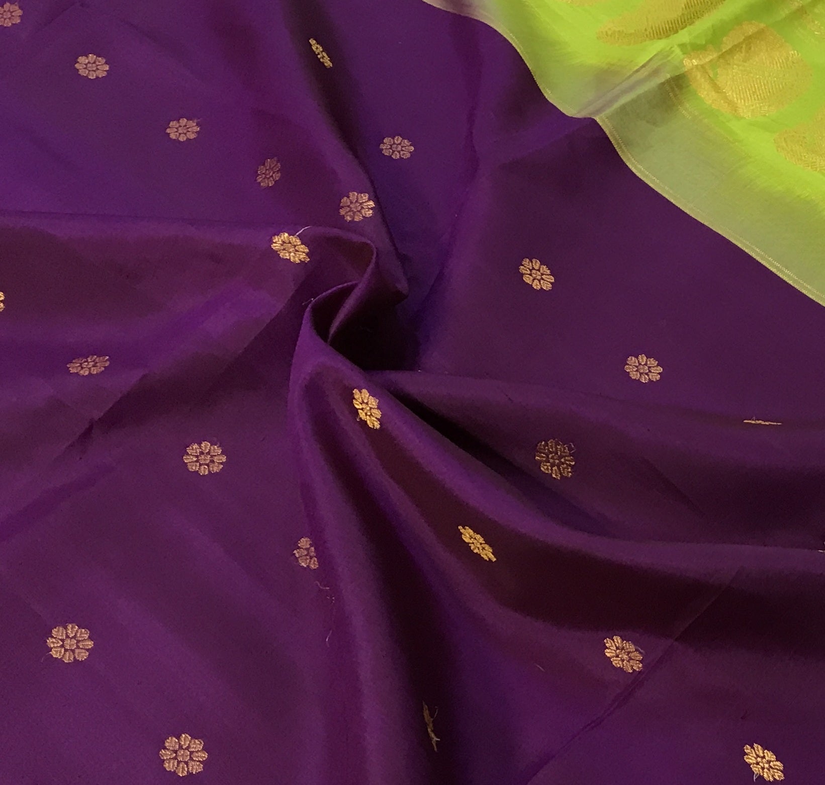 This is a gorgeous and unusual combination and a unique one too! Pinkish-purple with a green zari border and pallu. The traditional style woven border makes the green stand beautifully against the purple saree! The butti design of this saree is equally beautiful in forms of big circle floral with contrast golden zari pallu . For those who are on the lookout for something unique, this one is just for you!