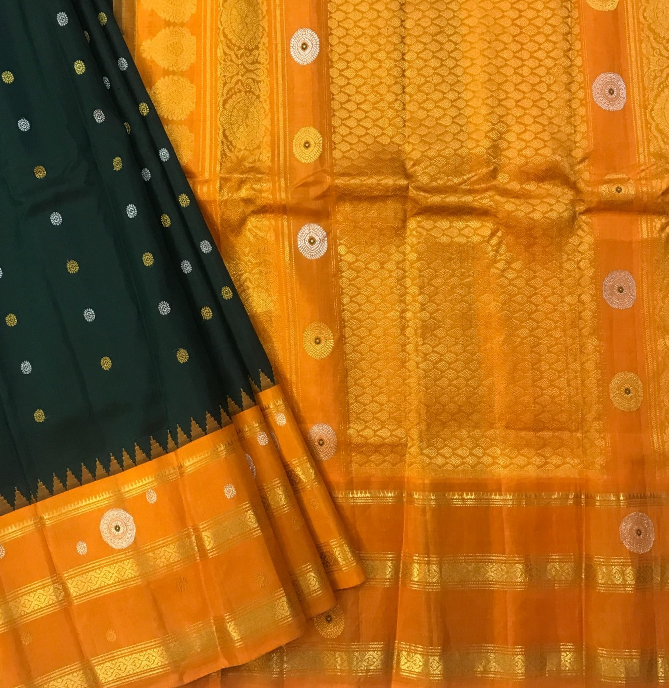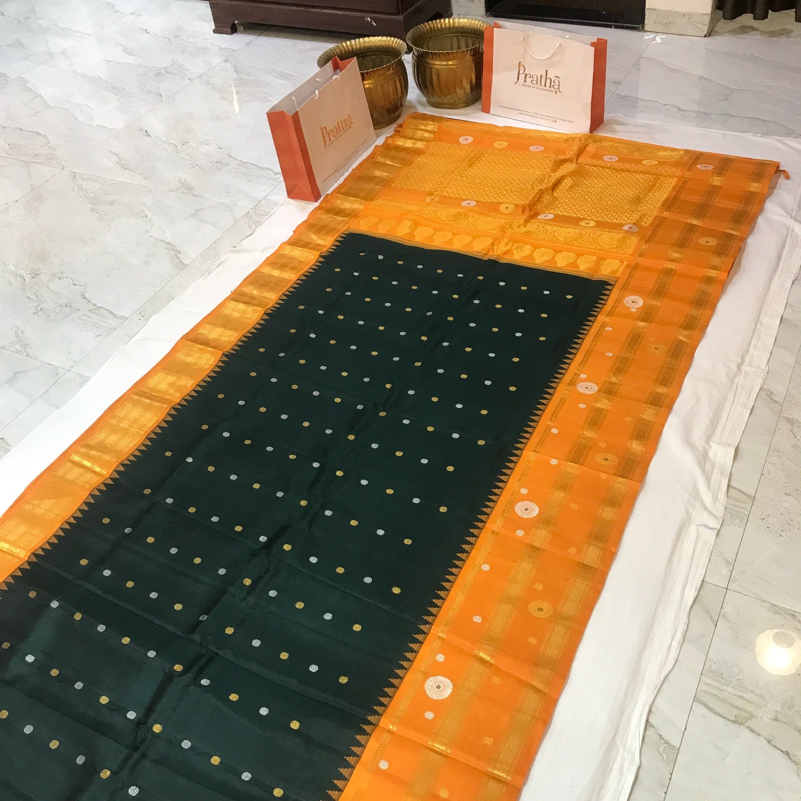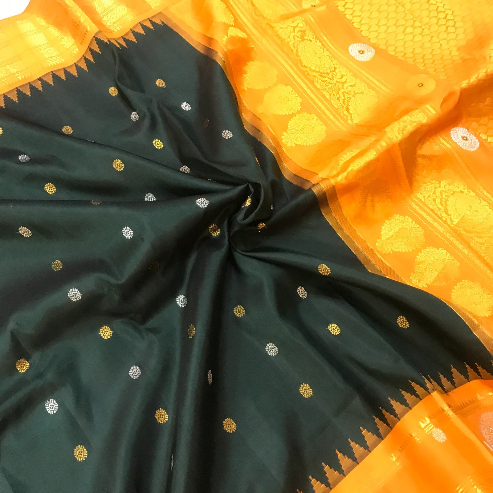 This Dark Green Gadhwal reflects the weaver's dedication and hard work. The intricate Floral butti woven in silver and golden zari looks stylish and gives this saree a vibrant and festive vibe The specialty of this saree is that it has a intricates floral design borders and also a very beautiful pallu look distinctive and complementing each other.