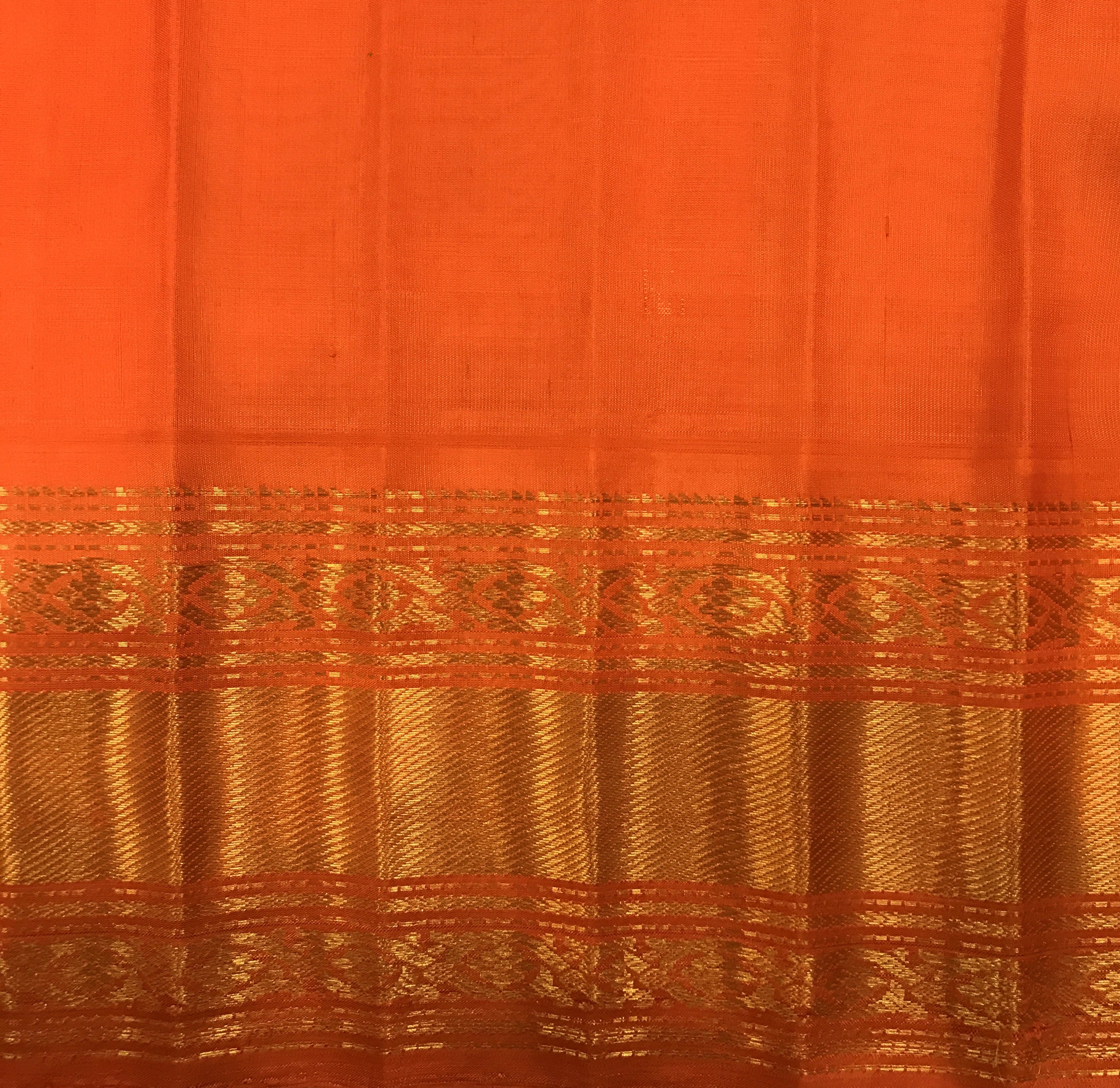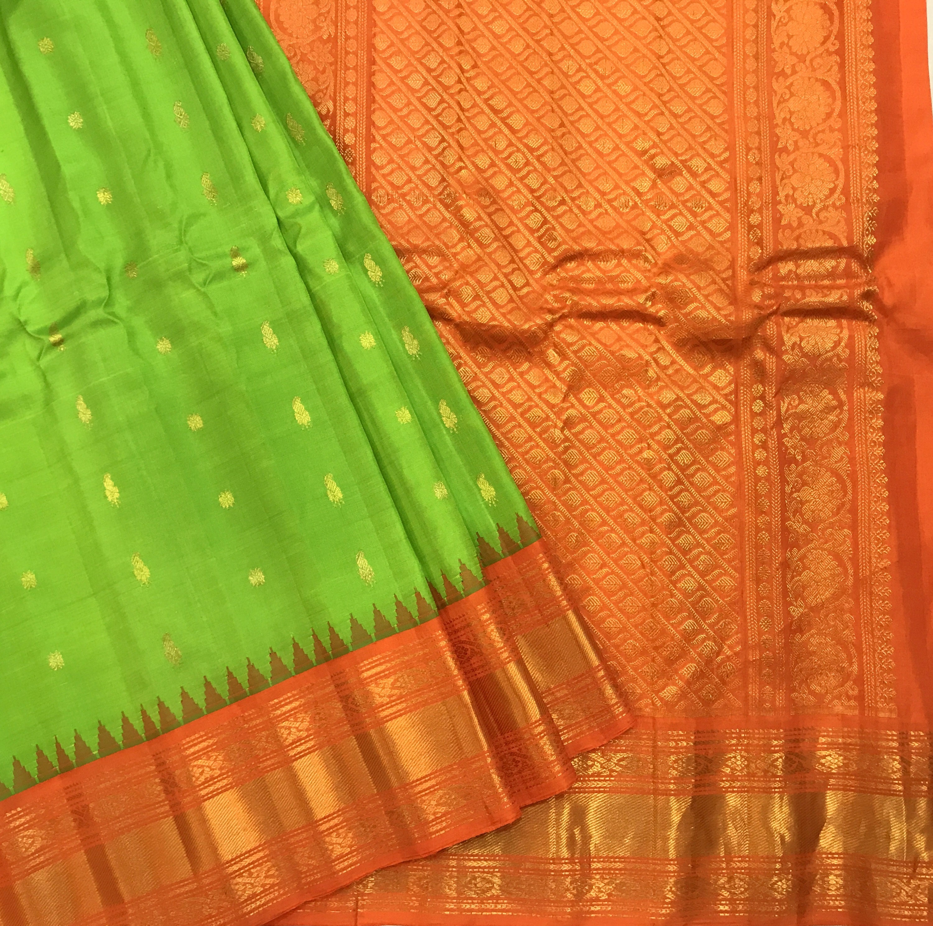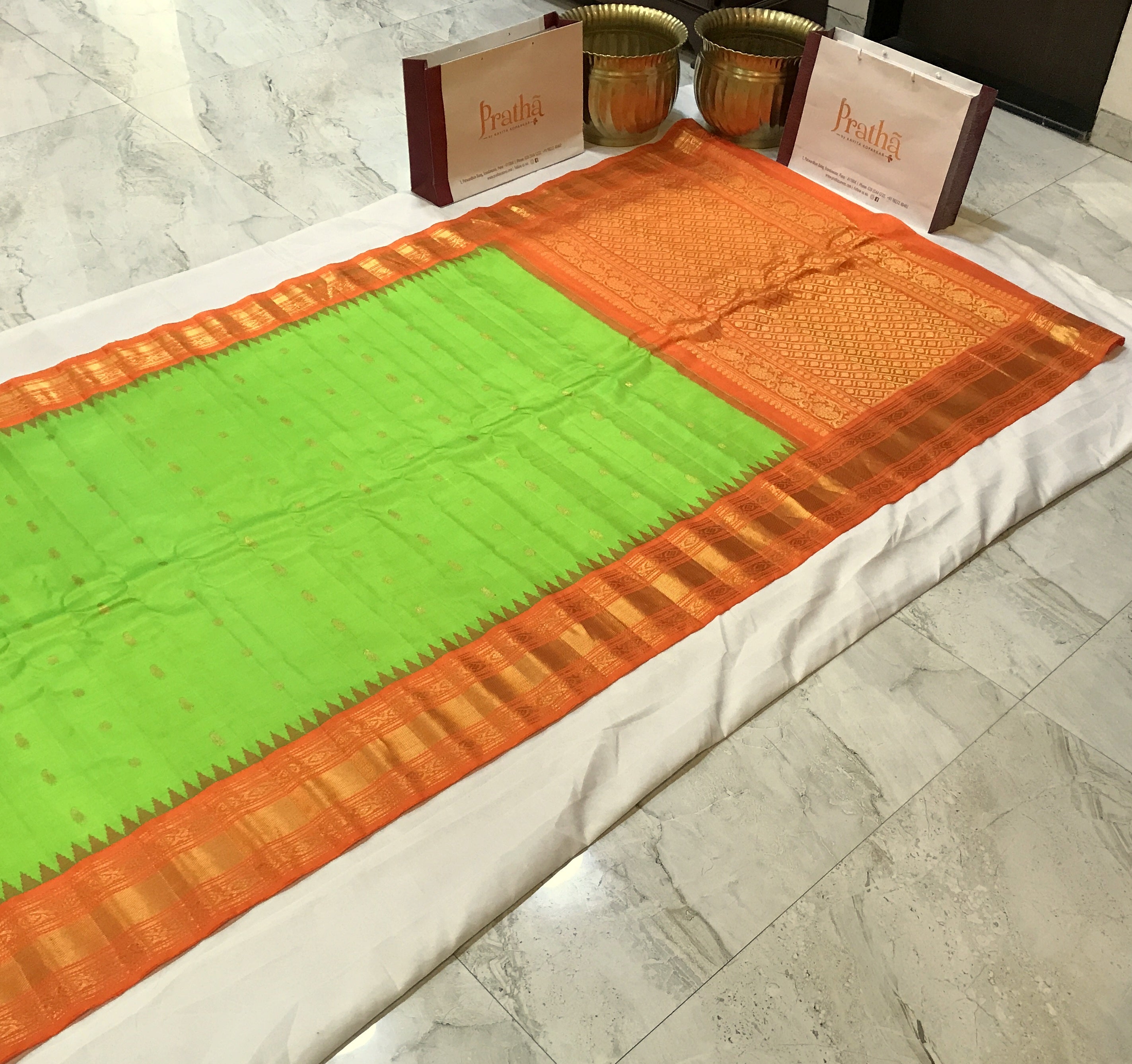 This soothing combination of a parrot-green body and a orange border with golden zari pallu makes this saree refreshing and popular. The dainty golden zari weaving at its border add a charm to this otherwise subtle Gadhwal weave. Do not miss the delicate golden zari koyari and floral butti that add beauty to this soothing weave.