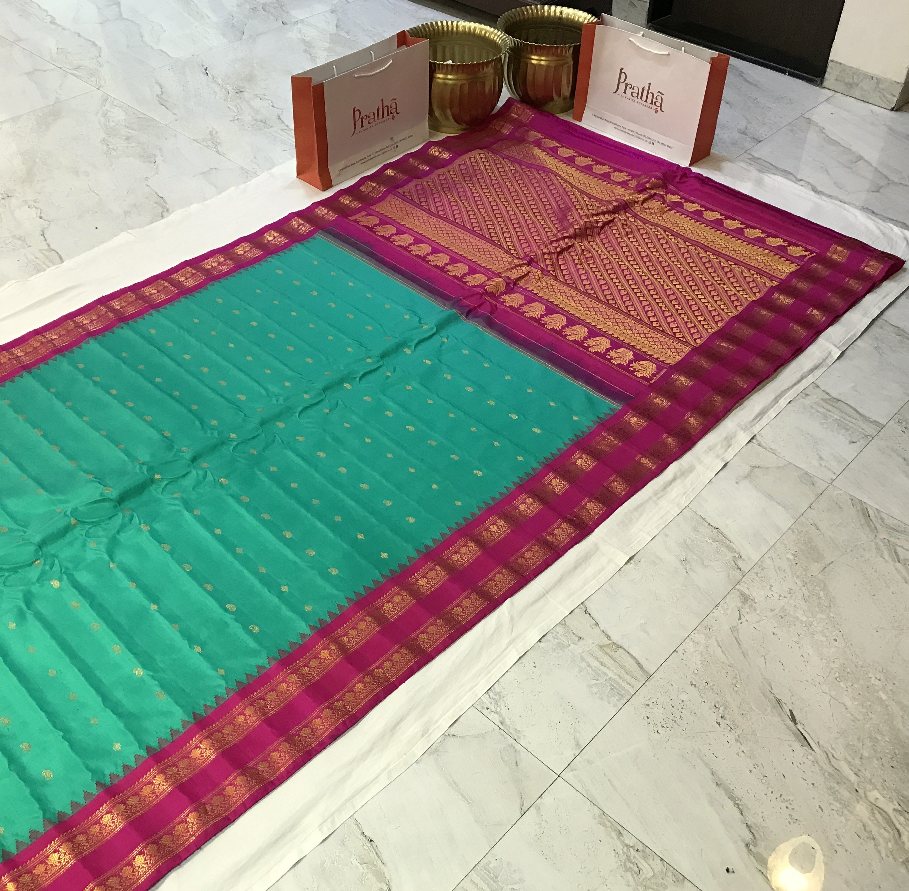 A fresh shade of green and fantastic pink border in pure silk Gadhwal looks beautiful in day light as well as night time. This one is special weave, the delicate butti evenly woven in golden zari thread through the saree give it festive touch. The pink colour golden zari border and the traditional pallu complement beautifully with this saree. This is the perfect choice for someone who is looking for traditional saree.