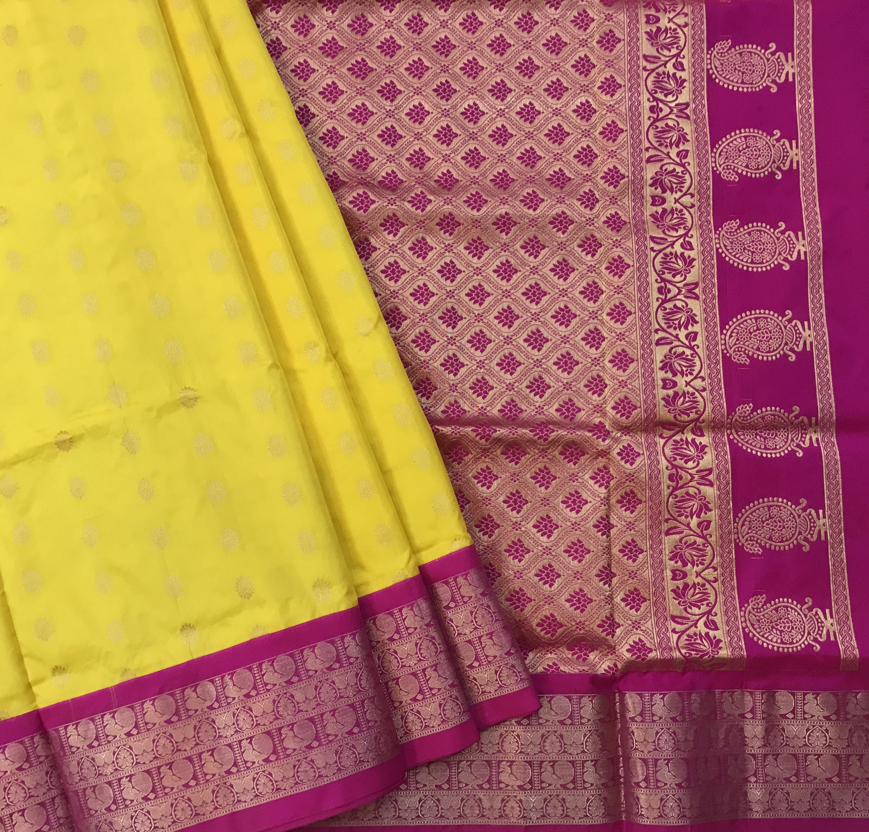 A combination which is as fresh as it can get! A very pretty shade of yellow and pink border with golden motives of peacock and flower leaves,Gadhwal in these beautiful colours is a keepsake. The delicate golden zari butti extremely with zari pallu looks outstanding. This stunning combination makes this weave a perfect wedding wear.