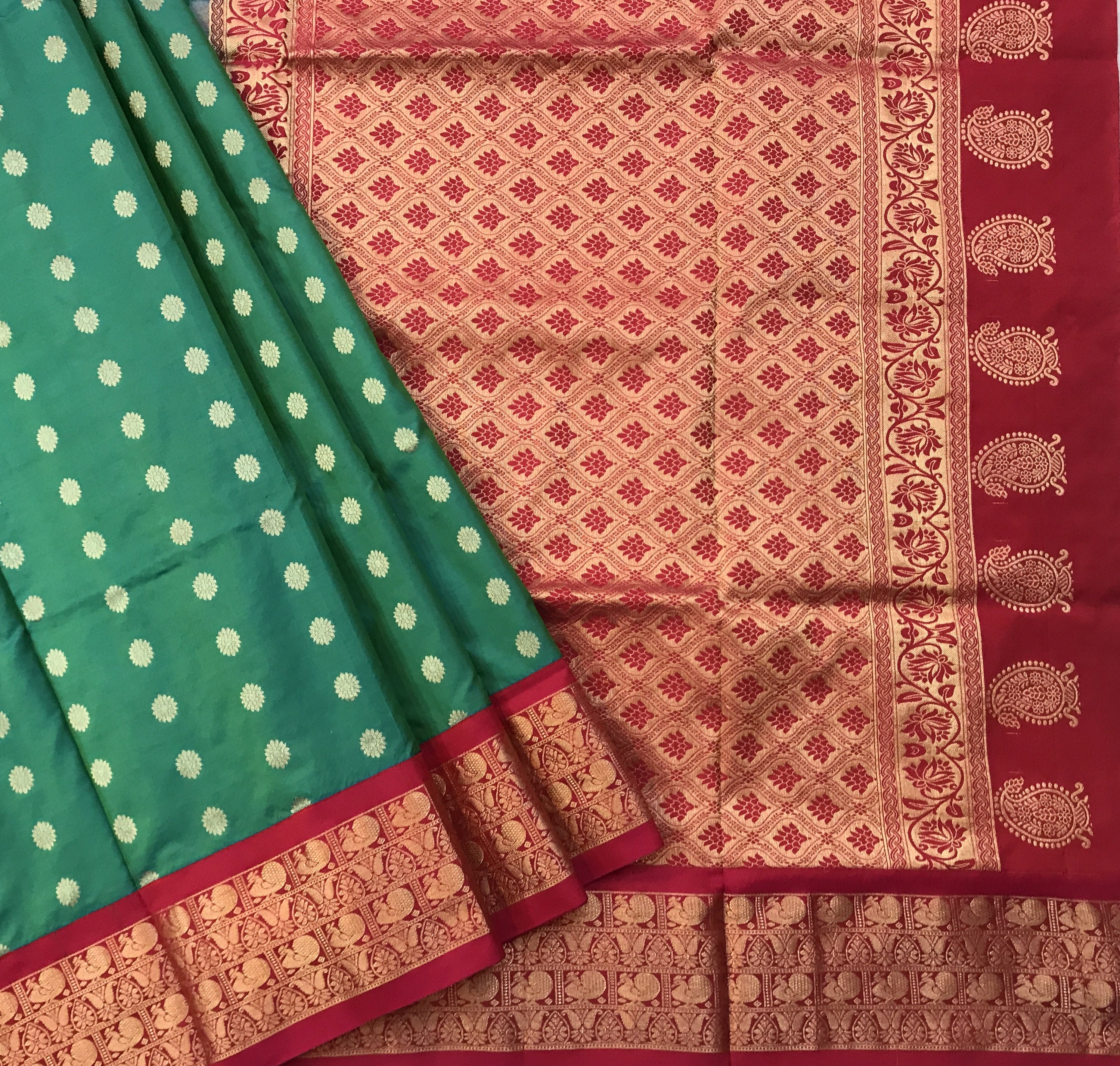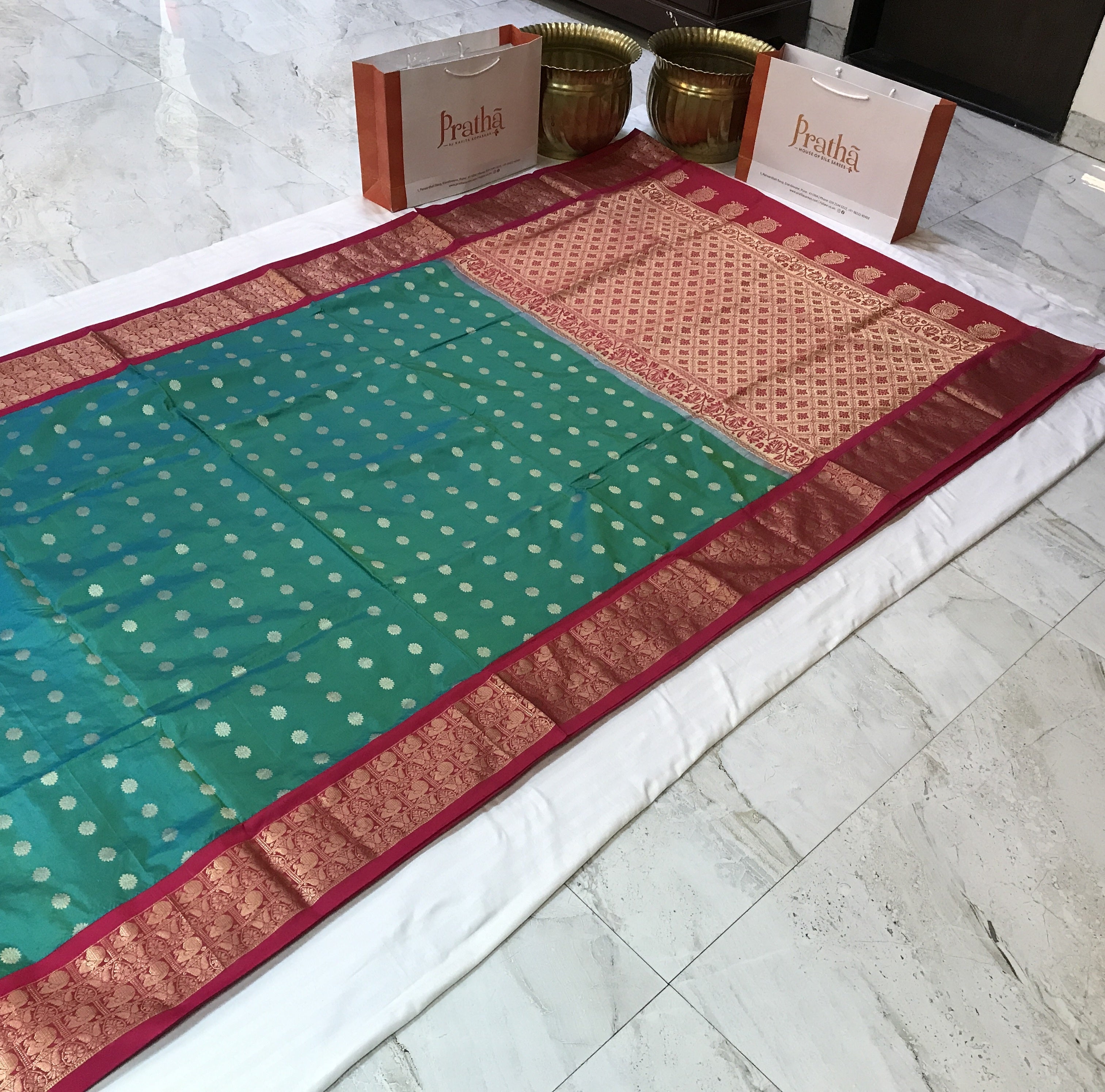 A combination which is as fresh as it can get! A very pretty dhoop-chav shade of rama green and pink-red border with golden motives of peacock and flower leaves,Gadhwal in these beautiful colours is a keepsake. The delicate golden zari butti extremely with zari pallu looks outstanding. This stunning combination makes this weave a perfect wedding wear.