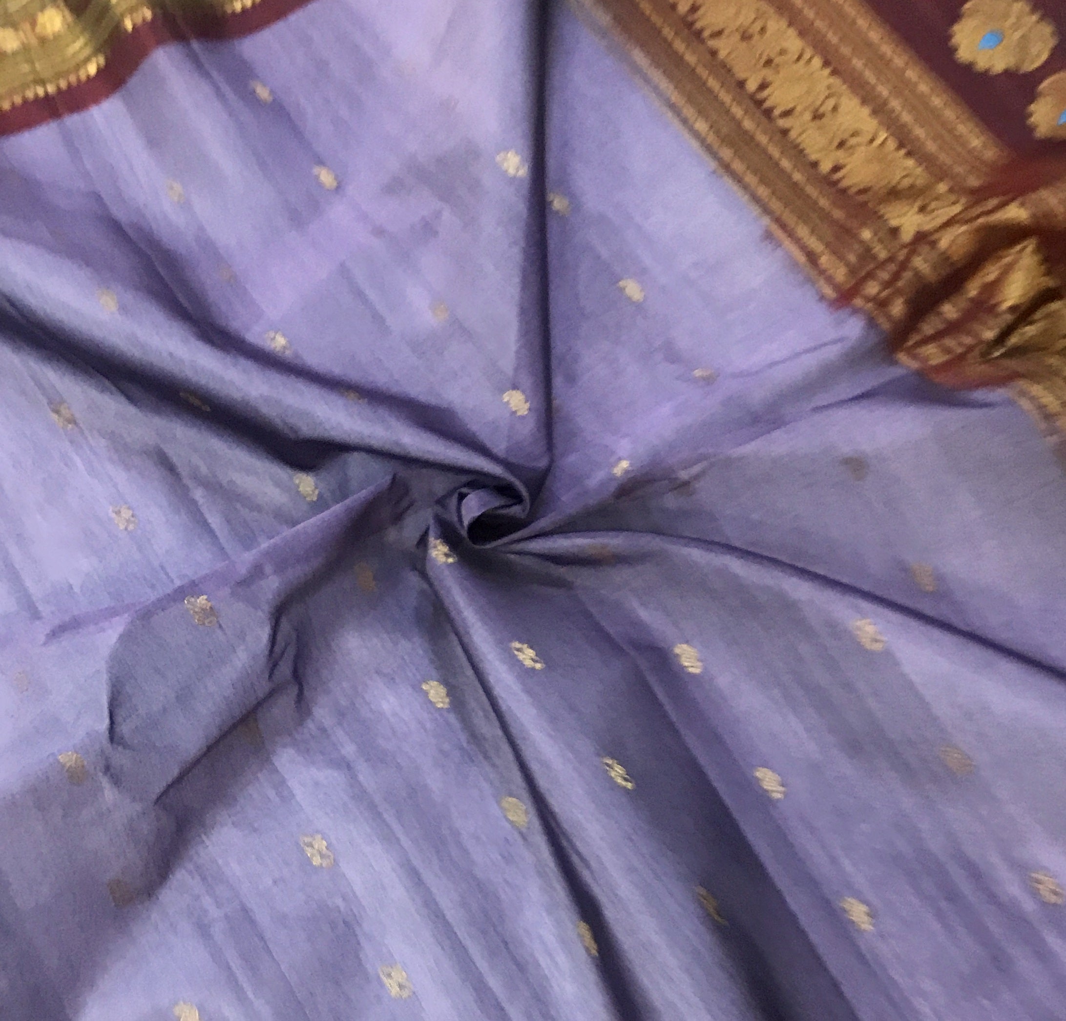 Those who love mixture of 'Silk-Cotton' will definitely like this Silk Cotton Gadhwal! This saree woven in few thread of silk and few thread of cotton alternately is incredible. This is an outstanding and unusual lavender with maroon traditional border that look awesome, this definitely going to win your heart. Light in weight and easy to drape, this Silk Cotton Gadhwal is casual yet elegant, simple yet graceful!