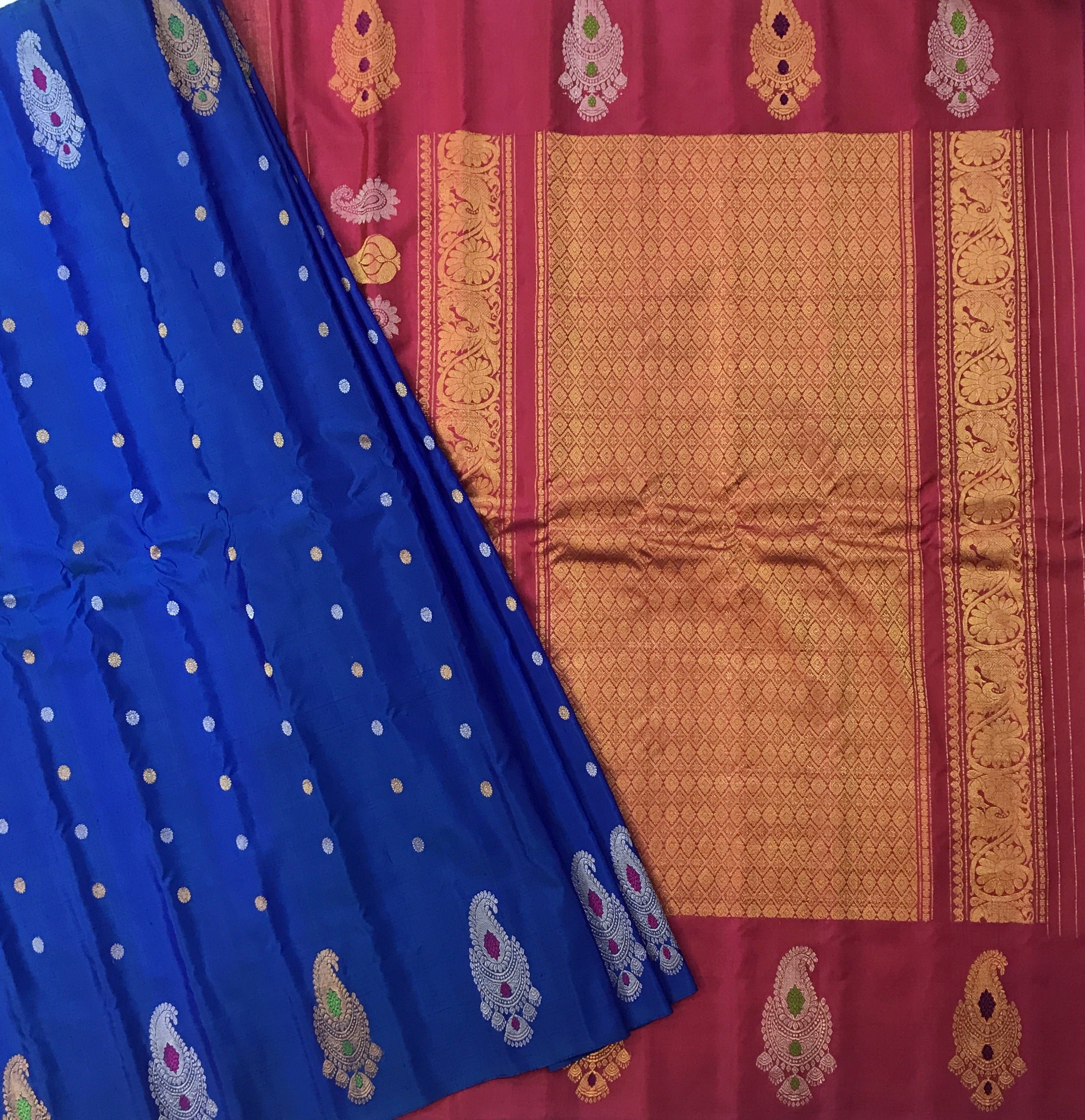 A very beautiful blue coloured 'designer border Gadhwal' reflects the weaver's dedication and hard work. The intricate floral butti woven in golden-silver thread looks stylish and gives this saree a vibrant and festive vibe The intricates borders, that is, a multicoloured koyari designer border, look distinctive and complementing each other.