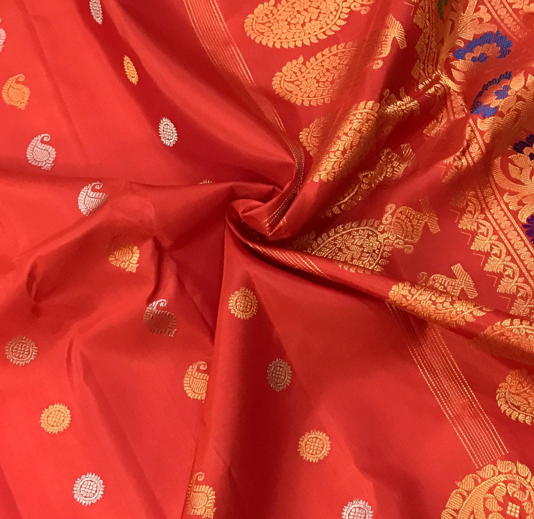 Bright shade of red pure silk Gadhwal looks beautiful in day light as well as night time. This one is special weave, the floral and koyari butti evenly woven in silver as well as golden zari thread through the saree give it festive touch. The meenakari golden zari border and the traditional pallu complement beautifully with this saree. This is the perfect choice for someone who is looking for traditional saree.