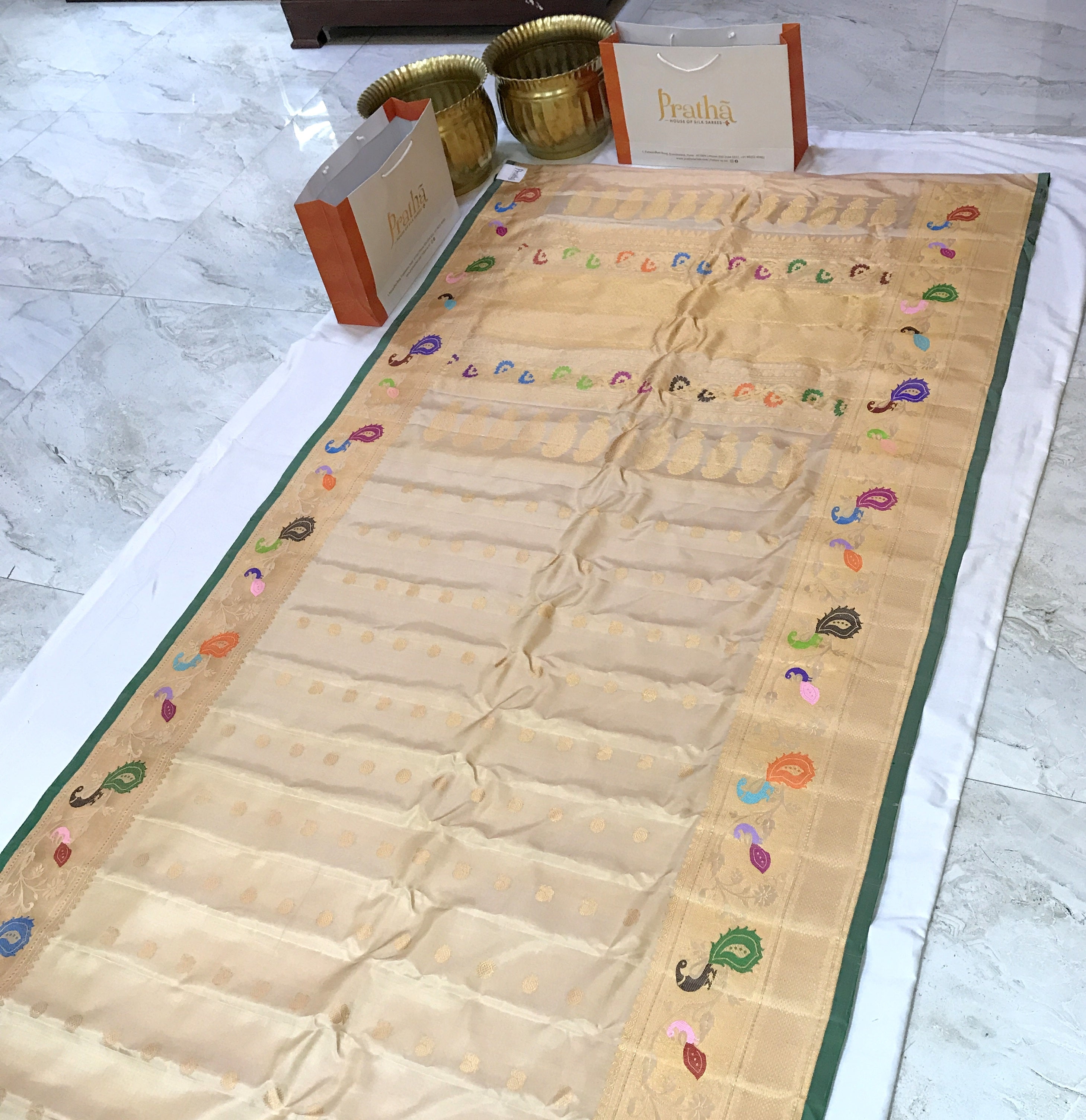 This is a beige coloured Gadhwal saree. One of the most unique combinations in pure silk- beige with self coloured meenakari border with peacock ! The special intricate peacock design border and pallu creates a fascinating effect on this weave! A perfect pick to wear on any special occasion or festival.