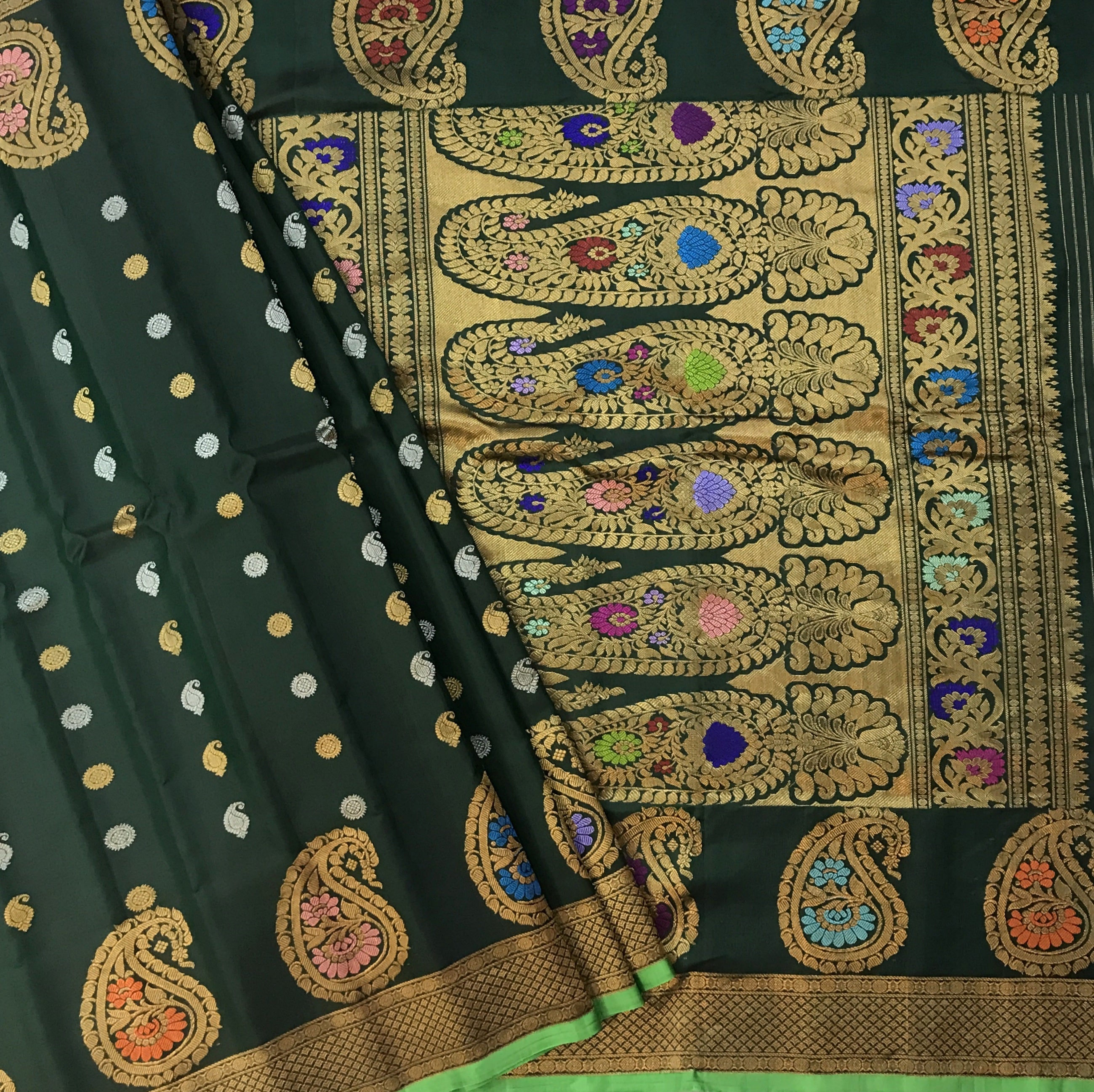 Bright shade of green pure silk Gadhwal looks beautiful in day light as well as night time. This one is special weave, the floral and koyari butti evenly woven in silver as well as golden zari thread through the saree give it festive touch. The meenakari golden zari border and the traditional pallu complement beautifully with this saree. This is the perfect choice for someone who is looking for traditional saree.