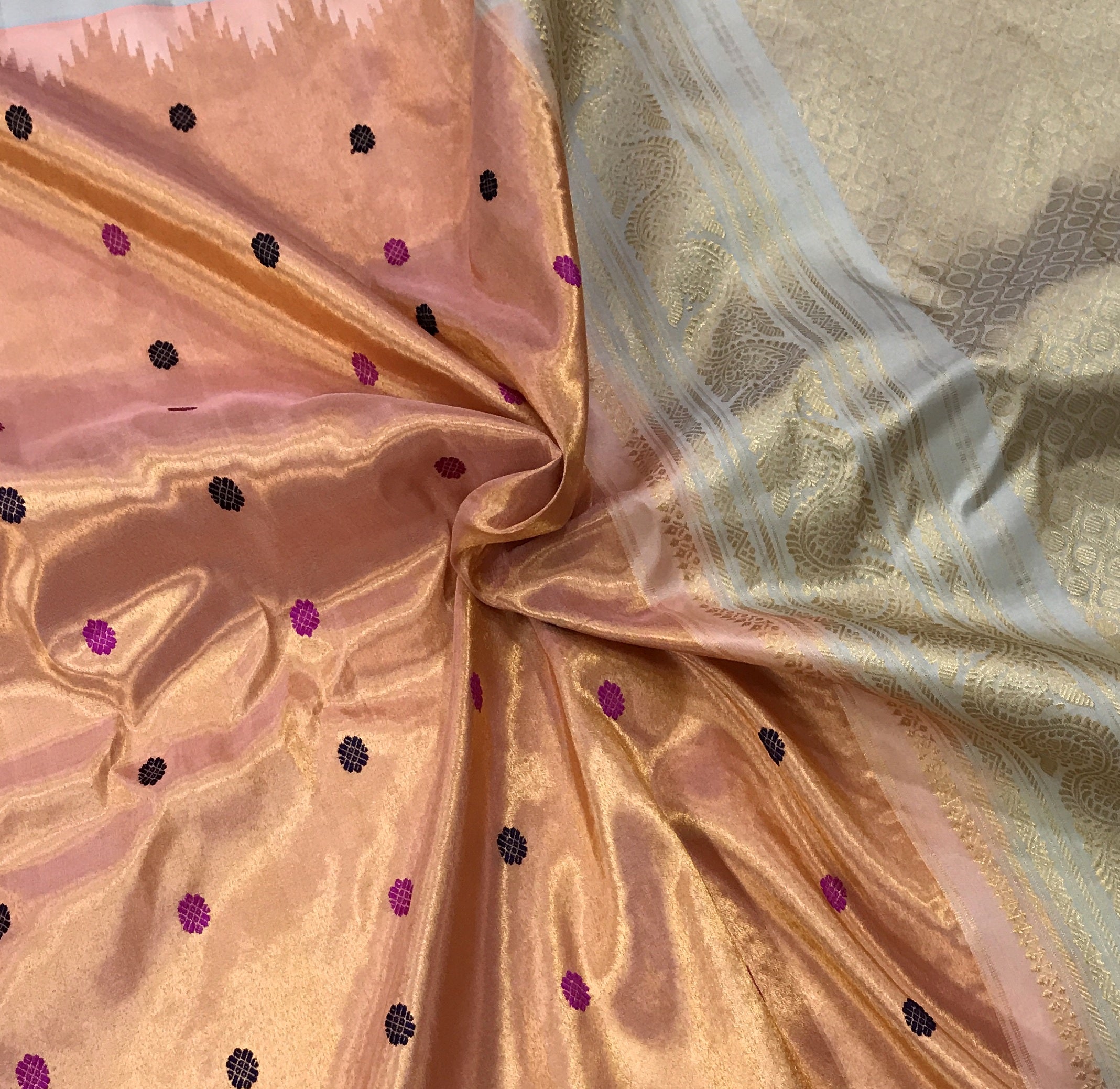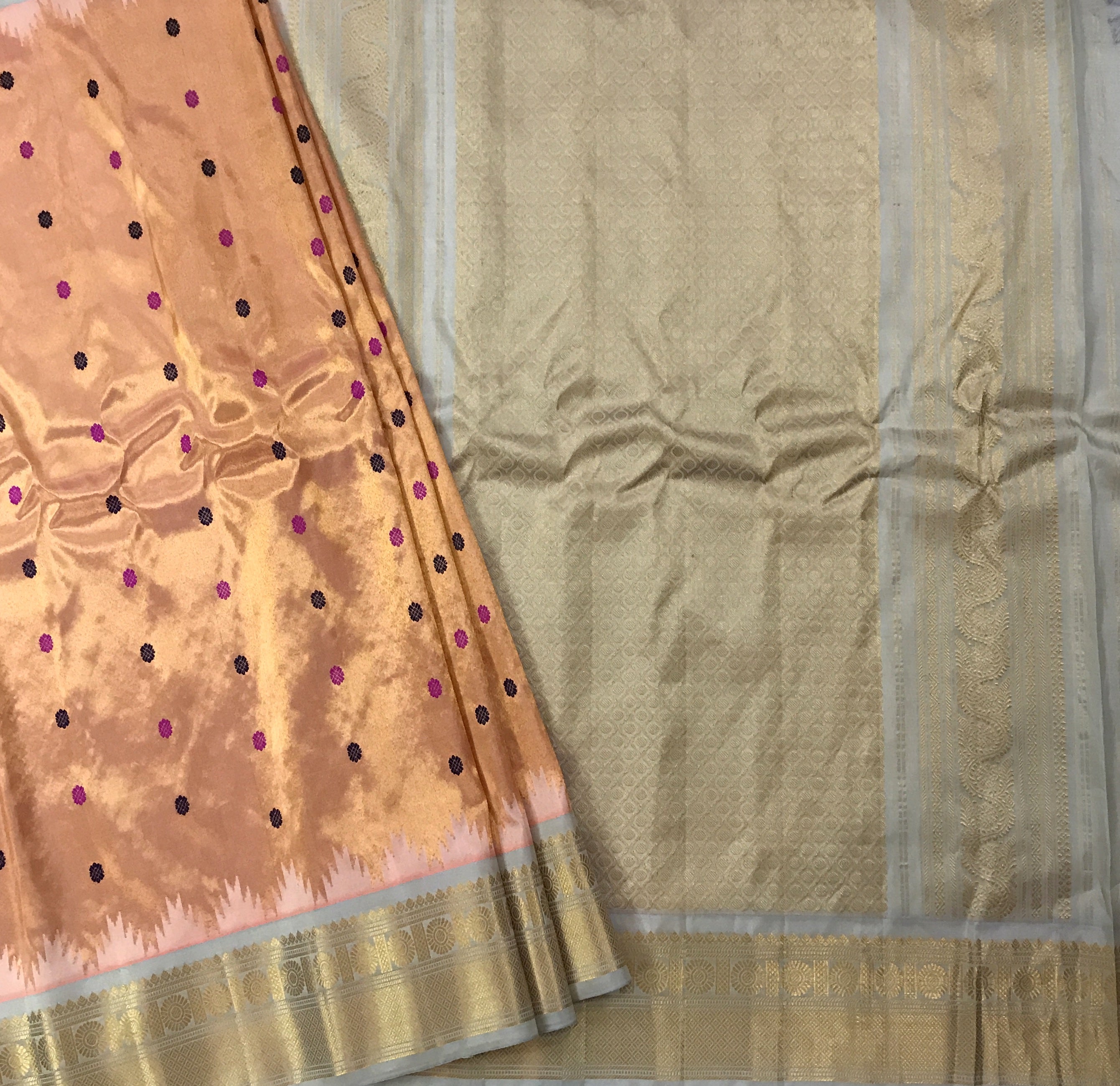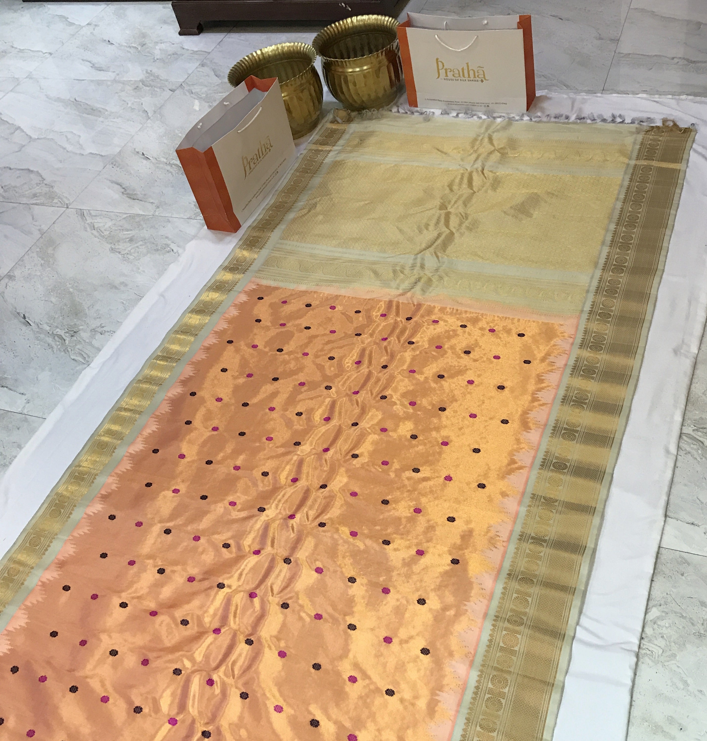 This ethereal tissue Gadwal is supremely unique thanks to its intricate reshim butti design. These are embedded so aesthetically in the detailed copper-golden tissue weave, that this masterpiece just steals all the attention! The combination of copper, the traditional contrast pista border and the classic tissue pallu add to the grace of this grand Gadwal.
