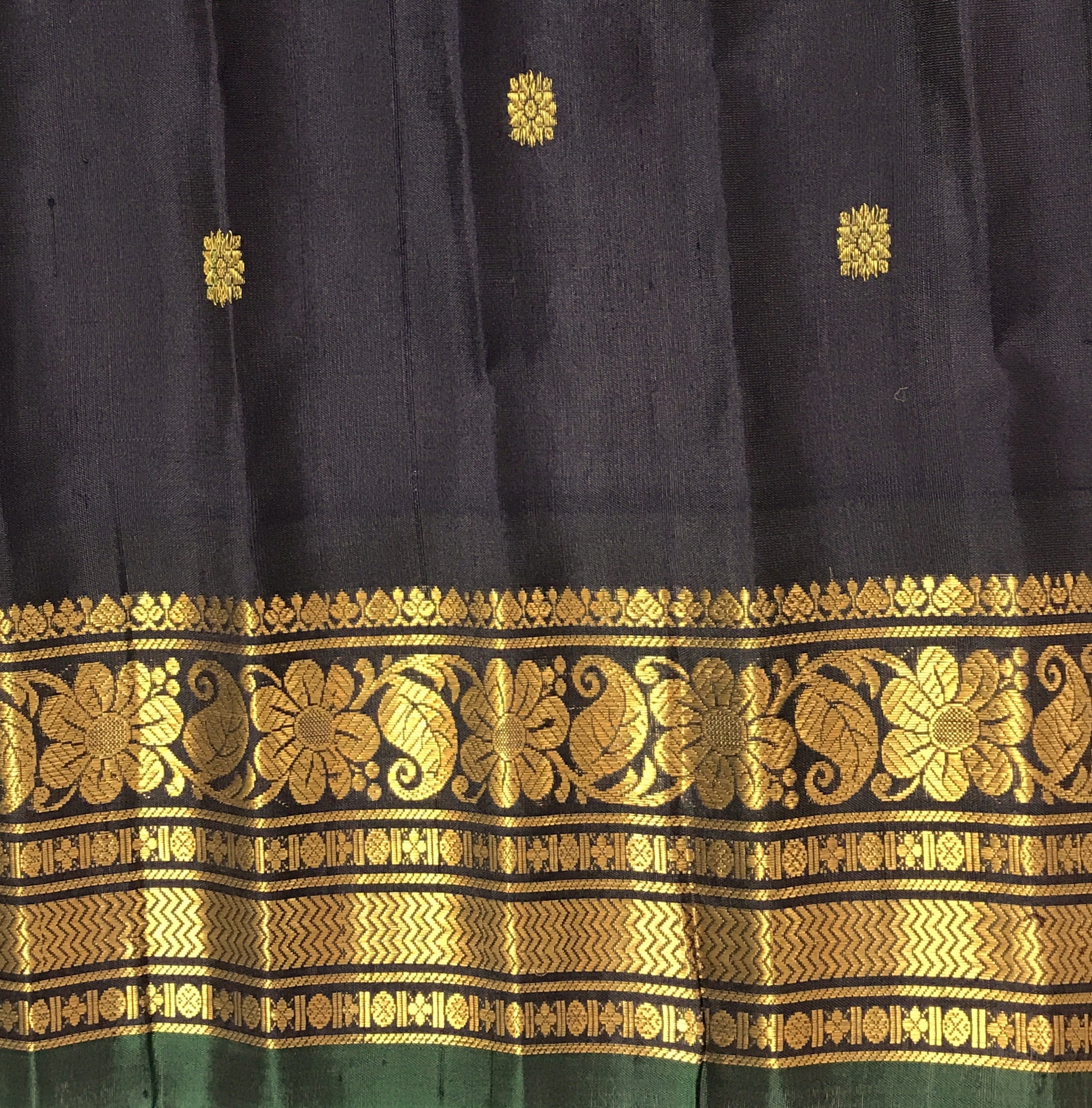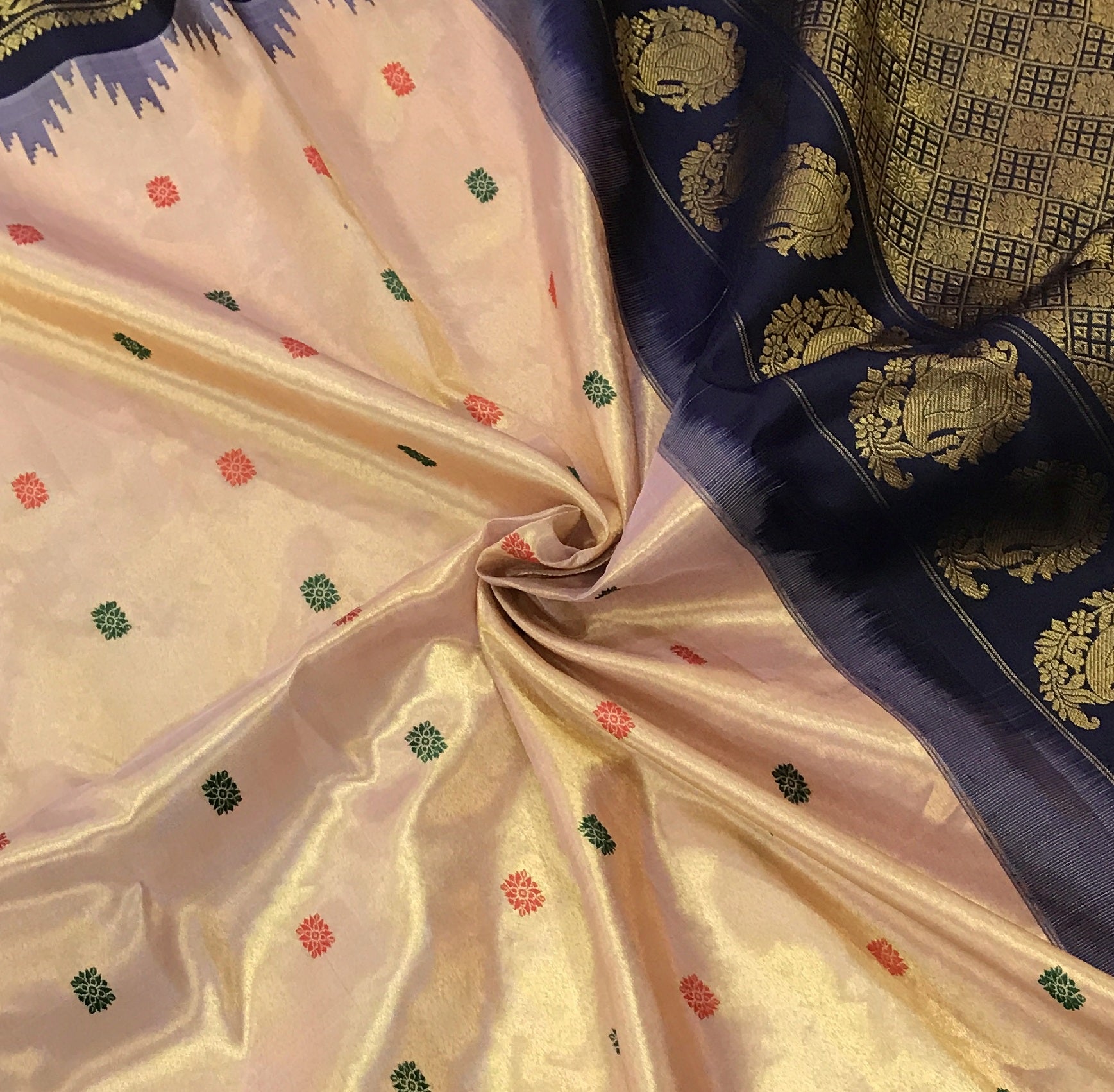 Blouse Colour: Contrast ( Coffee-brown with butti desin and golden zari border)