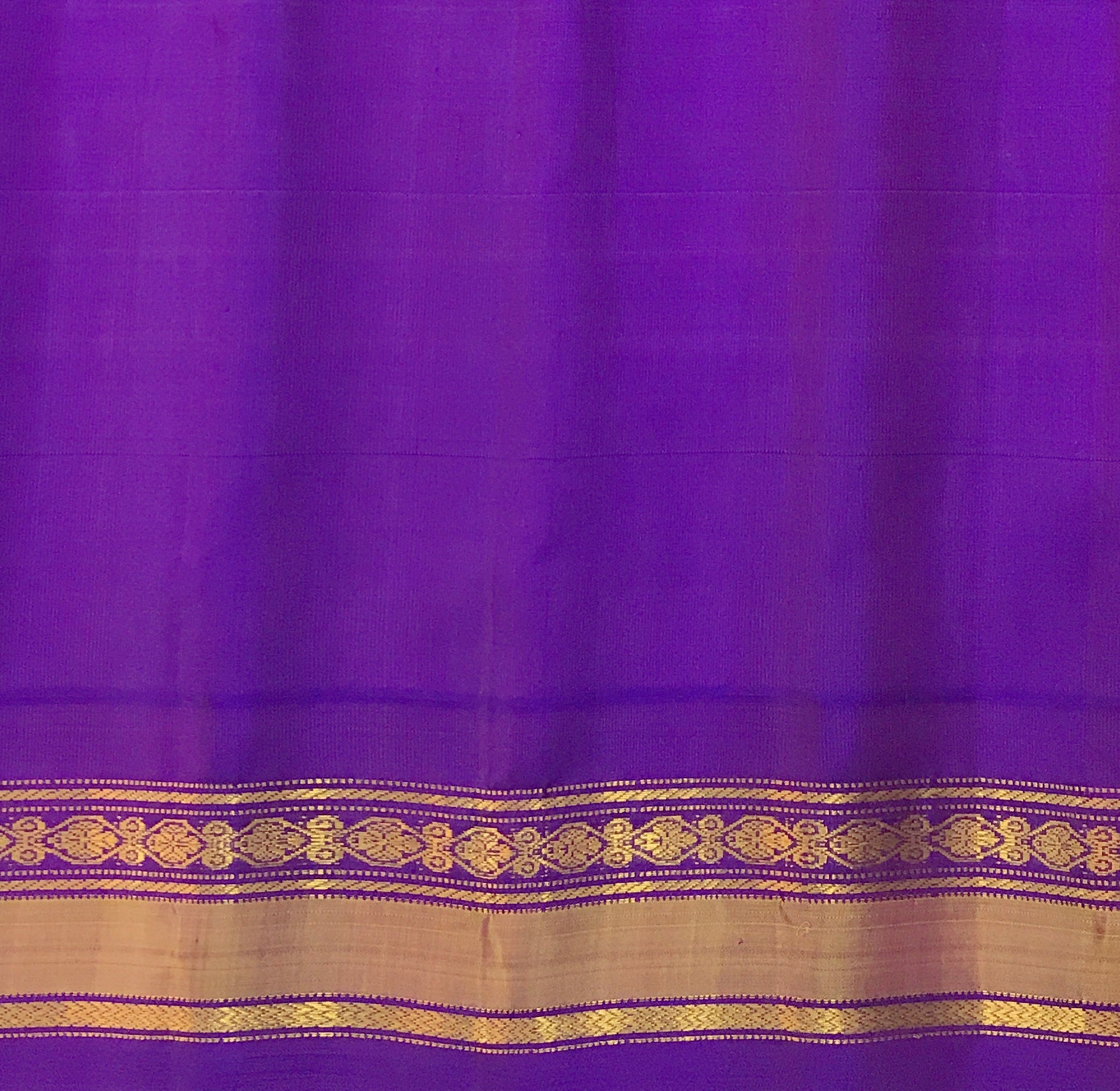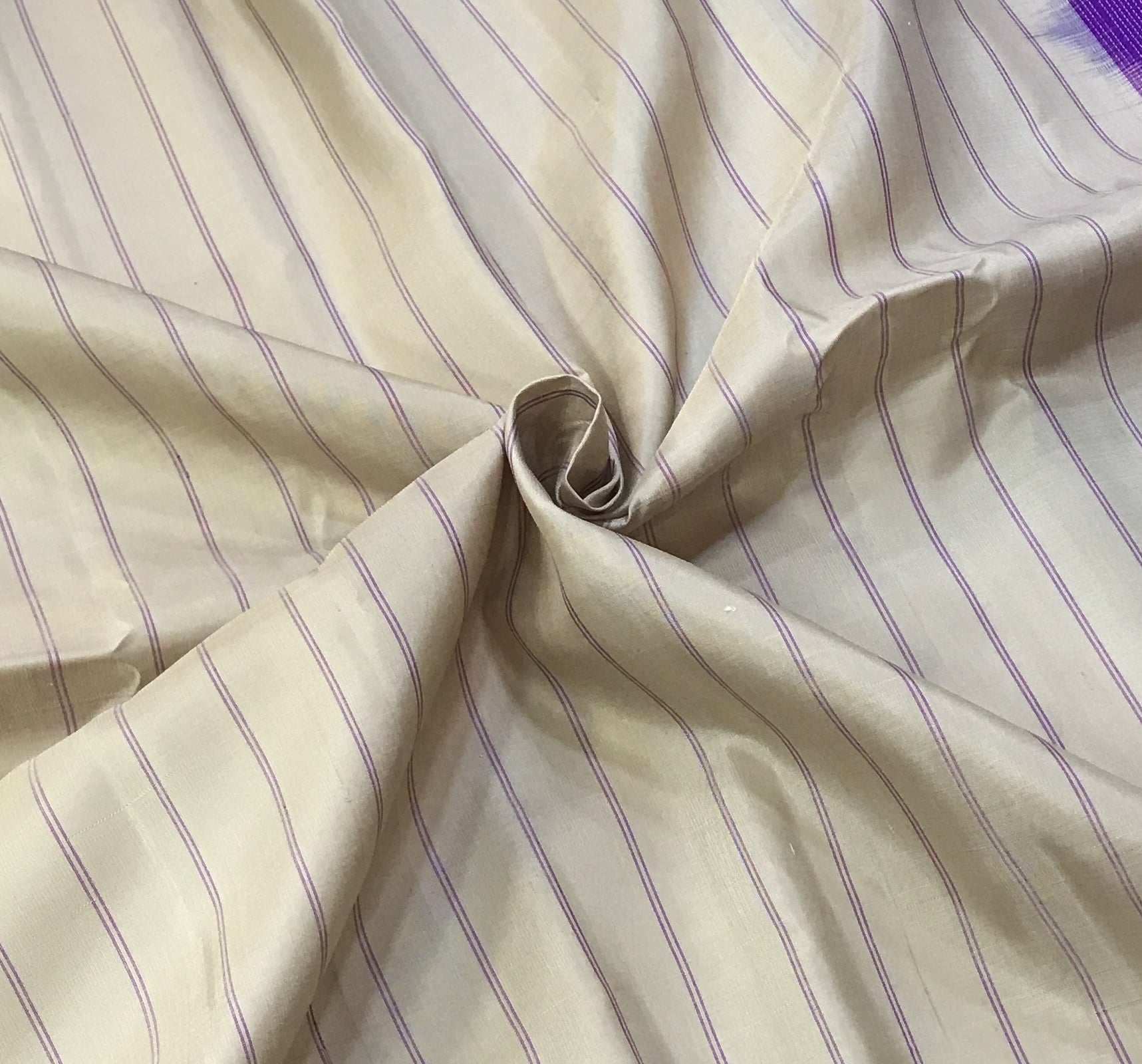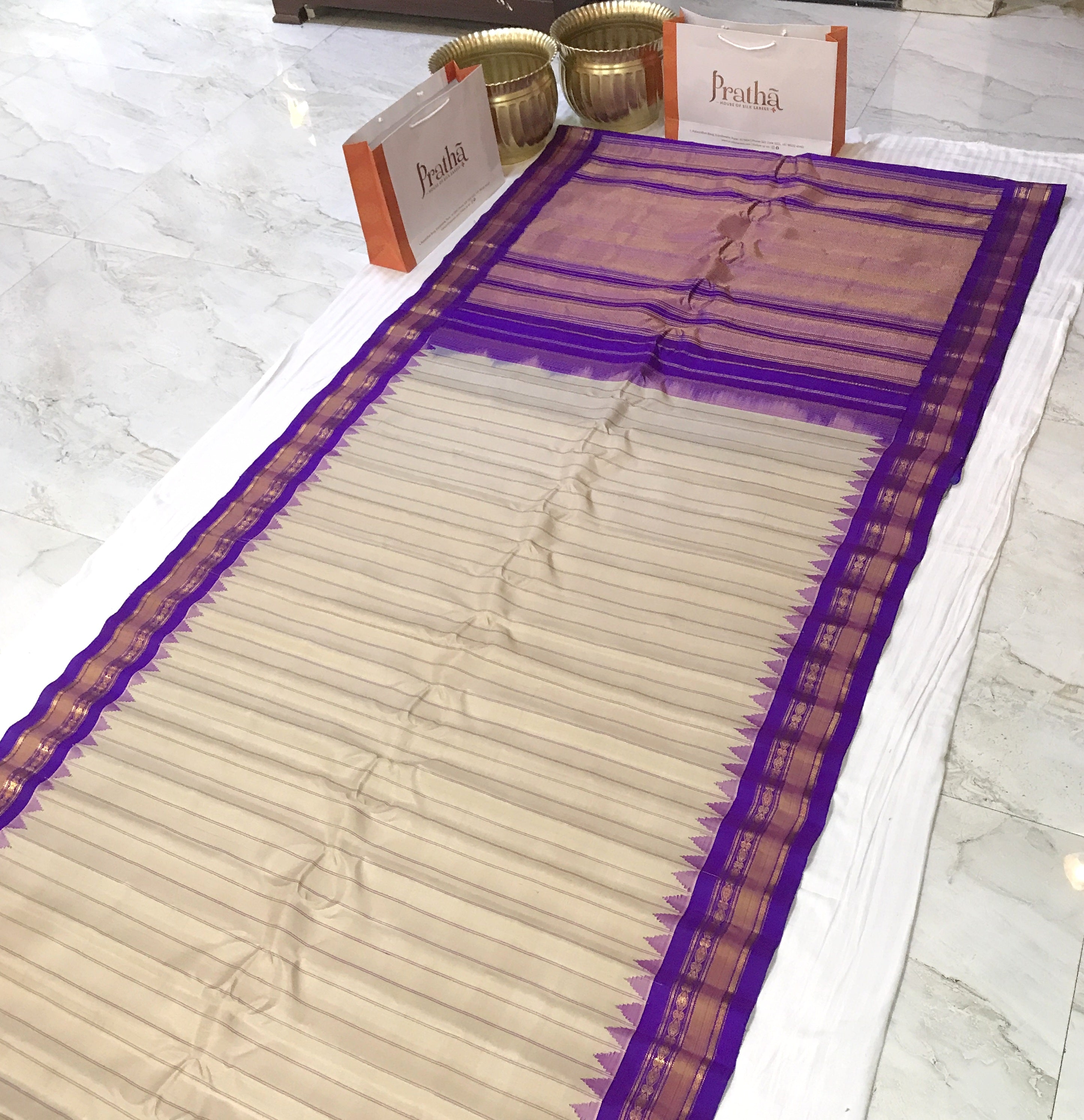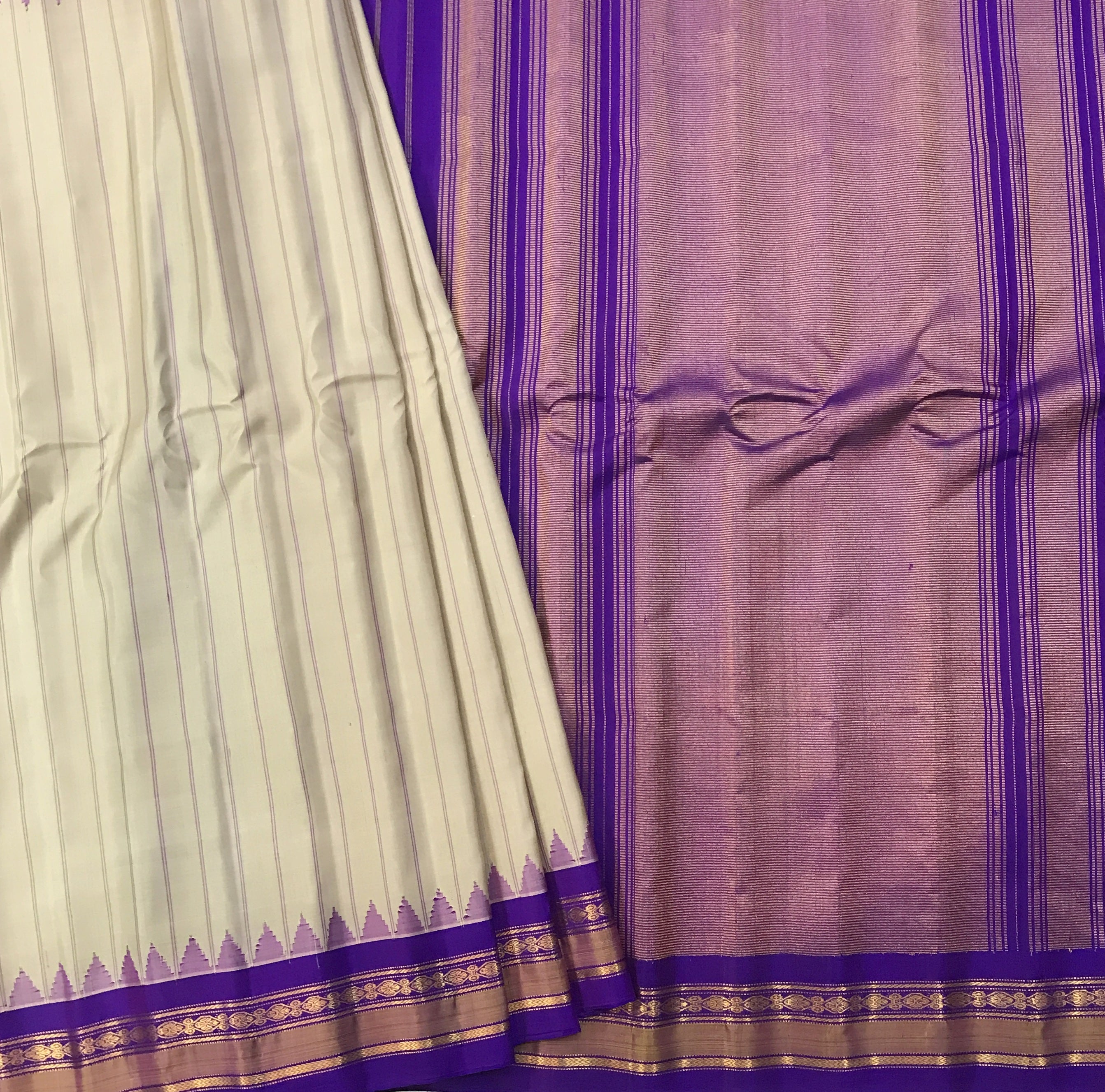 The off-white saree is an elegant blend of simplicity and richness. The body features fine vertical lines that create a sleek, elongated look, enhancing the natural fall and grace of the drape. The subtle texture adds depth without overpowering the refined aesthetic of the weave. Framing this understated body is a striking pinkish-purple temple design border that extends into a matching purple pallu, The contrast between the soft-toned body and the vibrant silk accents lends the saree a regal yet graceful appeal—perfect for traditional occasions, celebrations, or sophisticated gatherings.