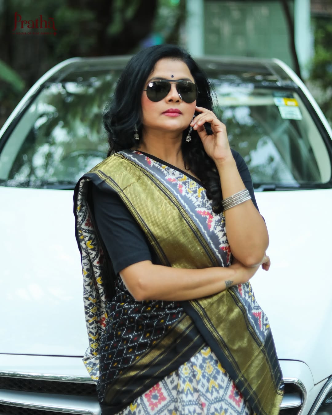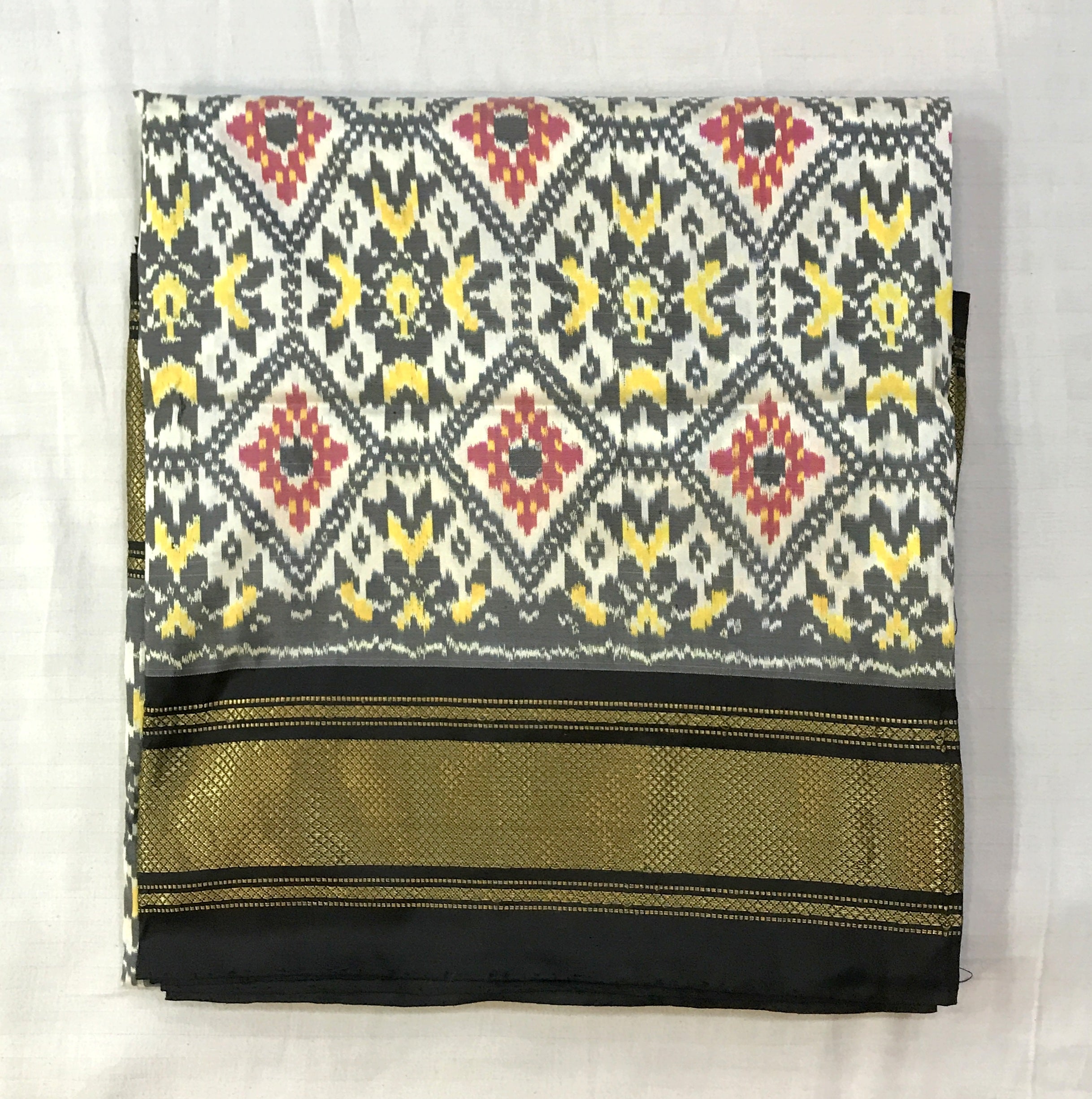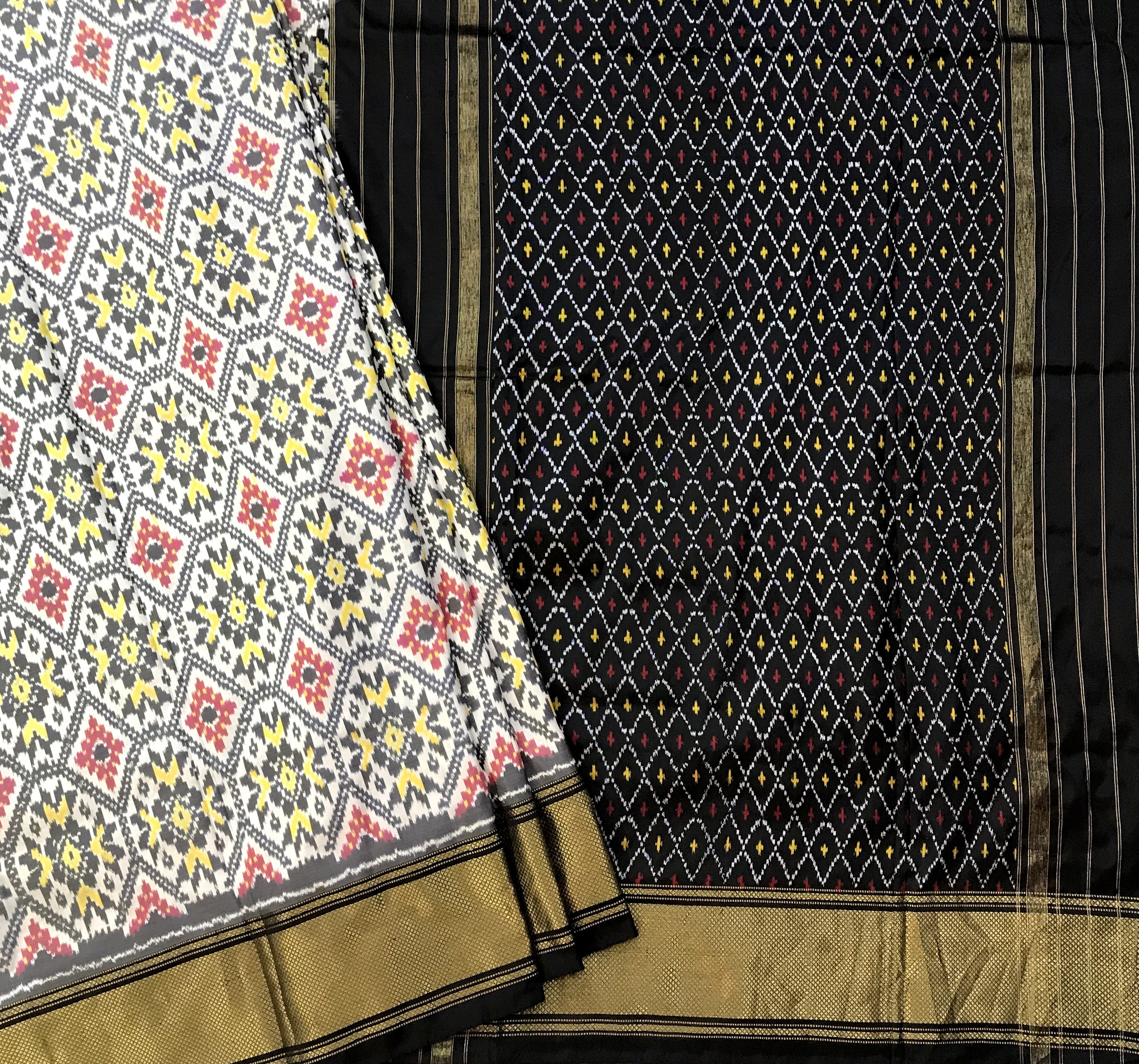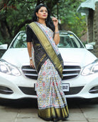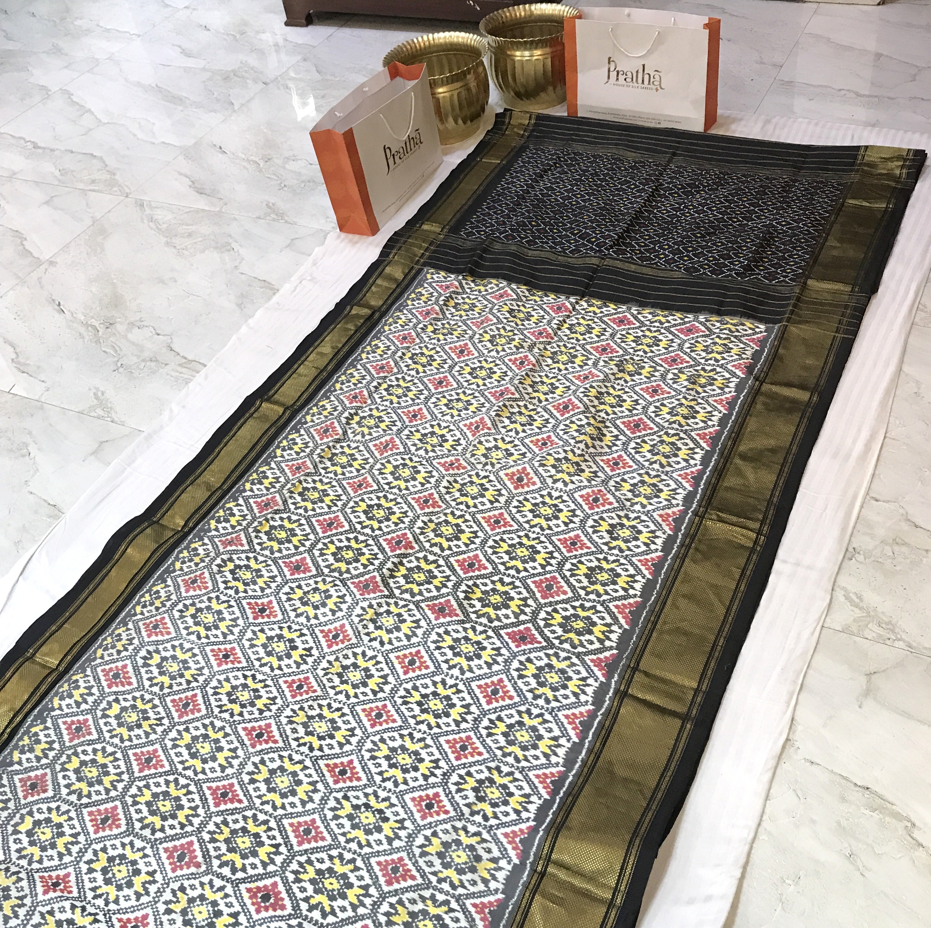 This refined white handwoven ikkat saree features ikkat patterns highlighted by a vibrant contrast black with golden zari border, capturing the classic allure distinctive to traditional ikkats. A must-have for saree enthusiasts who appreciate truly unique and captivating designs.