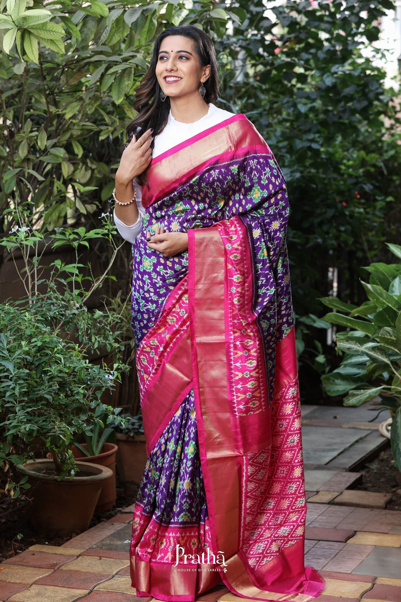 This refined purple handwoven ikkat saree features intricate ikkat patterns highlighted by a vibrant contrast pink coloured with golden zari border, capturing the classic allure distinctive to traditional ikkats. A must-have for saree enthusiasts who appreciate truly unique and captivating designs.