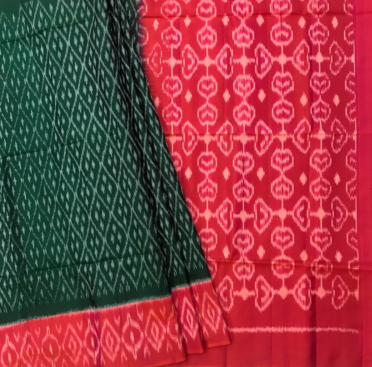 Make a graceful statement with this stunning soft silk saree in a beautiful green and pink combination. The saree is adorned with shimmering ikkat patterns all over the body, giving it a rich and sophisticated appeal. The intricate weaving enhances its traditional charm while maintaining a stylish, contemporary look.The striking contrast border with detailed design work adds depth and elegance, making it perfect for festive occasions, celebrations, and special gatherings. The vibrant pink pallu complements the body beautifully, creating a captivating visual contrast.