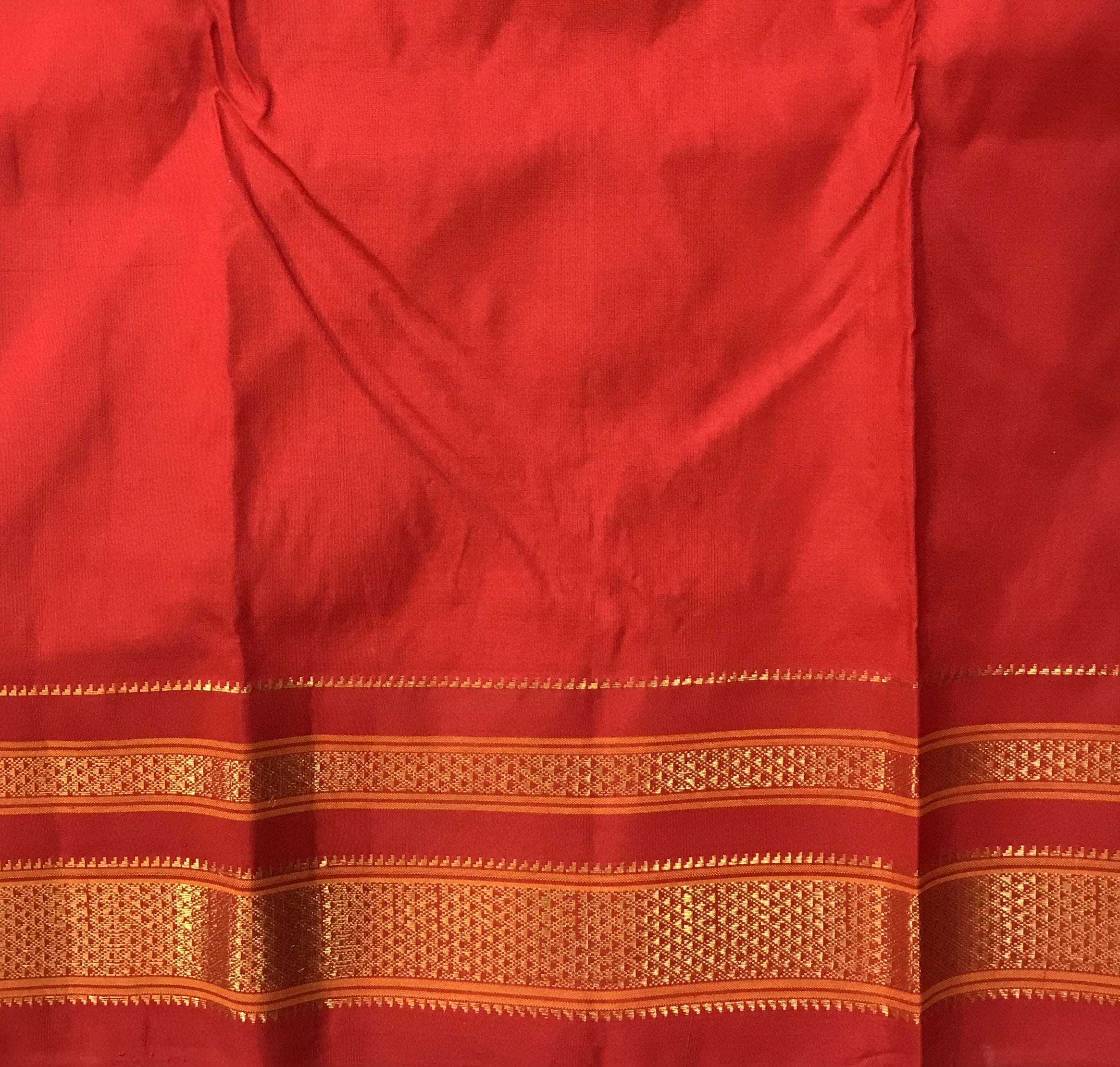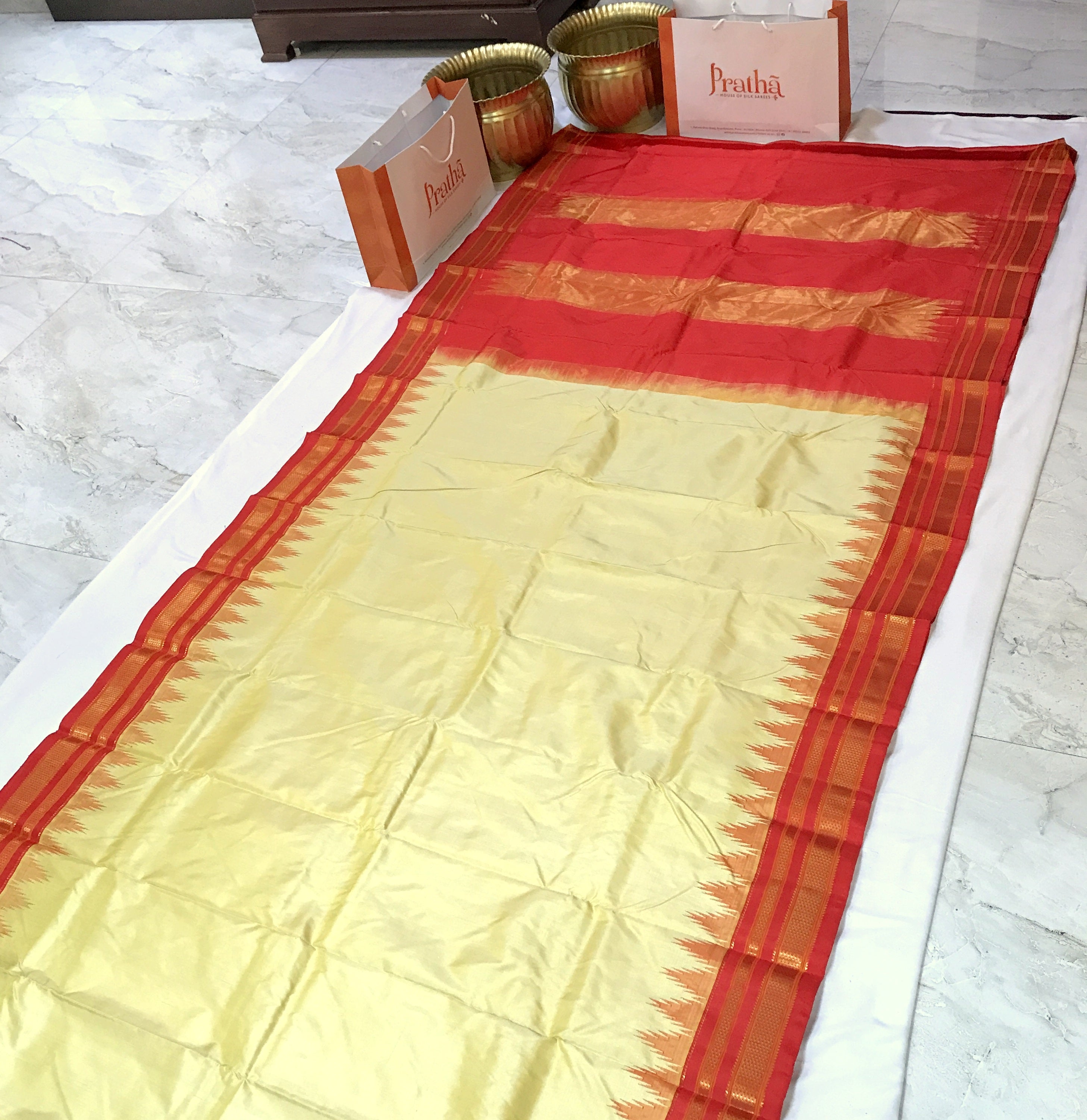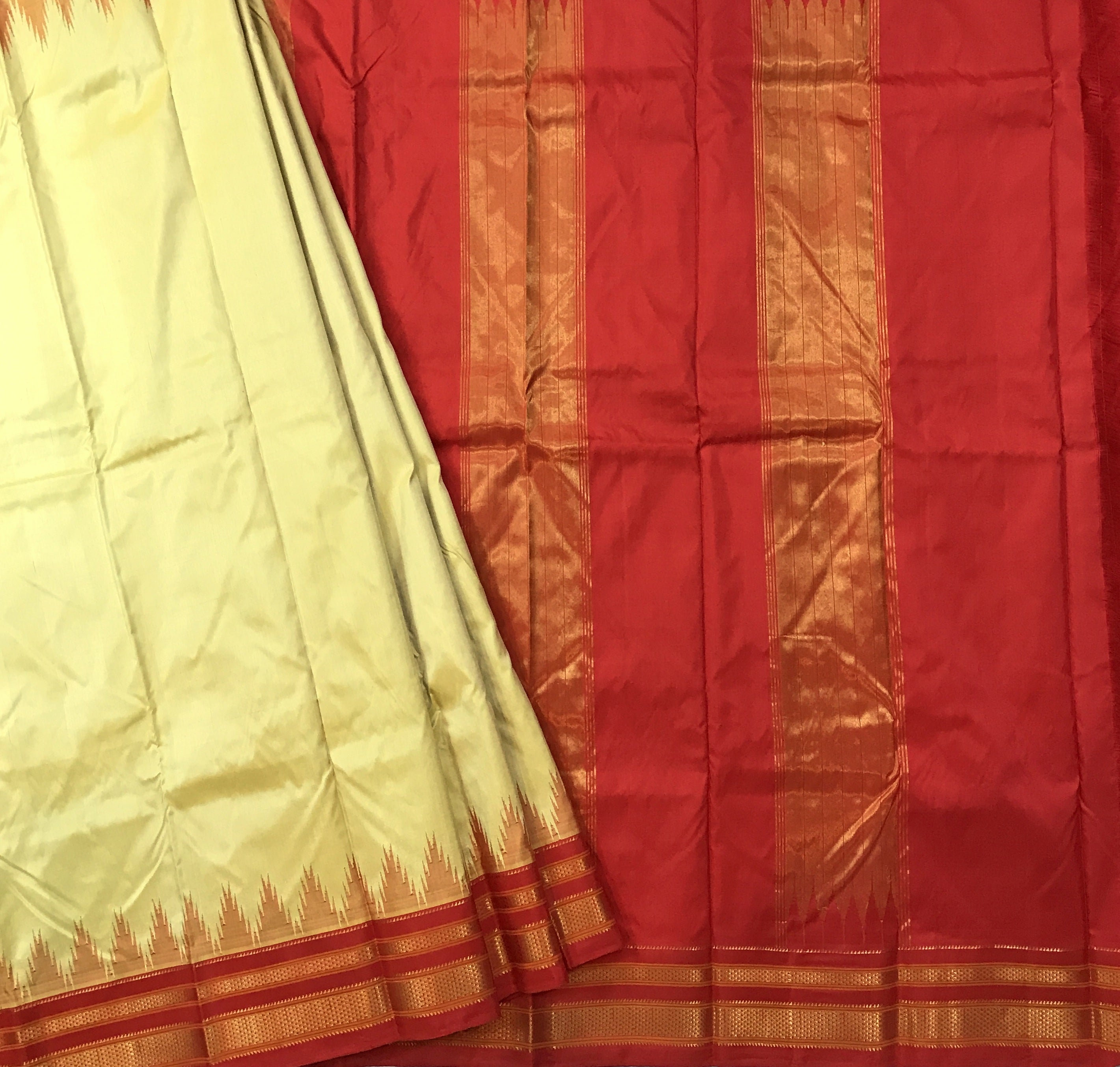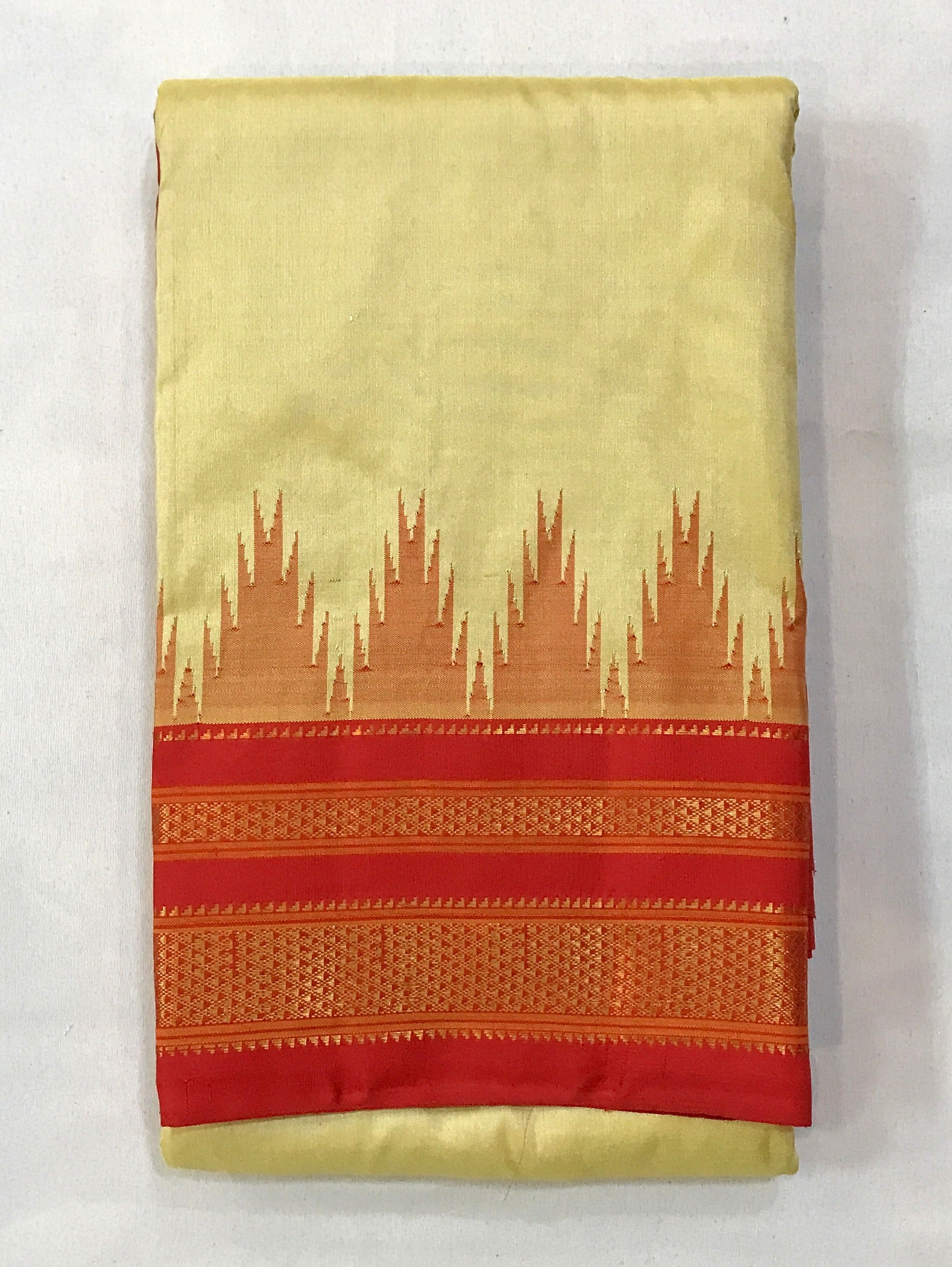 A light shade of 'yellow', this Irkal always wins hearts! And especially when it teams up with a beautiful shade of red at its border and pallu. This Irkal has an elaborate temple design at its border and a beautiful golden zari pallu which gives this saree a traditional and festive touch.