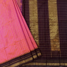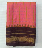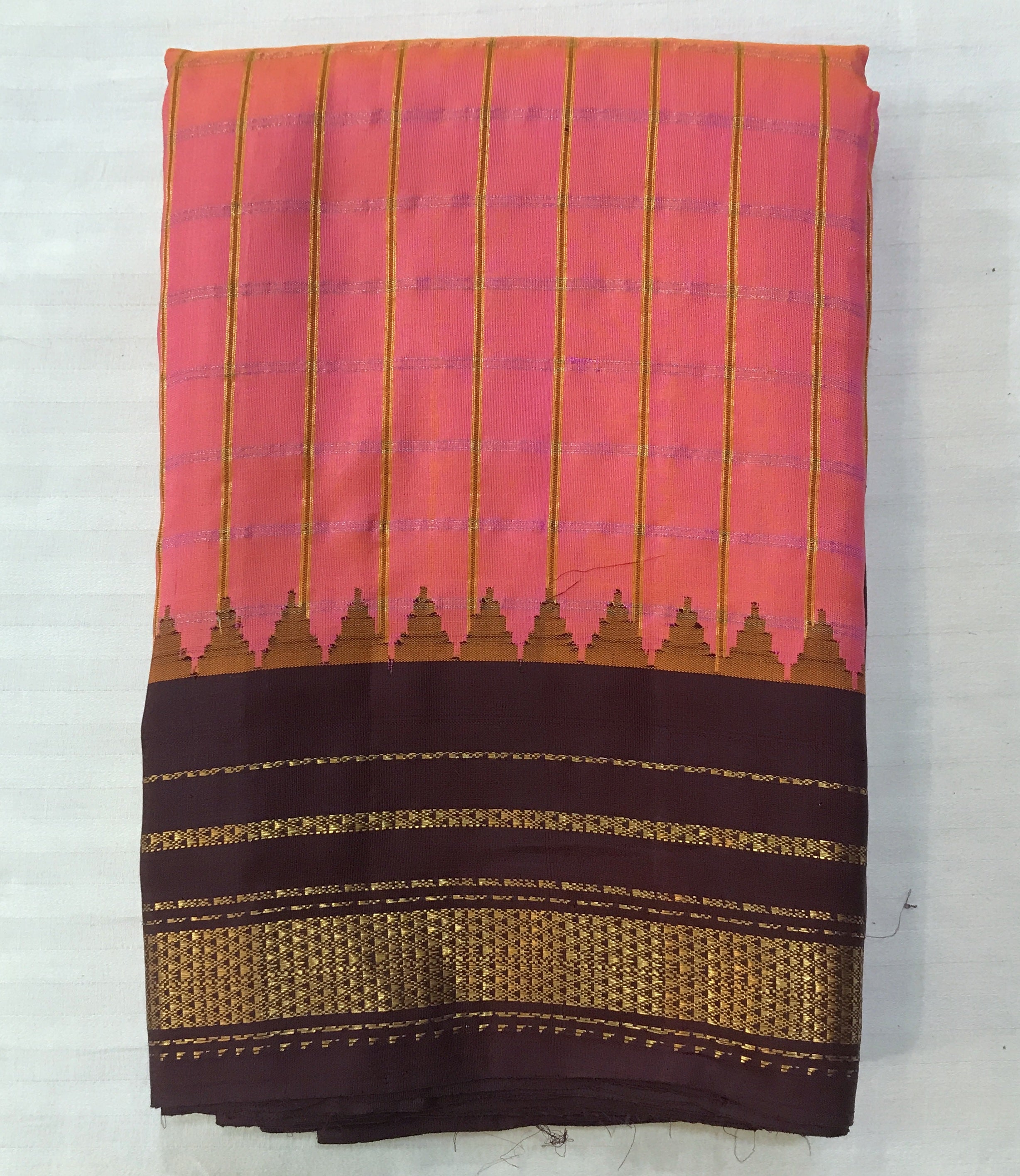 A very beautiful and attractive combination of golden-pink with a coffee-brown coloured temple design golden zari border, look magnificent especially with the zari checks woven throughout this pure silk handwoven Irkal. This classic weave looks stunning when drape. The zari checks and the traditional temple design of the border give festive touch to this weave.
