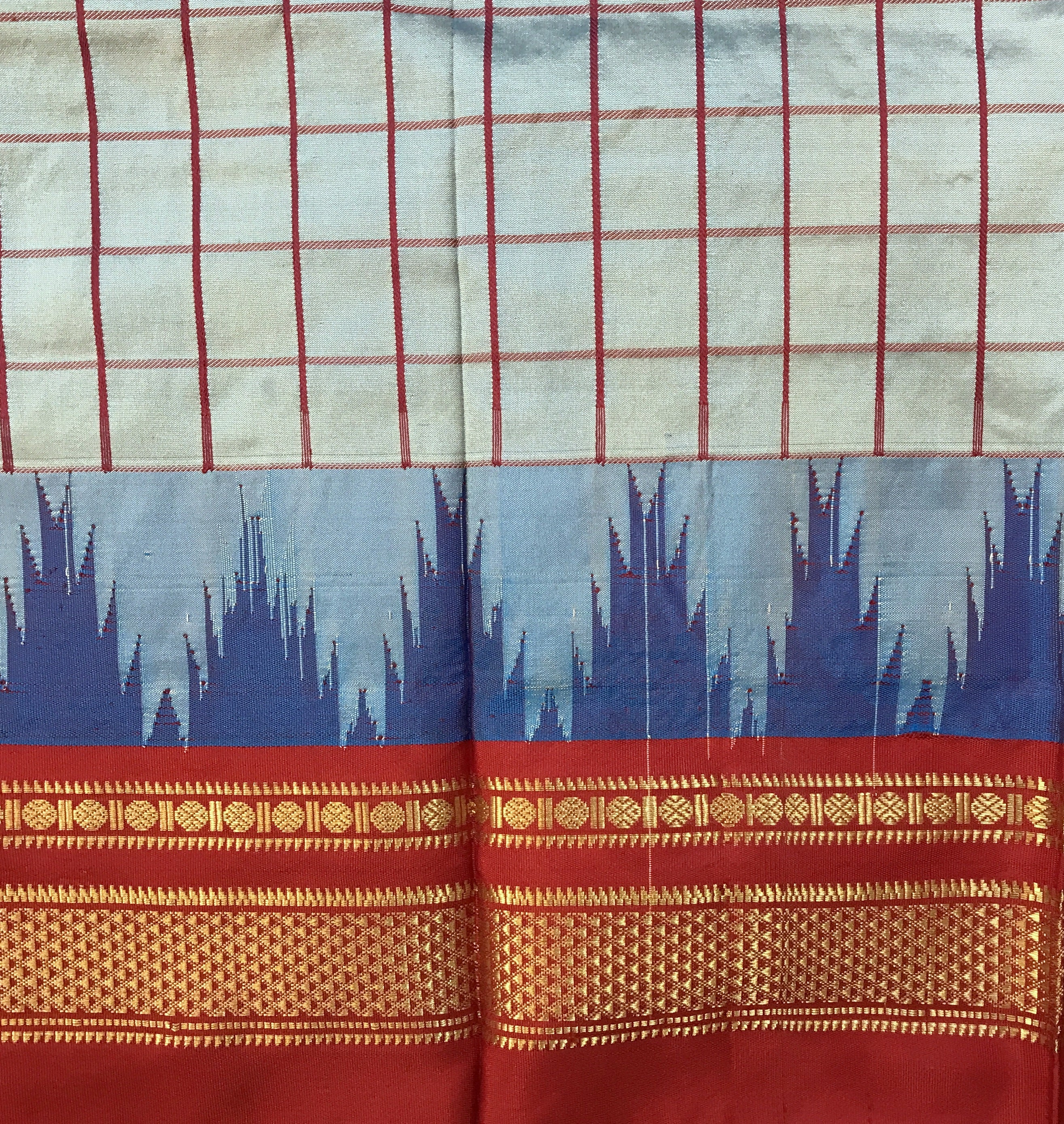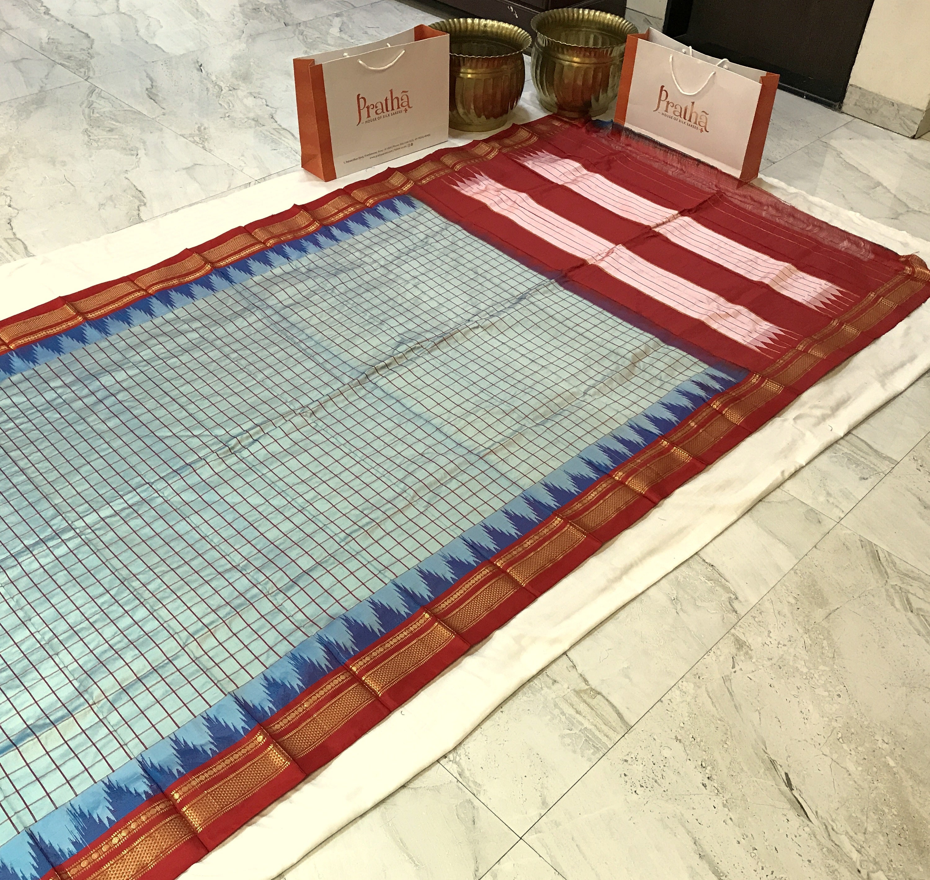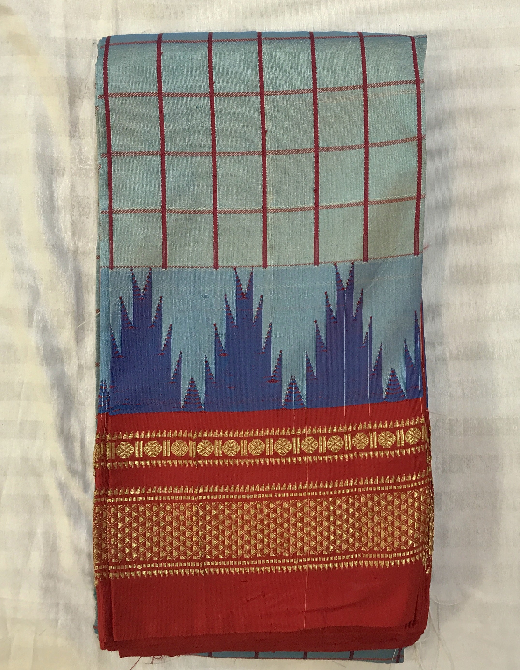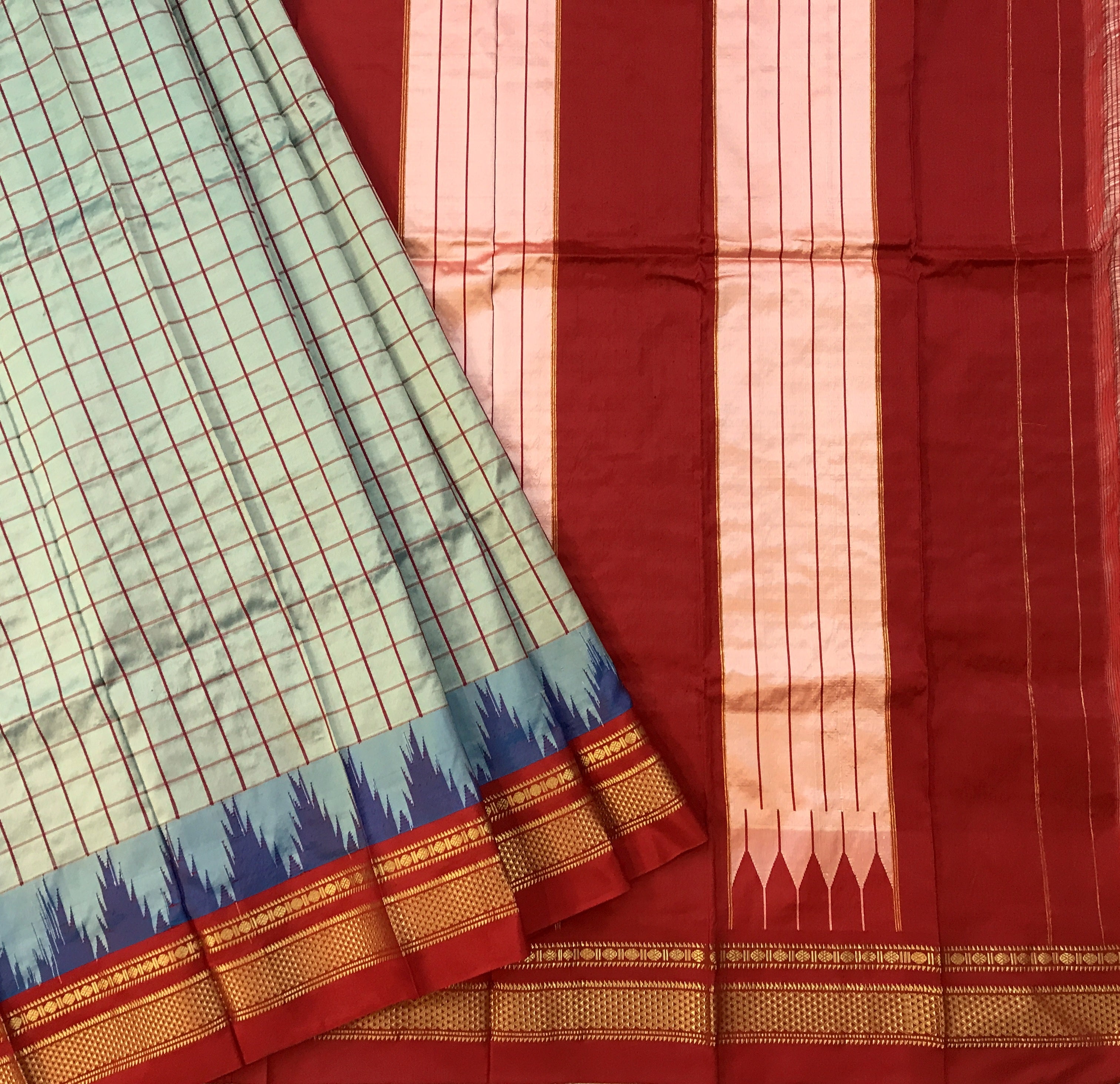 A very beautiful fresh mix shade of blue-green with a slight ting of golden shade and bright red unique temple design zari border, look magnificent especially with the zari checks woven throughout this pure silk handwoven Irkal. This classic weave looks stunning when drape. The zari checks and the traditional temple design of the border give festive touch to this weave.