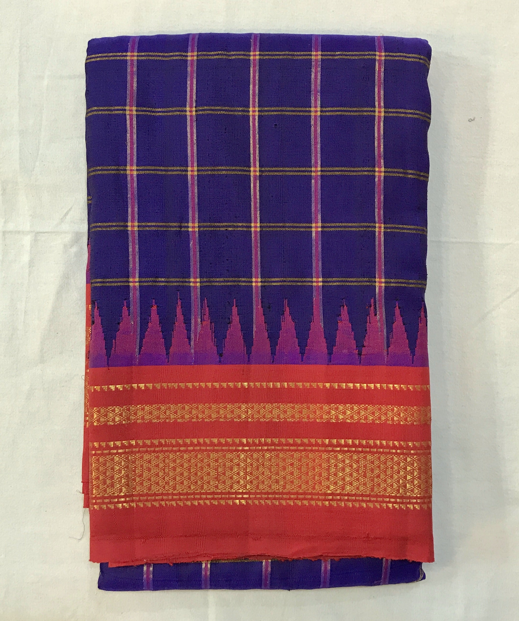This is very pretty combination of blue and fresh red looks magnificent especially with the zari checks woven throughout this pure silk handwoven Irkal .This classic weave looks stunning when draped. The zari checks and the traditional design with temple border give a festive touch to this weave.