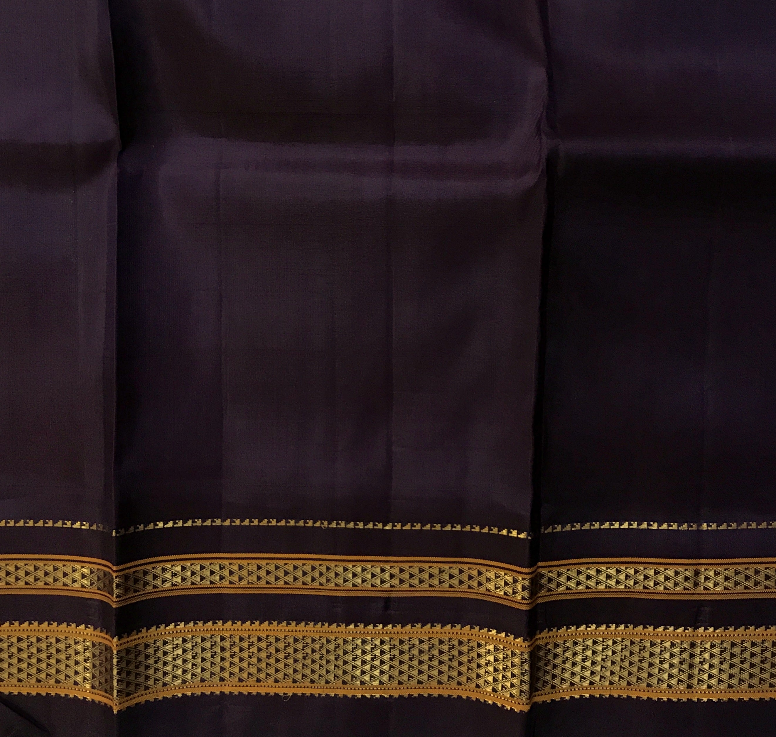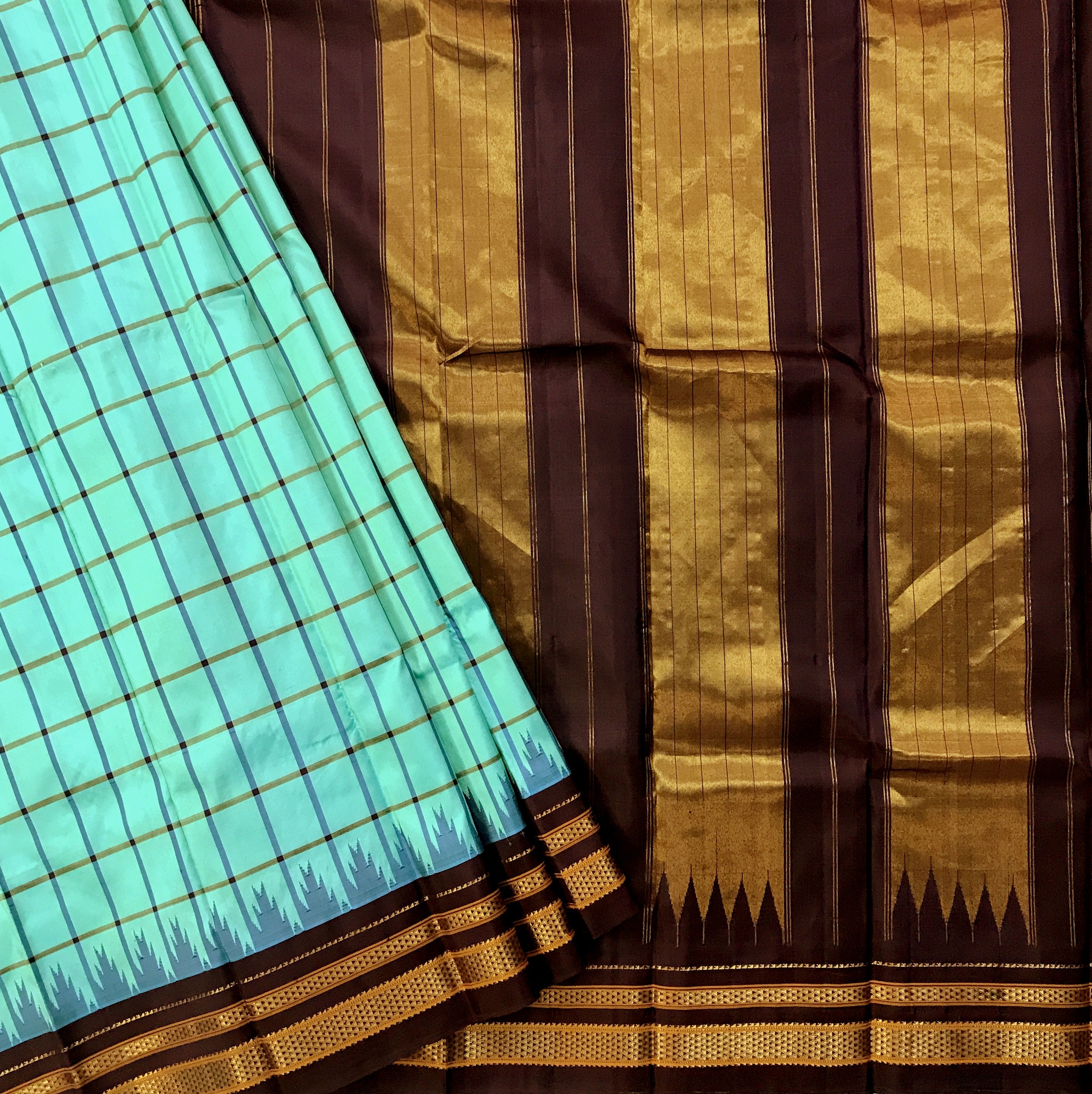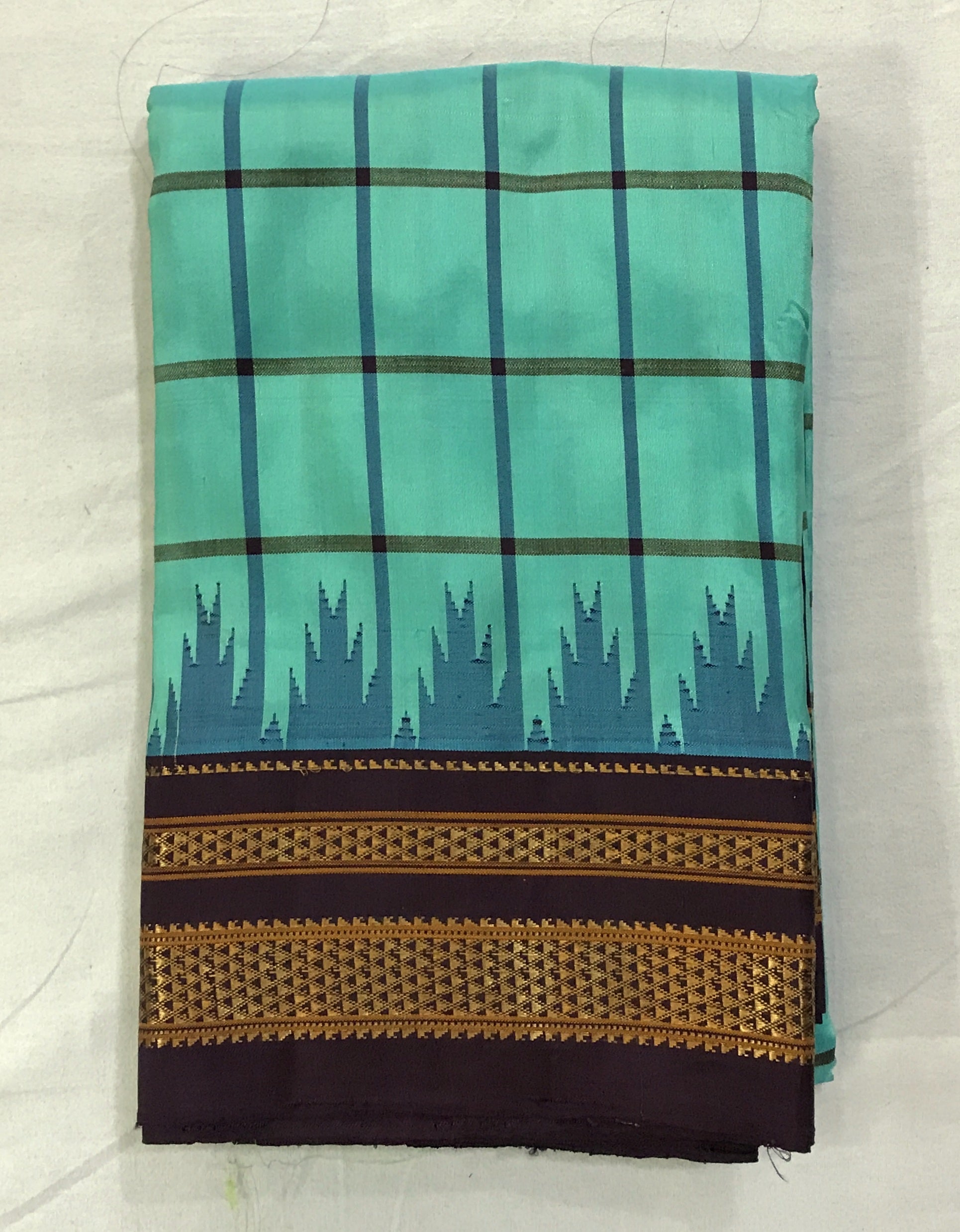 This is an extremely unique shade of turquoise and wine looks magnificent especially with the zari checks woven throughout this pure silk handwoven Irkal .This classic weave looks stunning when draped. The zari checks and the traditional design with temple border give a festive touch to this weave.