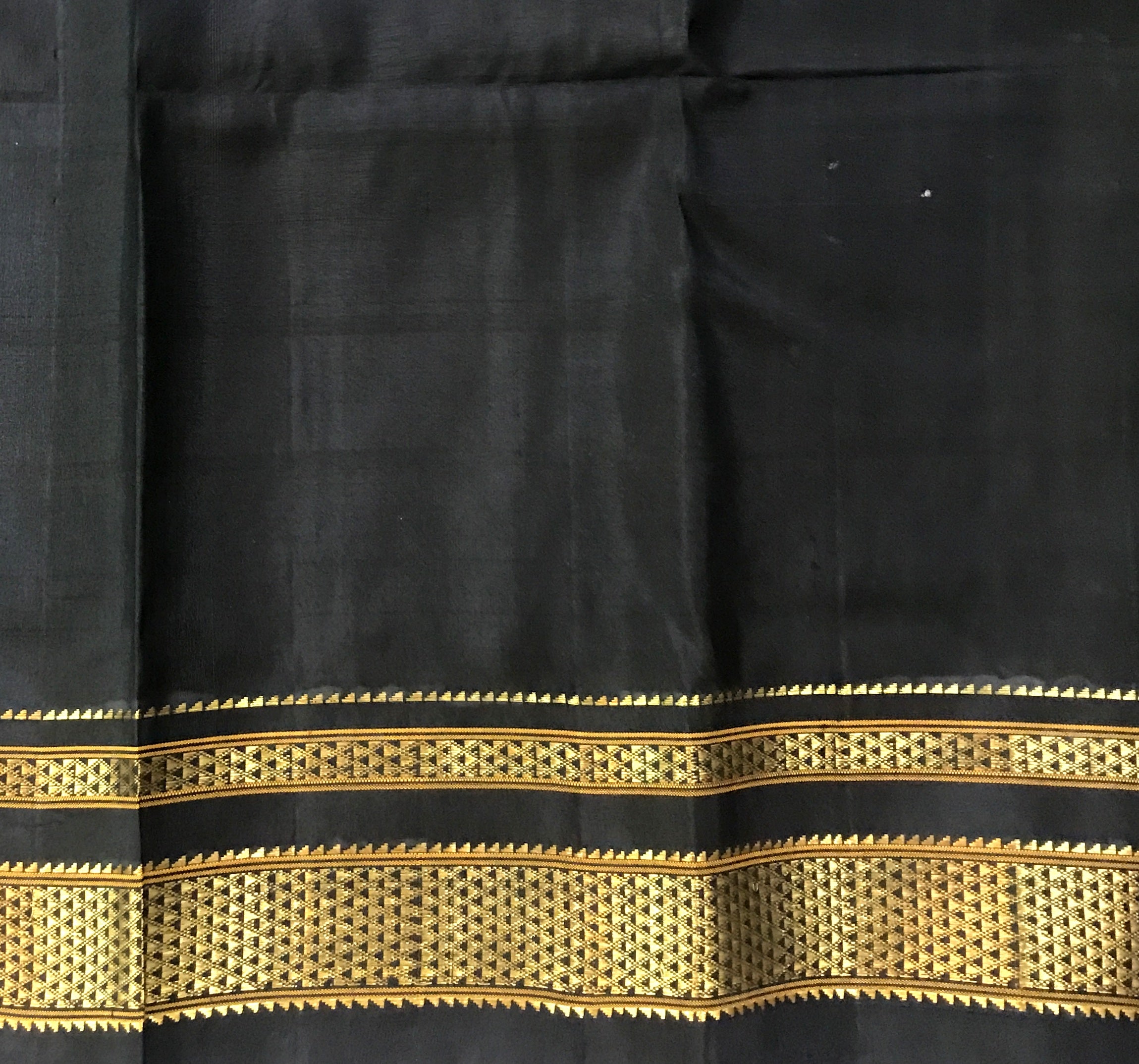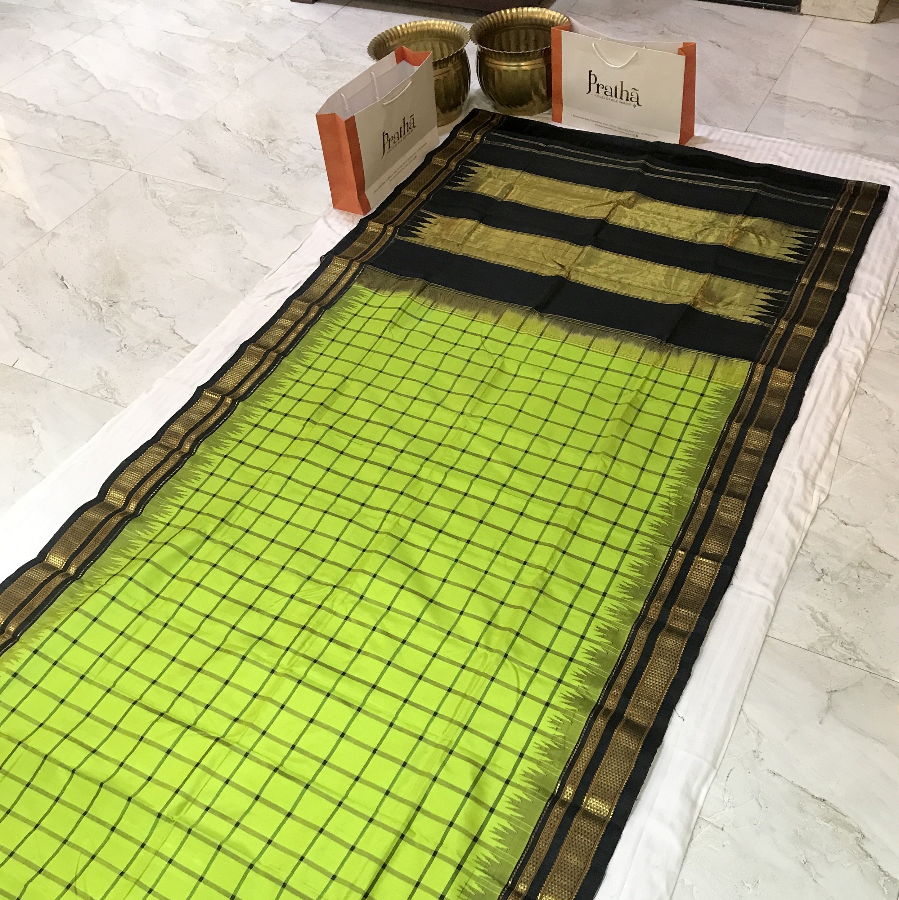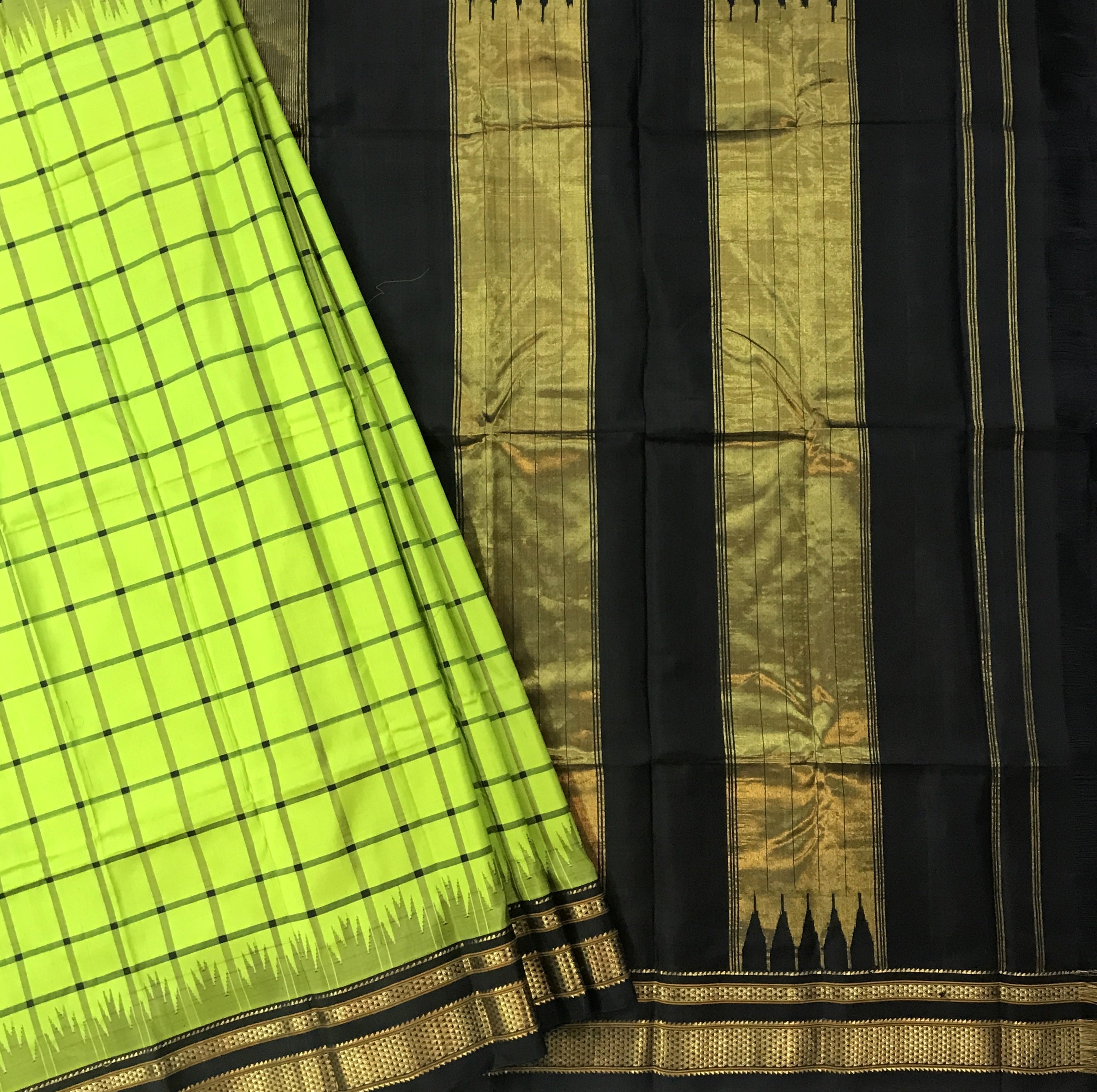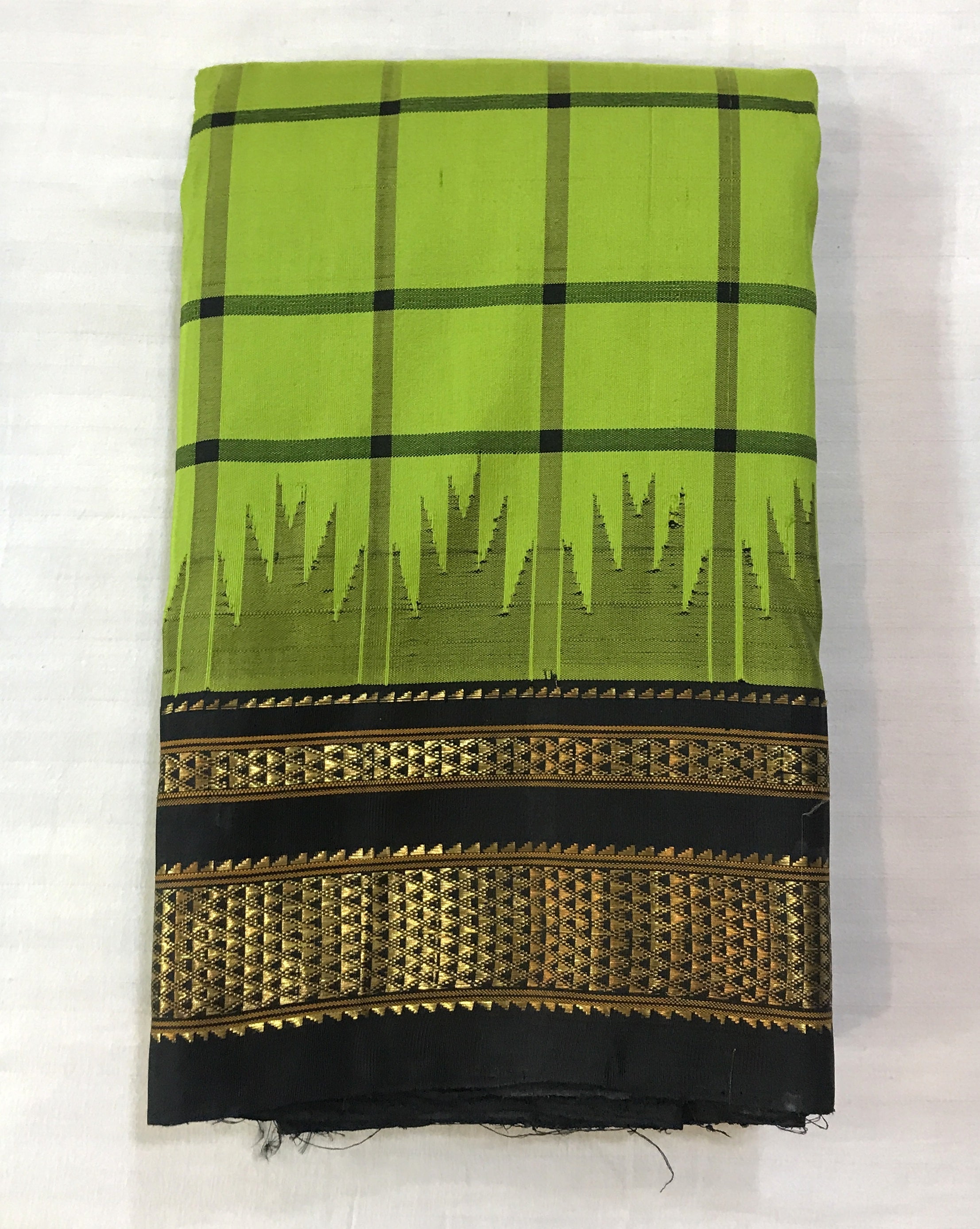 A very beautiful and attractive combination of Green with a black coloured temple design golden zari border, look magnificent especially with the zari checks woven throughout this pure silk handwoven Irkal. This classic weave looks stunning when drape. The zari checks and the traditional temple design of the border give festive touch to this weave.