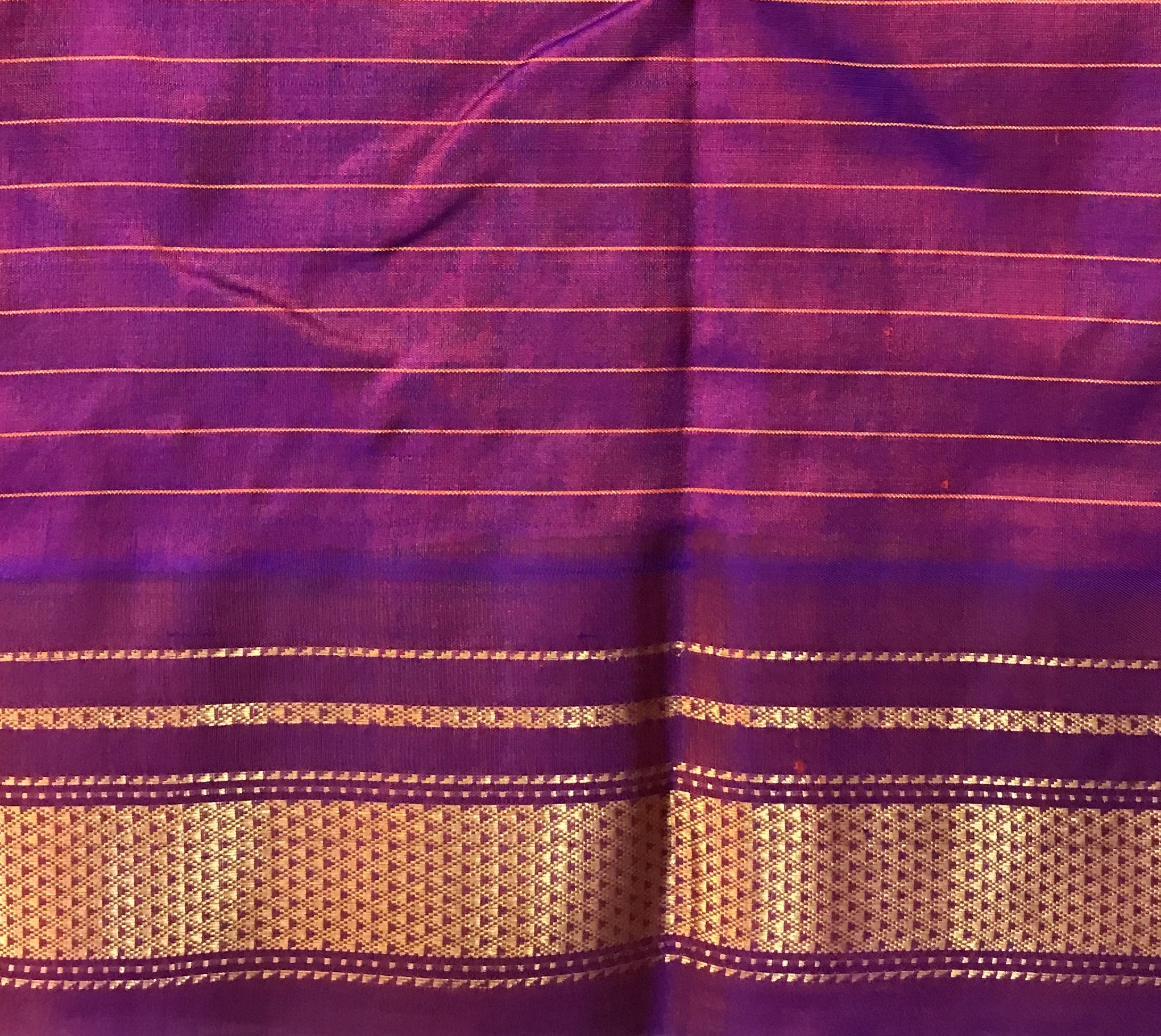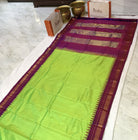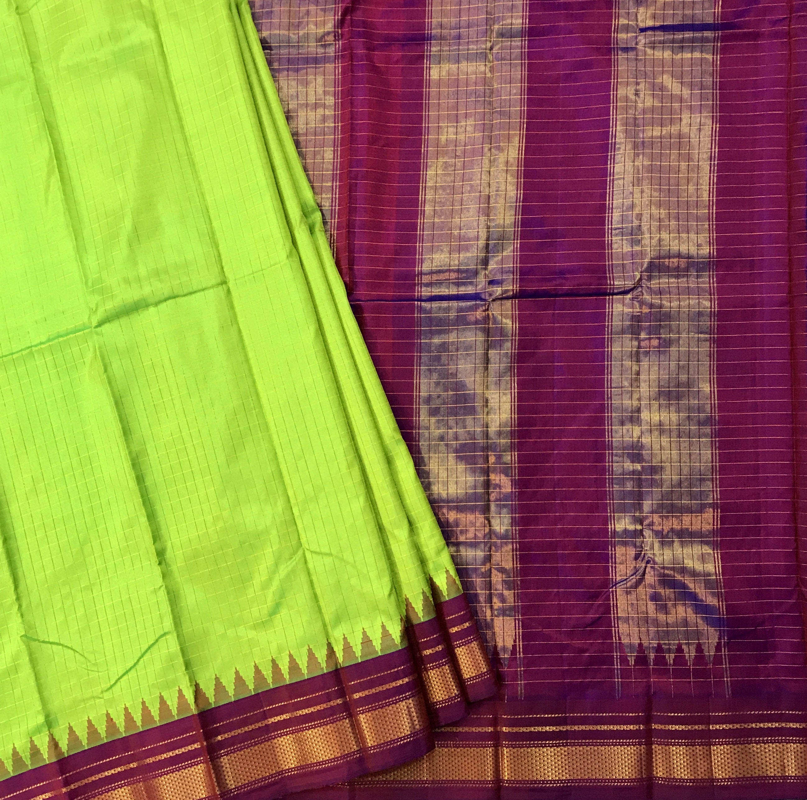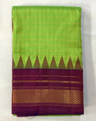 This is an extremely unique combination of parrot green and fresh magenta looks magnificent especially with the small zari checks woven throughout this pure silk handwoven Irkal .This classic weave looks stunning when draped. The zari checks and the traditional design with temple border give a festive touch to this weave.