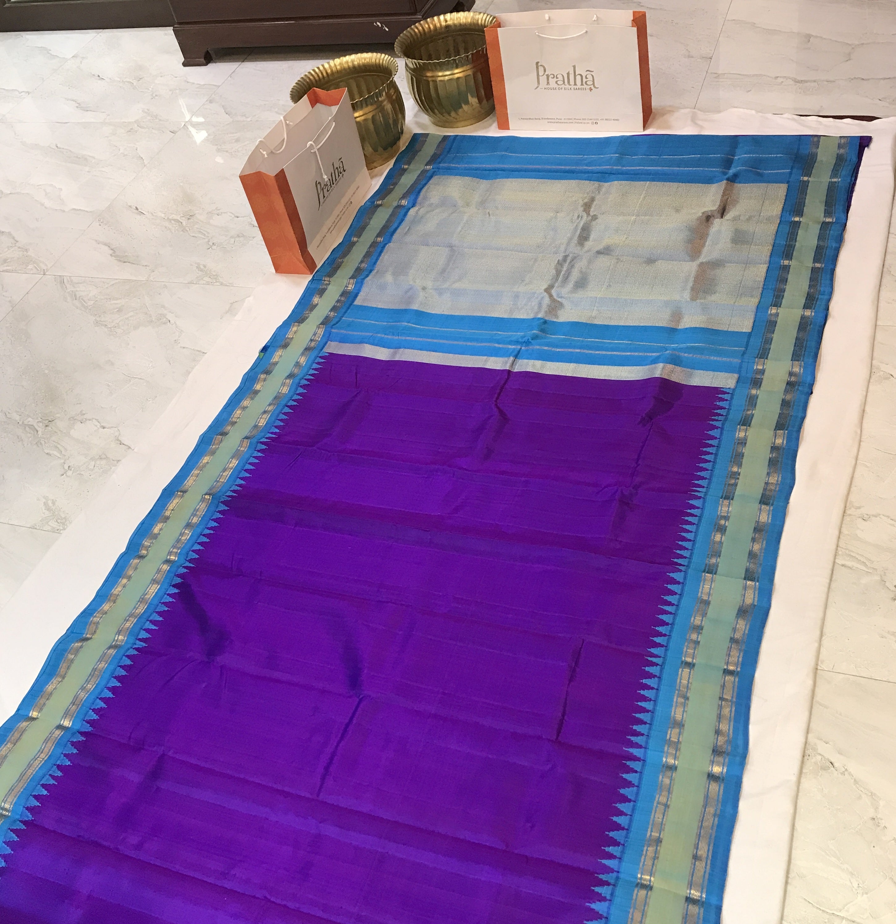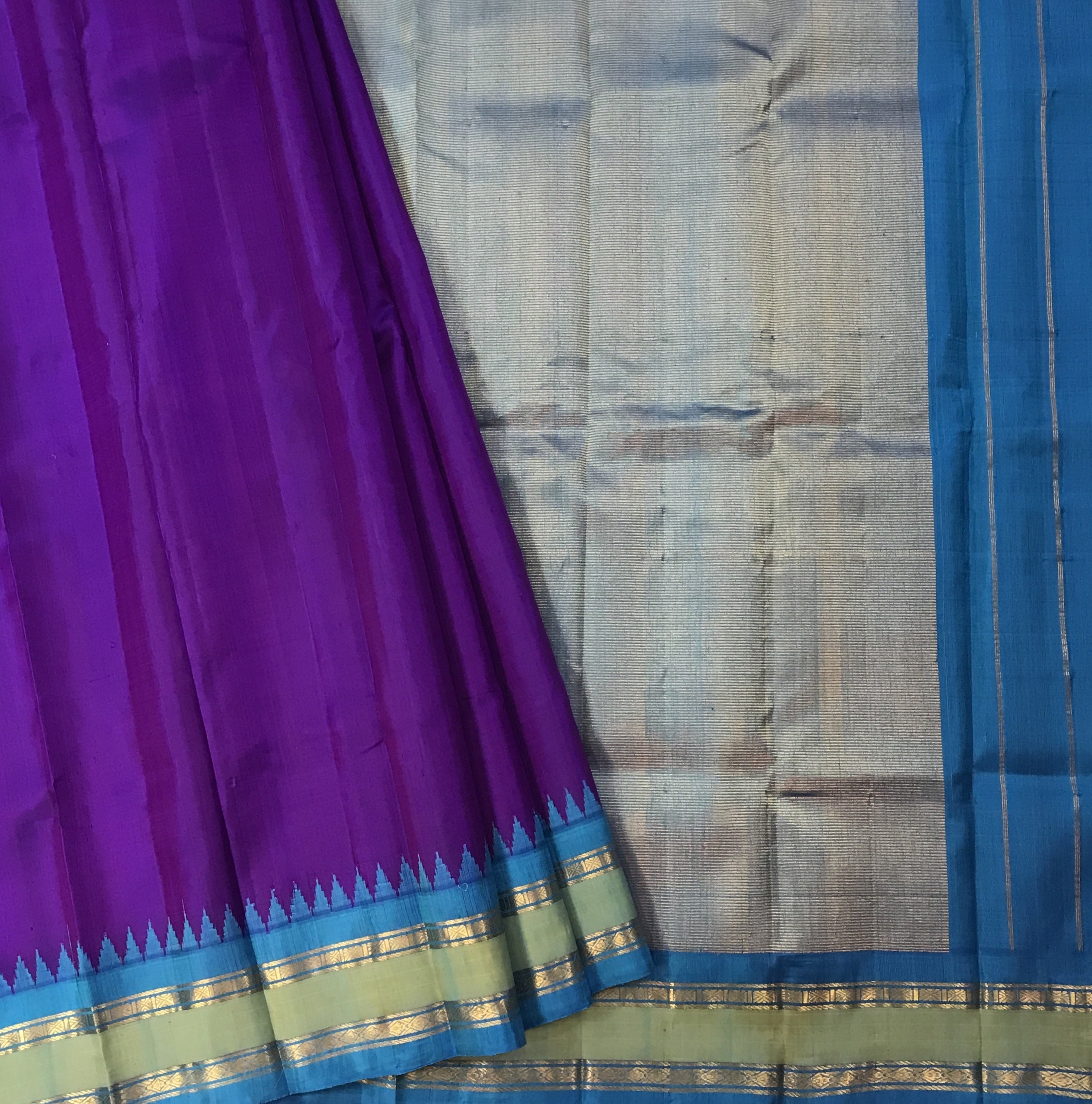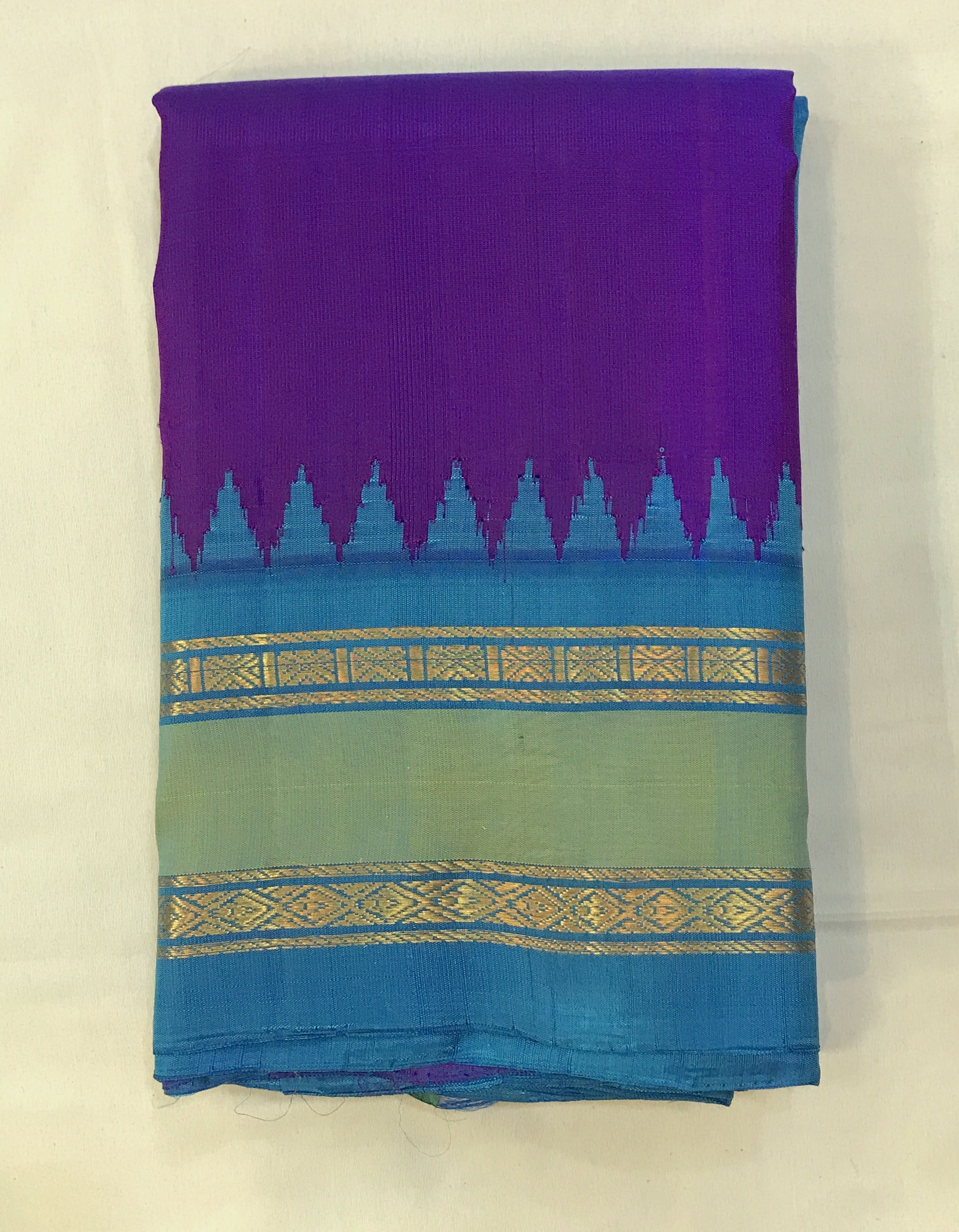 A beautifully handwoven plain Irkal, this one has an elaborate temple design at its border! A dark shade of purple paired with a deep shade of blue, this is a gorgeous combination and can be worn during the day as well as at night! Do not miss the traditional Irkal golden zari pallu looks great ! This is simply beautiful.
