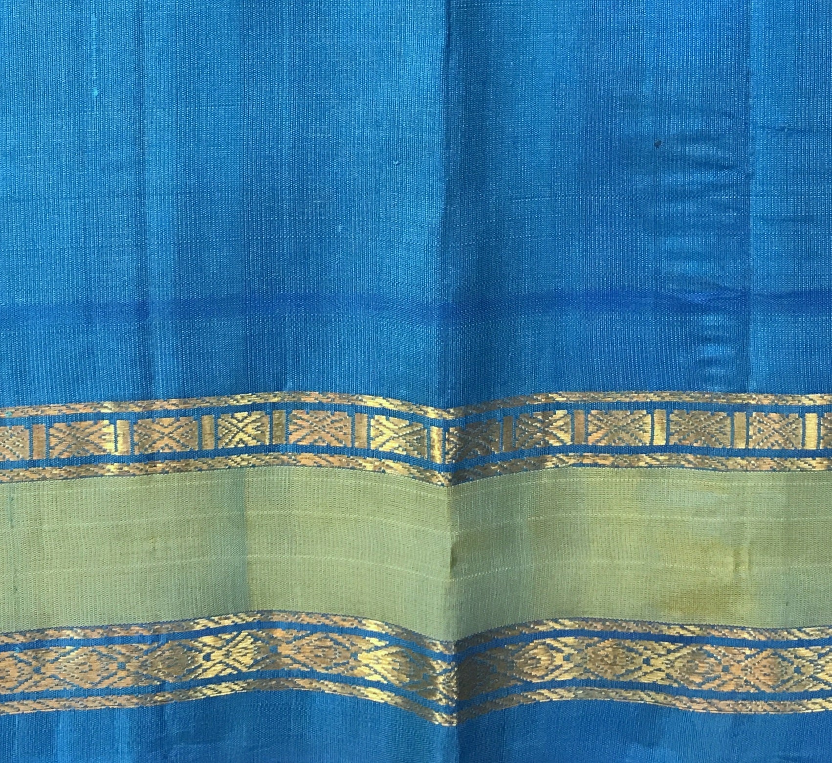Blouse Colour: Contrast ( Blue with golden zari border )