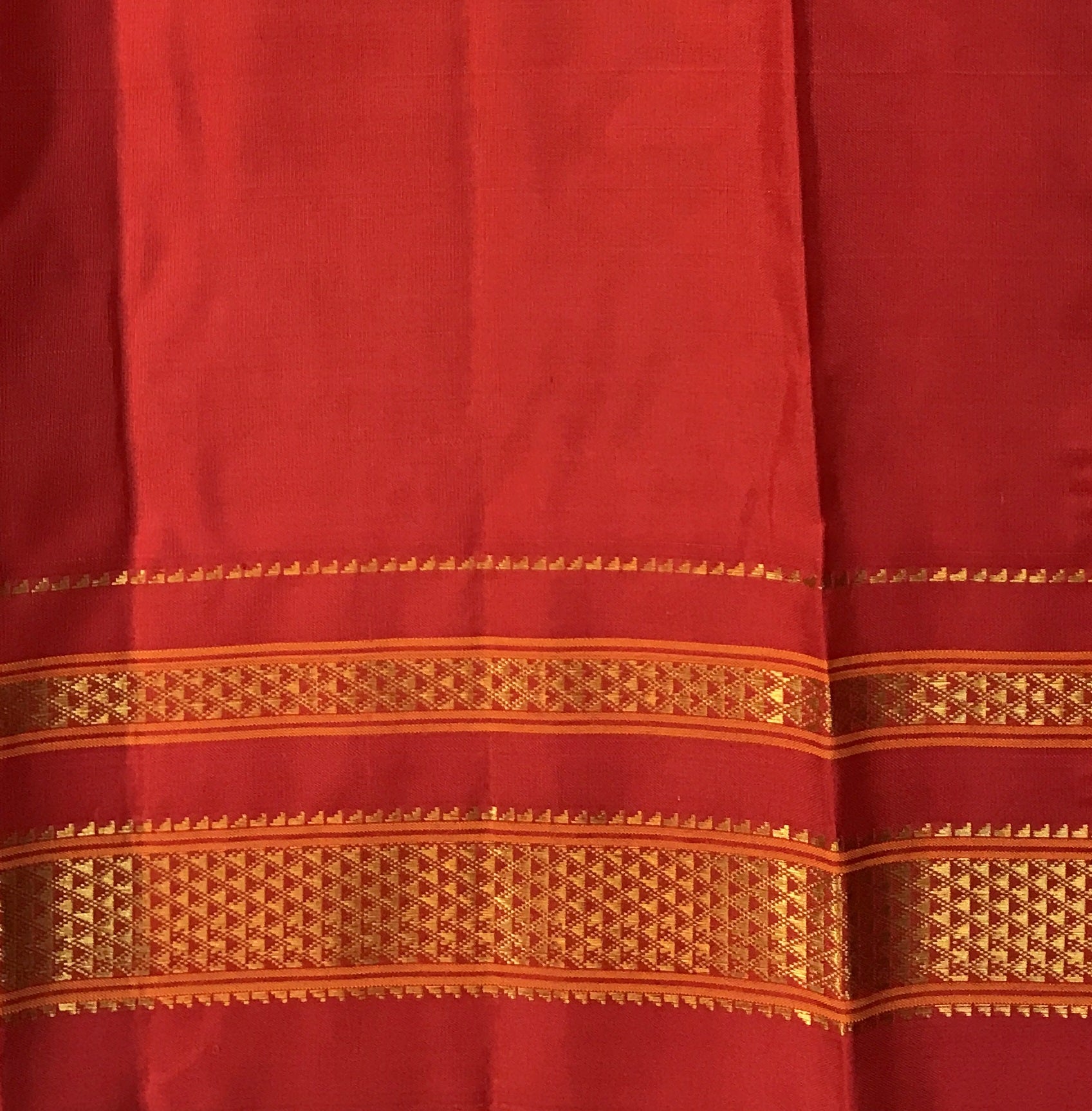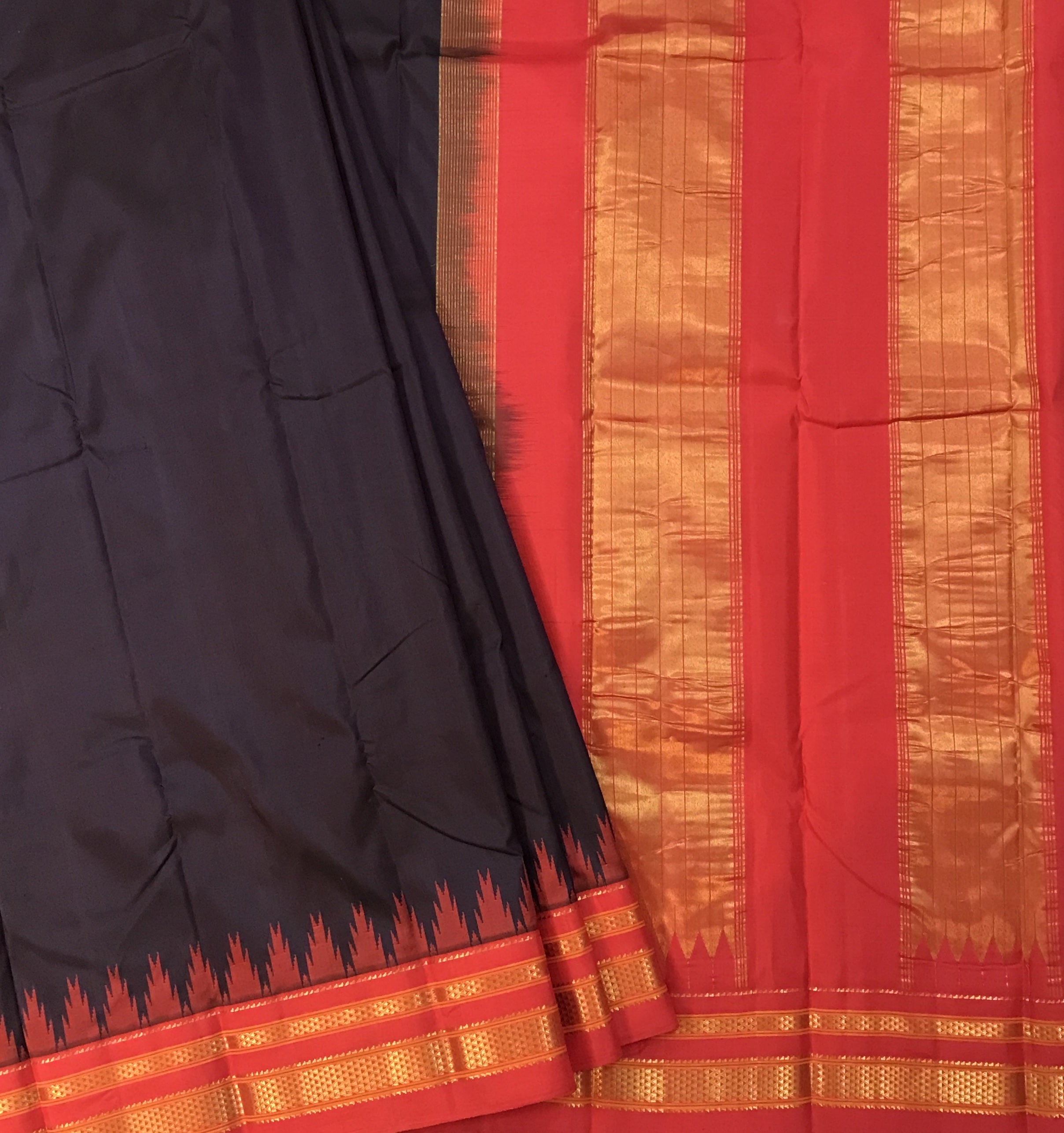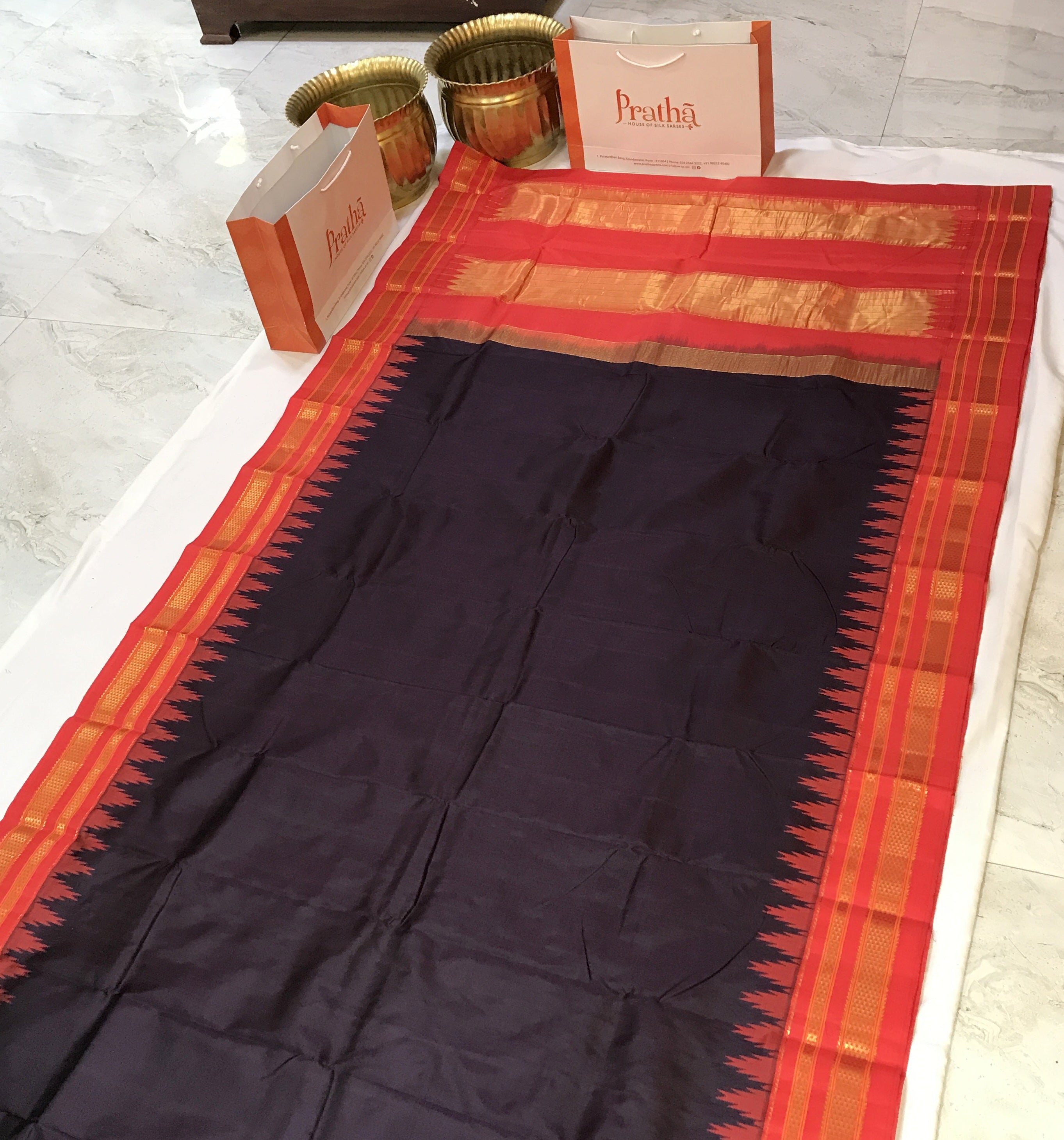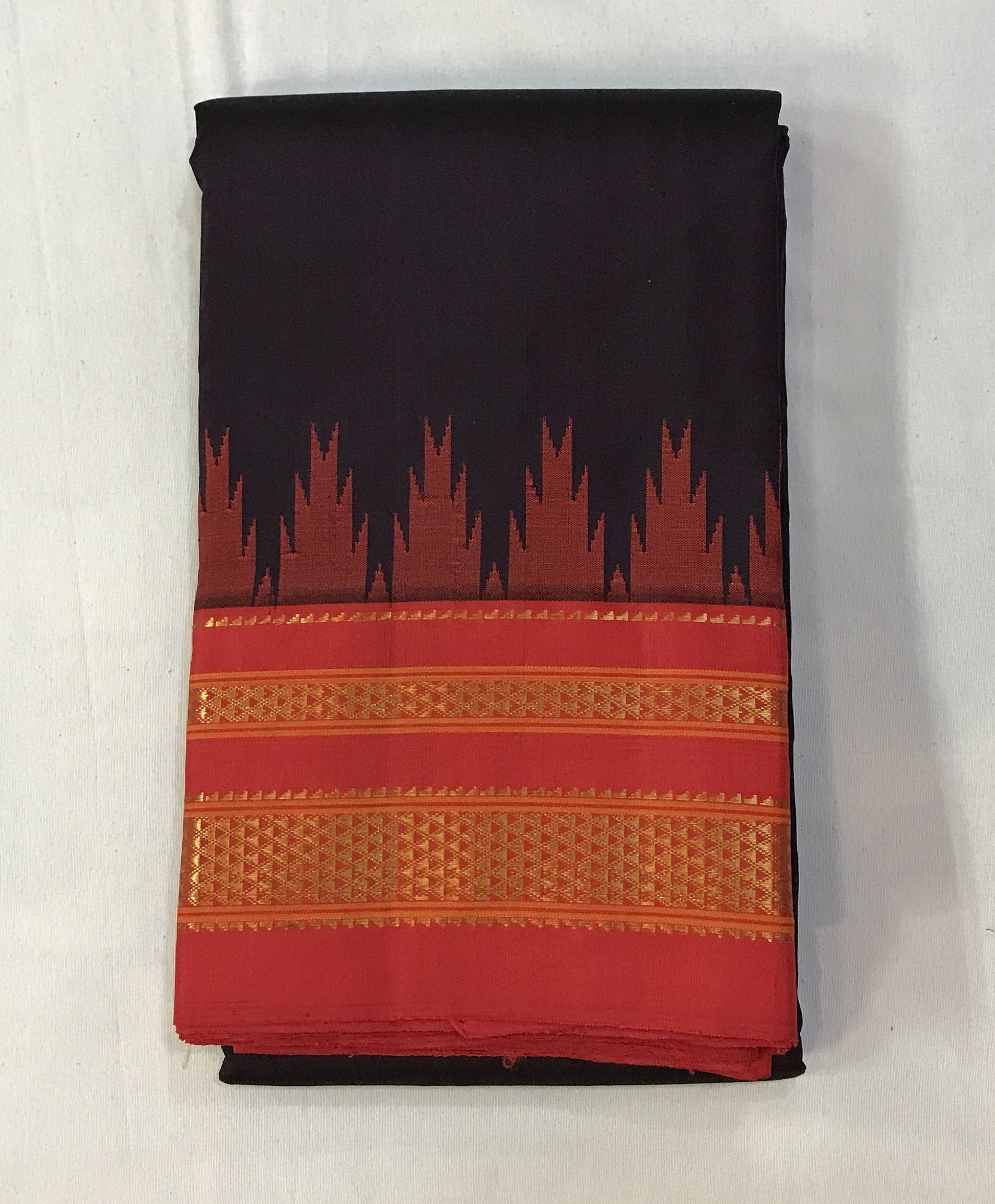 A very unique combination of coffee-brown and red this shade of Irkal is truly looks great! And especially when it teams up with a beautiful shade of red at its border and pallu. This Irkal has an elaborate temple design at its border and a beautiful golden zari pallu which gives this saree a traditional and festive touch.