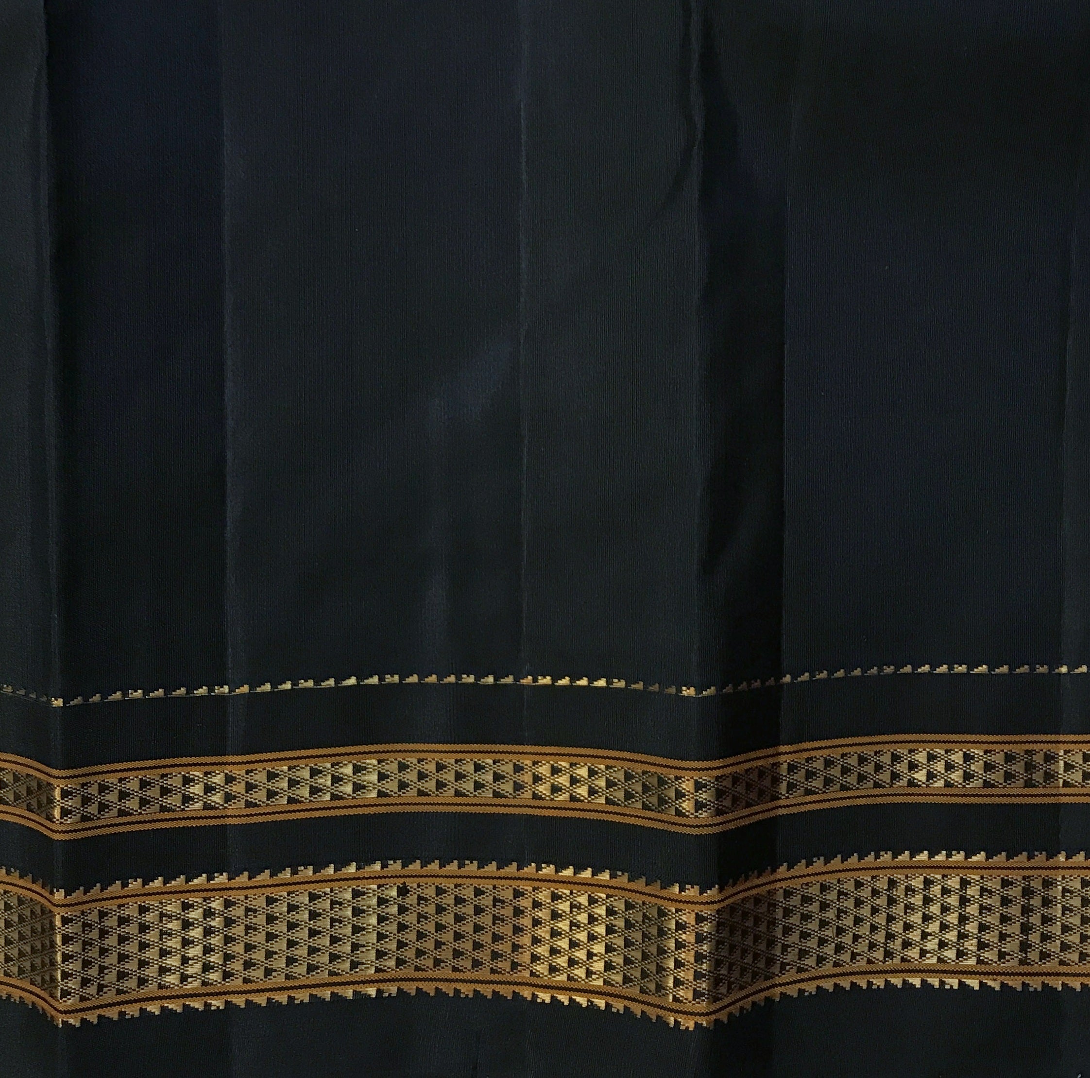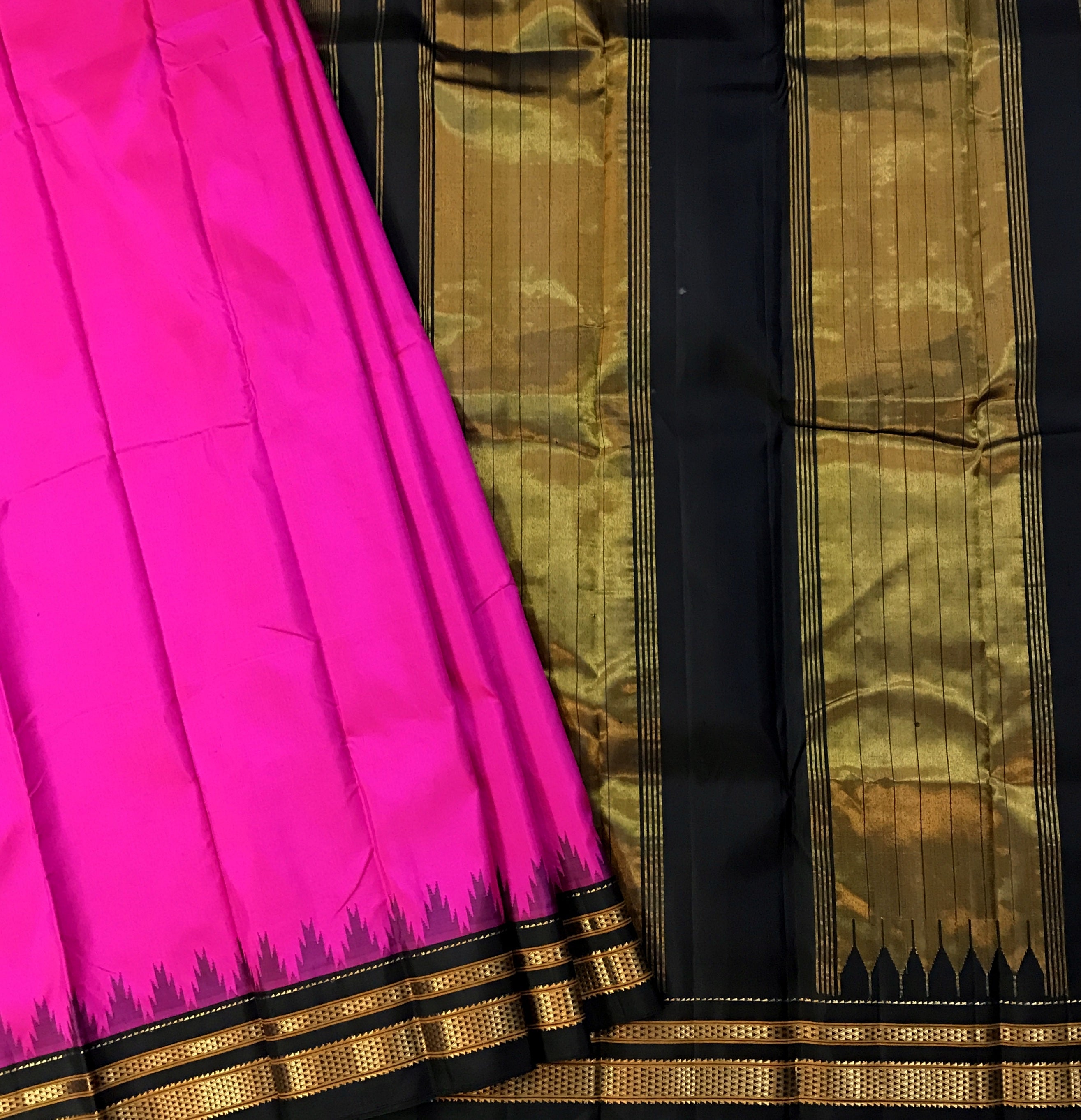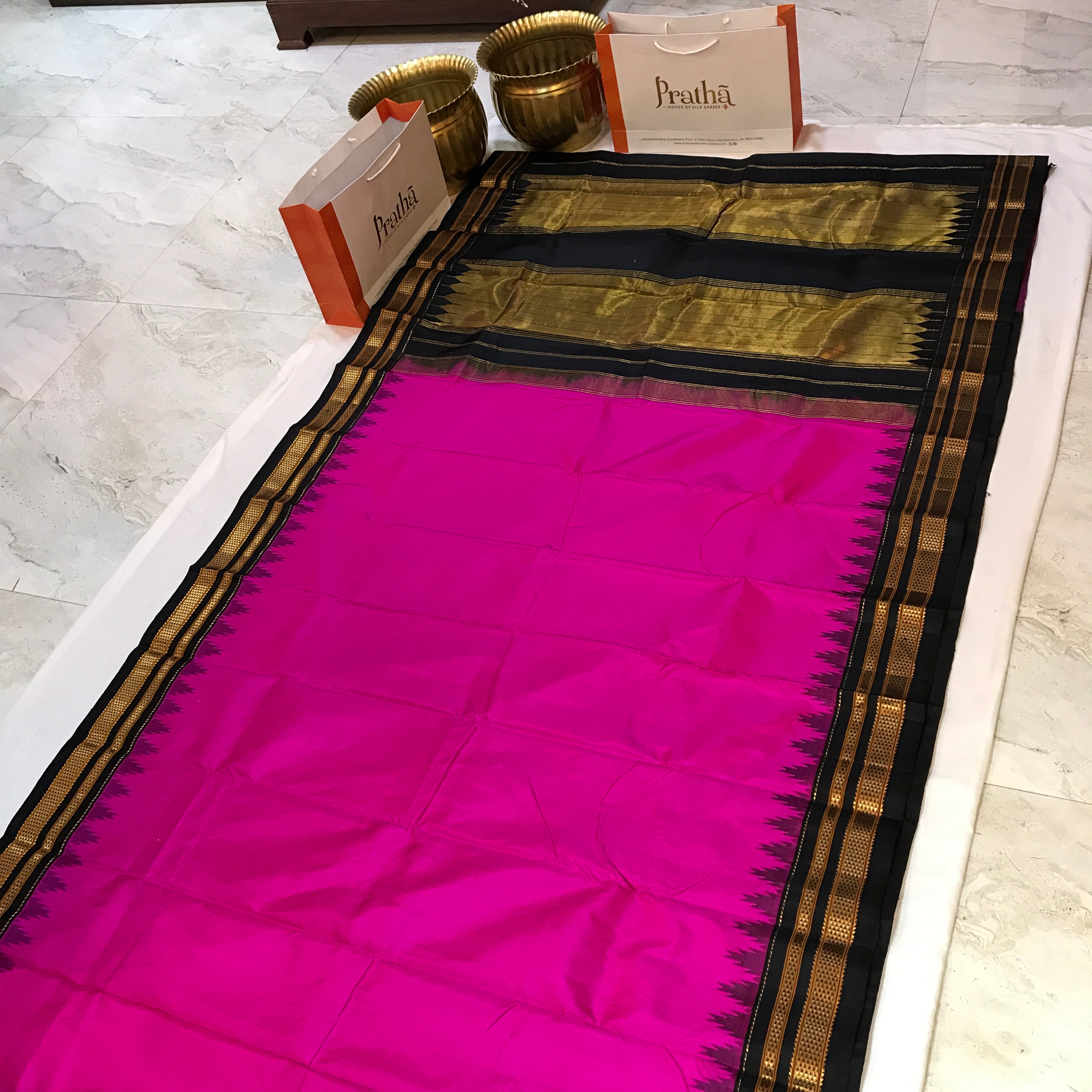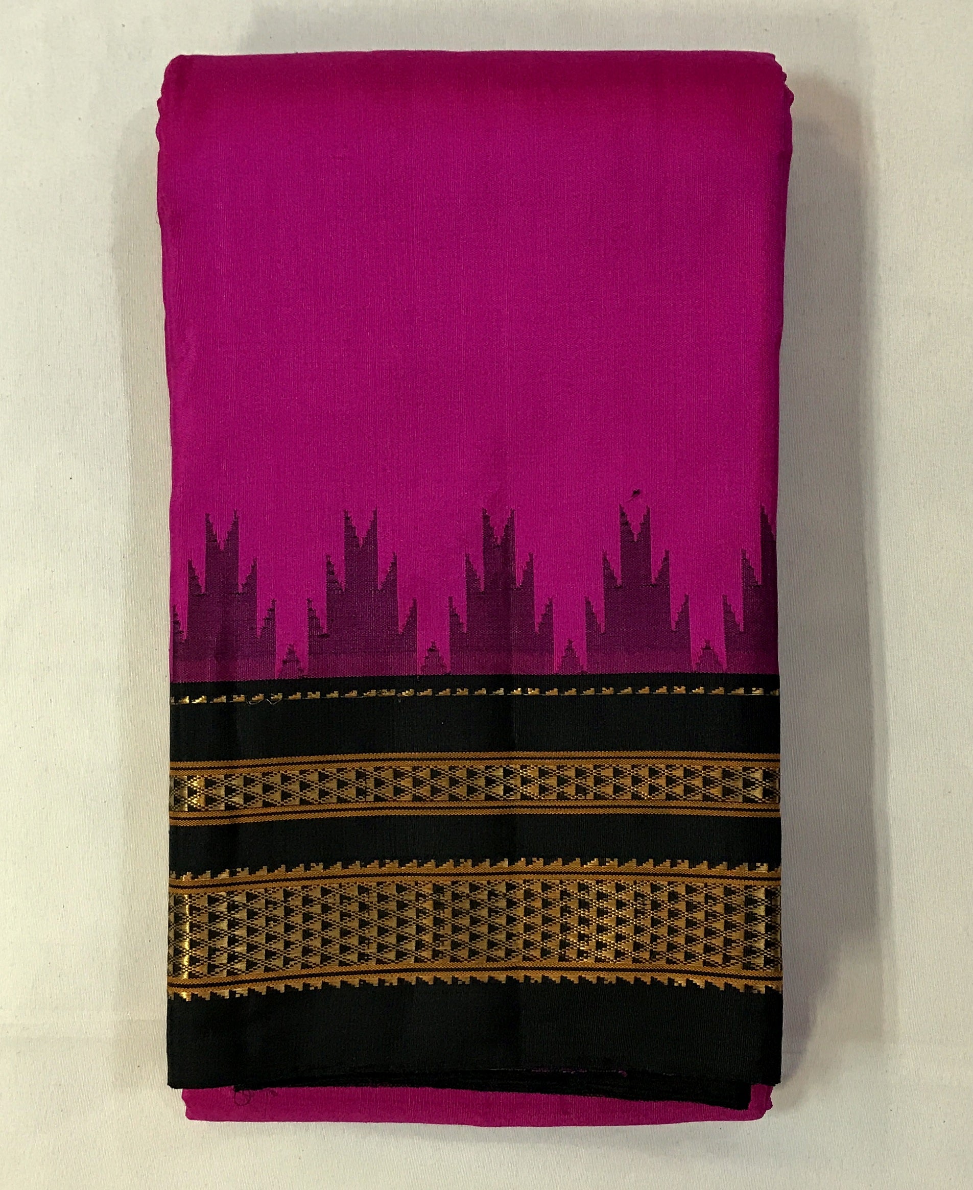 This beautifully handwoven Irkal has an elaborate temple design at its border! A shade of Pink with black border this one is hard to find! This Irkal is true to its essence with the most authentic border and zari pallu. The plain body (without any motifs) of this saree makes this a traditional yet trendy weave.