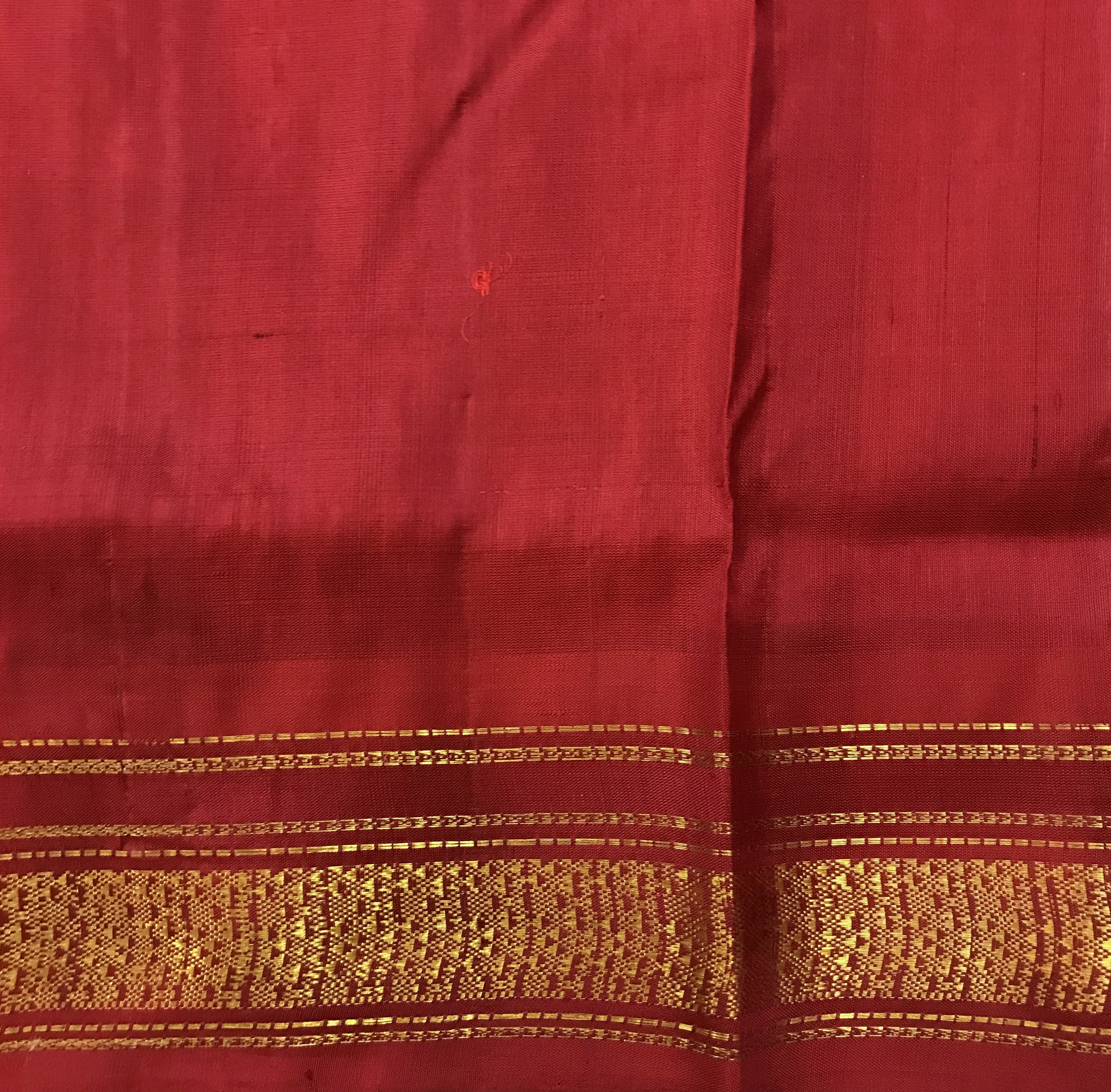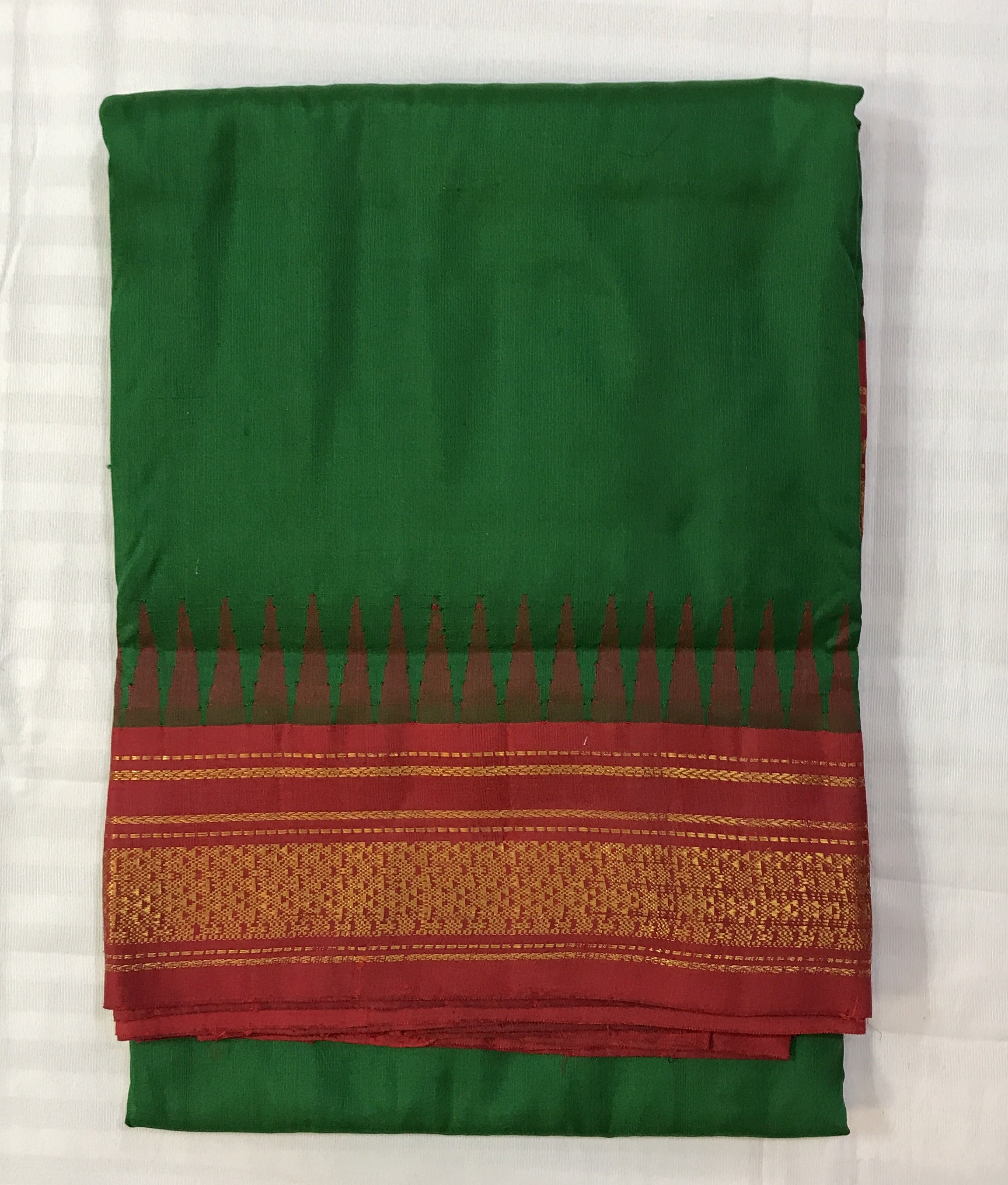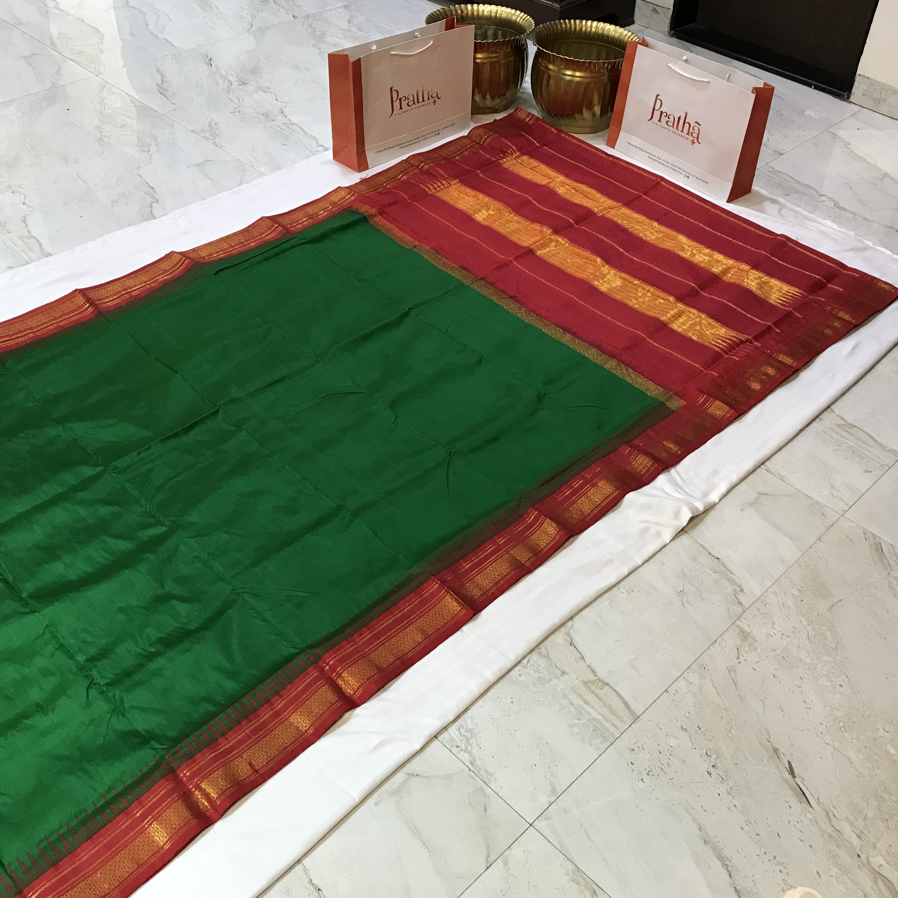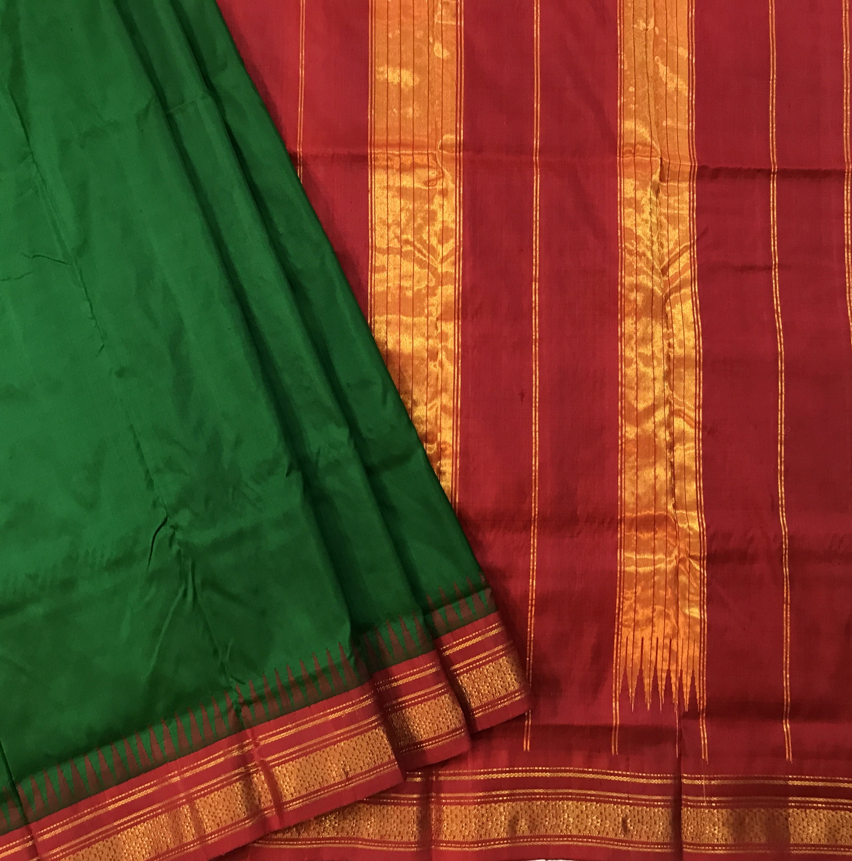 A beautifully handwoven plain Irkal, this one has an elaborate temple design at its border! A dark shade of green paired with a deep shade of red, this is a gorgeous combination and can be worn during the day as well as at night! Do not miss the traditional Irkal golden zari pallu looks great ! This is simply beautiful.