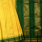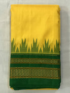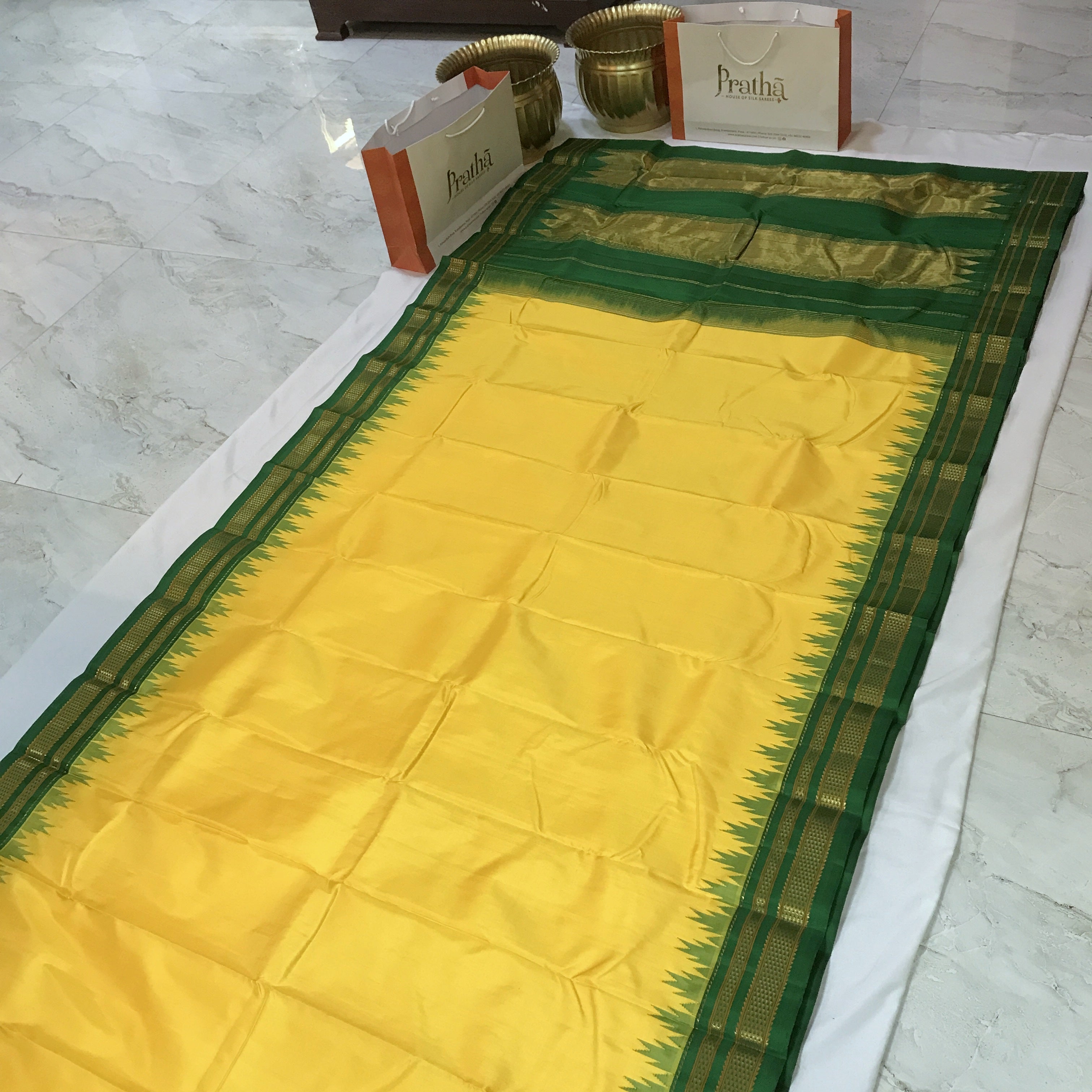 A vibrant shade of 'yellow', this Irkal always wins hearts! And especially when it teams up with a beautiful shade of green at its border and pallu. This Irkal has an elaborate temple design at its border and a beautiful golden zari pallu which gives this saree a traditional and festive touch.