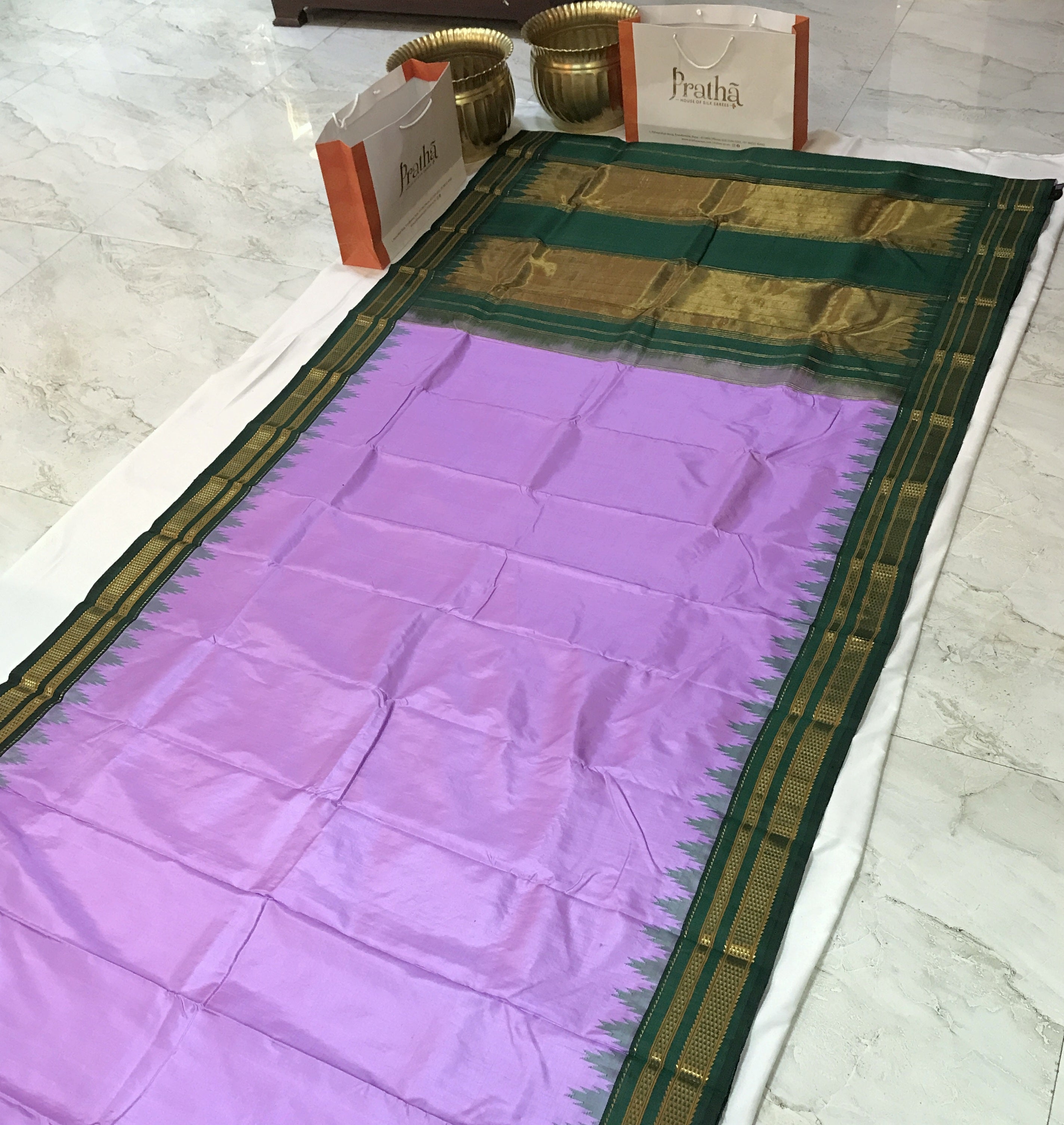 A very beautiful and unique combination of 'lavender', this Irkal always wins hearts! And especially when it teams up with a beautiful shade of green at its border and pallu. This Irkal has an elaborate temple design at its border and a beautiful golden zari pallu which gives this saree a traditional and festive touch.