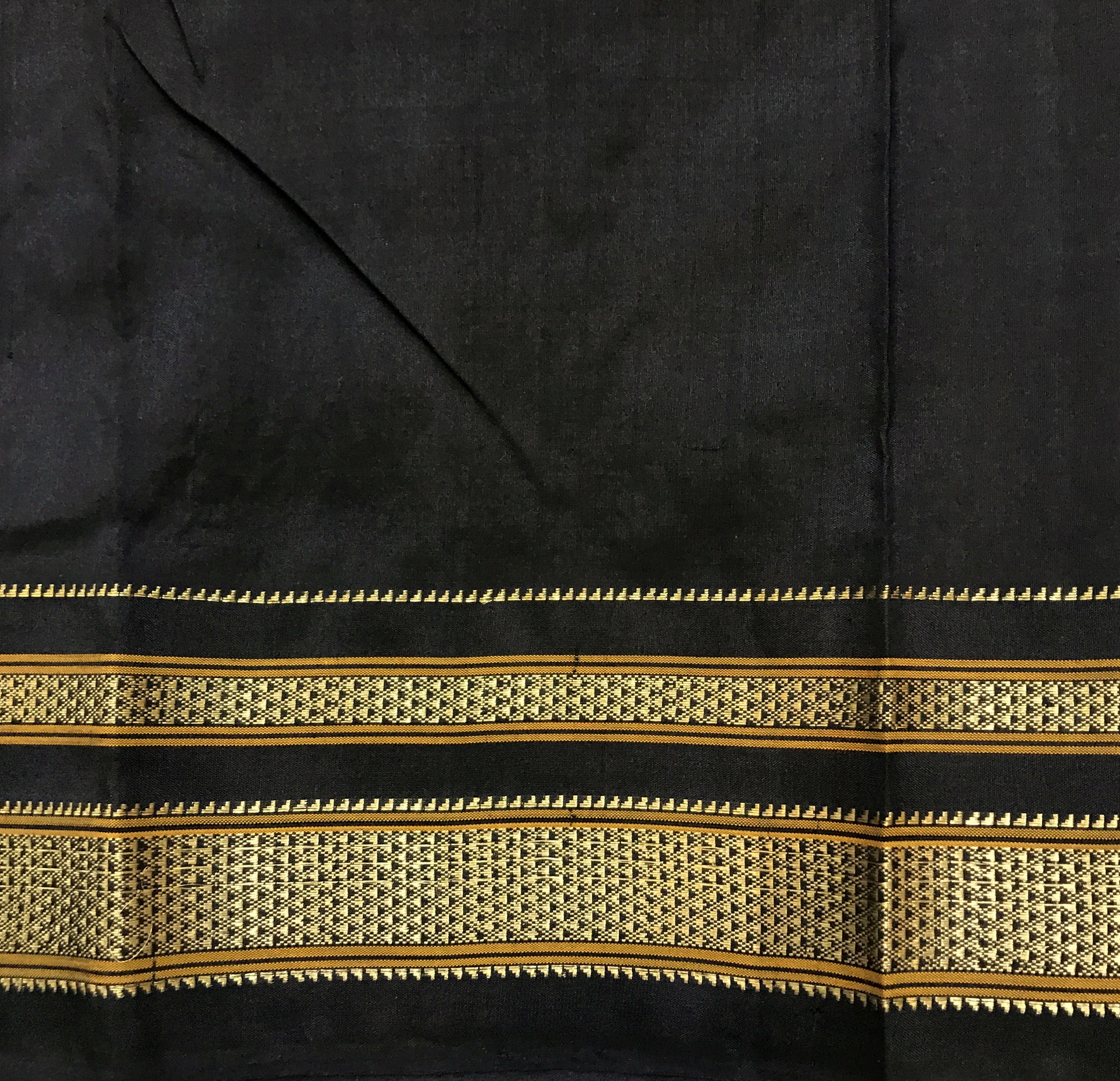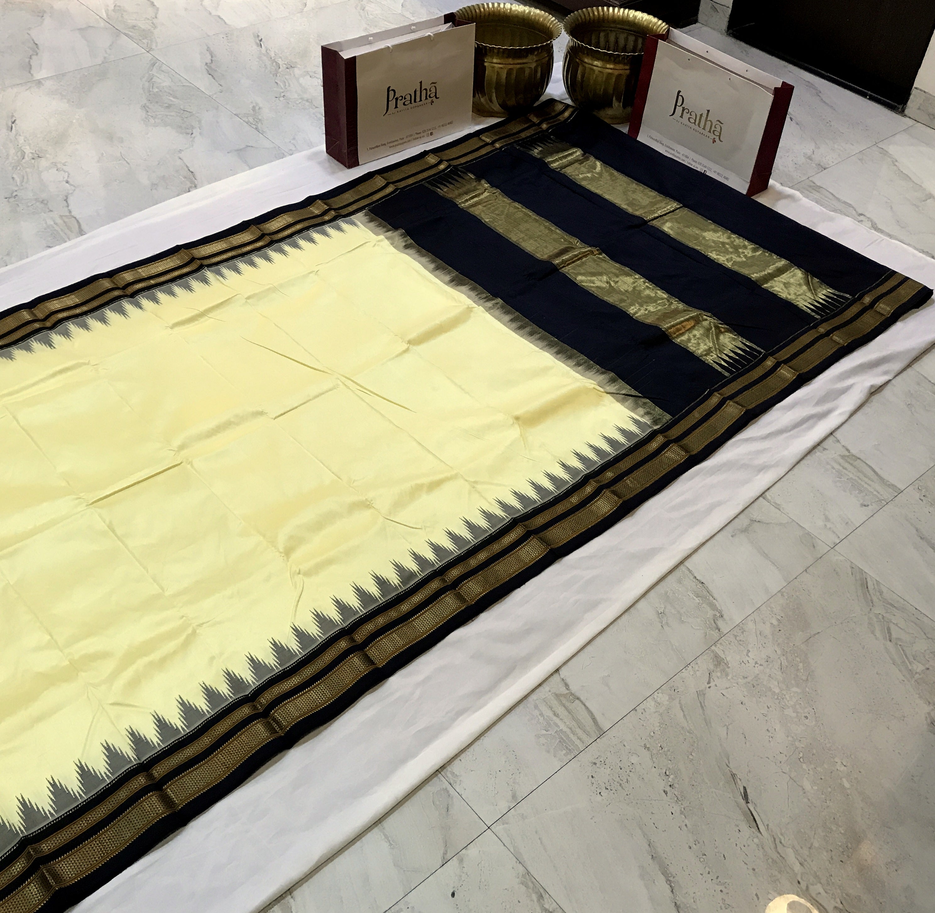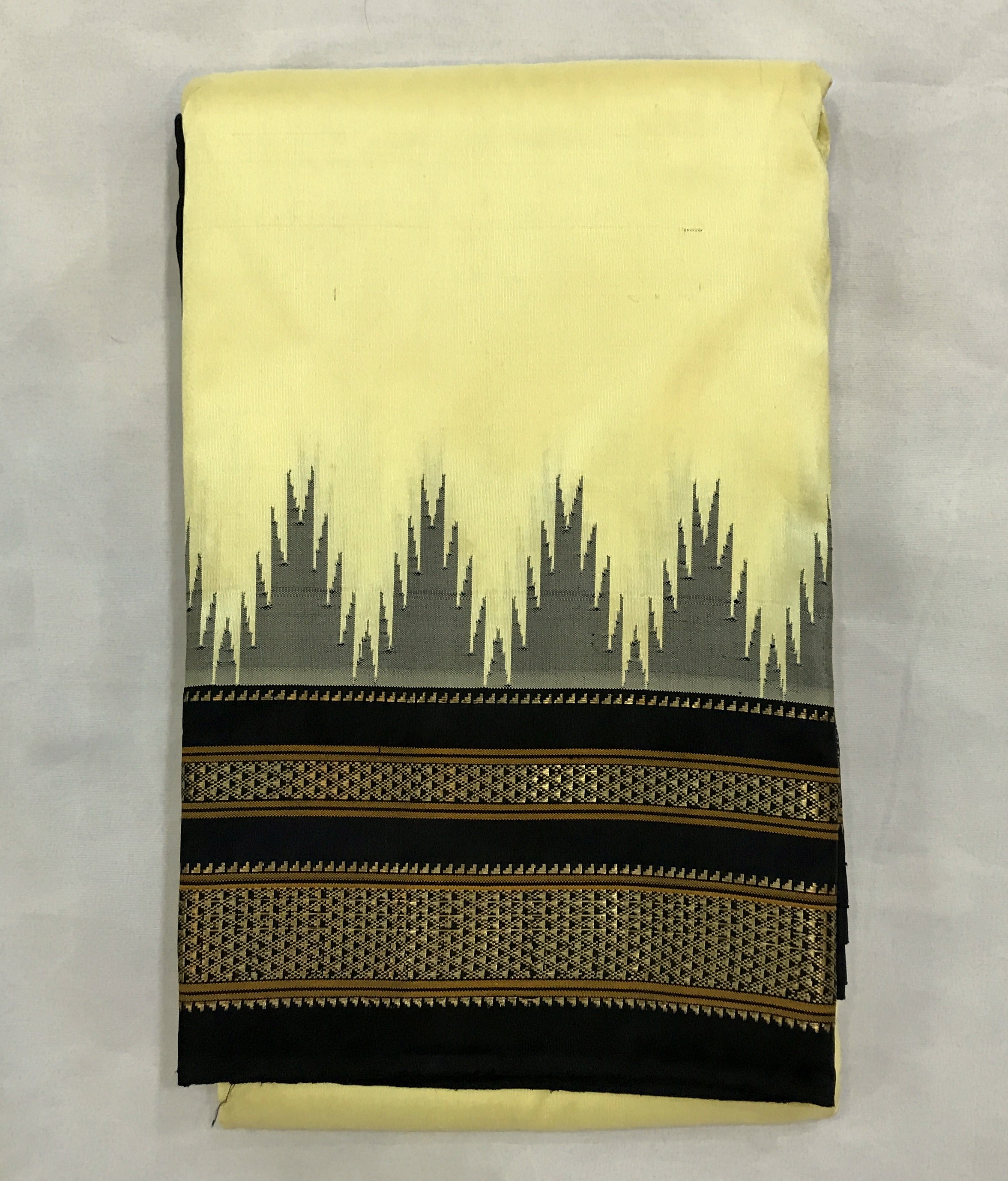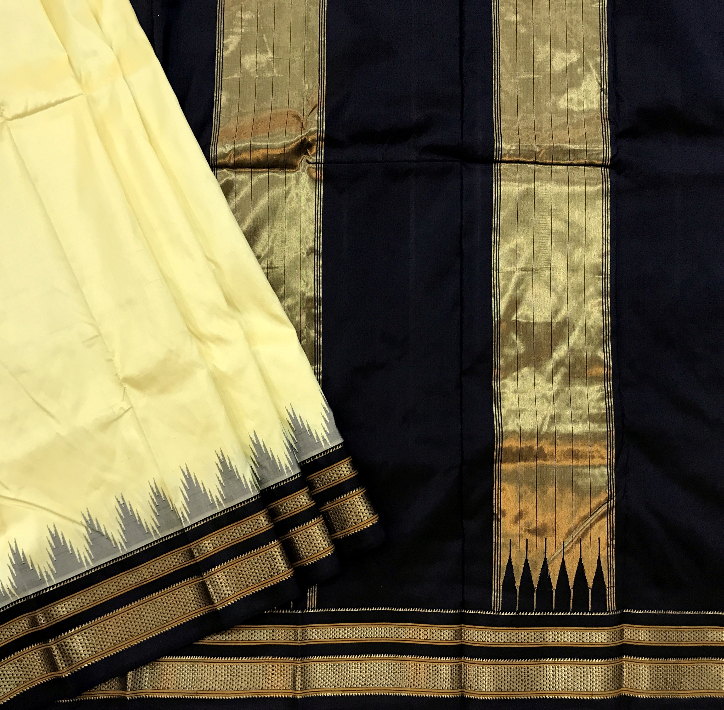 Shining off-white , this shade of Irkal is truly unique! And especially when it teams up with a beautiful shade of black at its border and pallu. This Irkal has an elaborate temple design at its border and a beautiful golden zari pallu which gives this saree a traditional and festive touch.