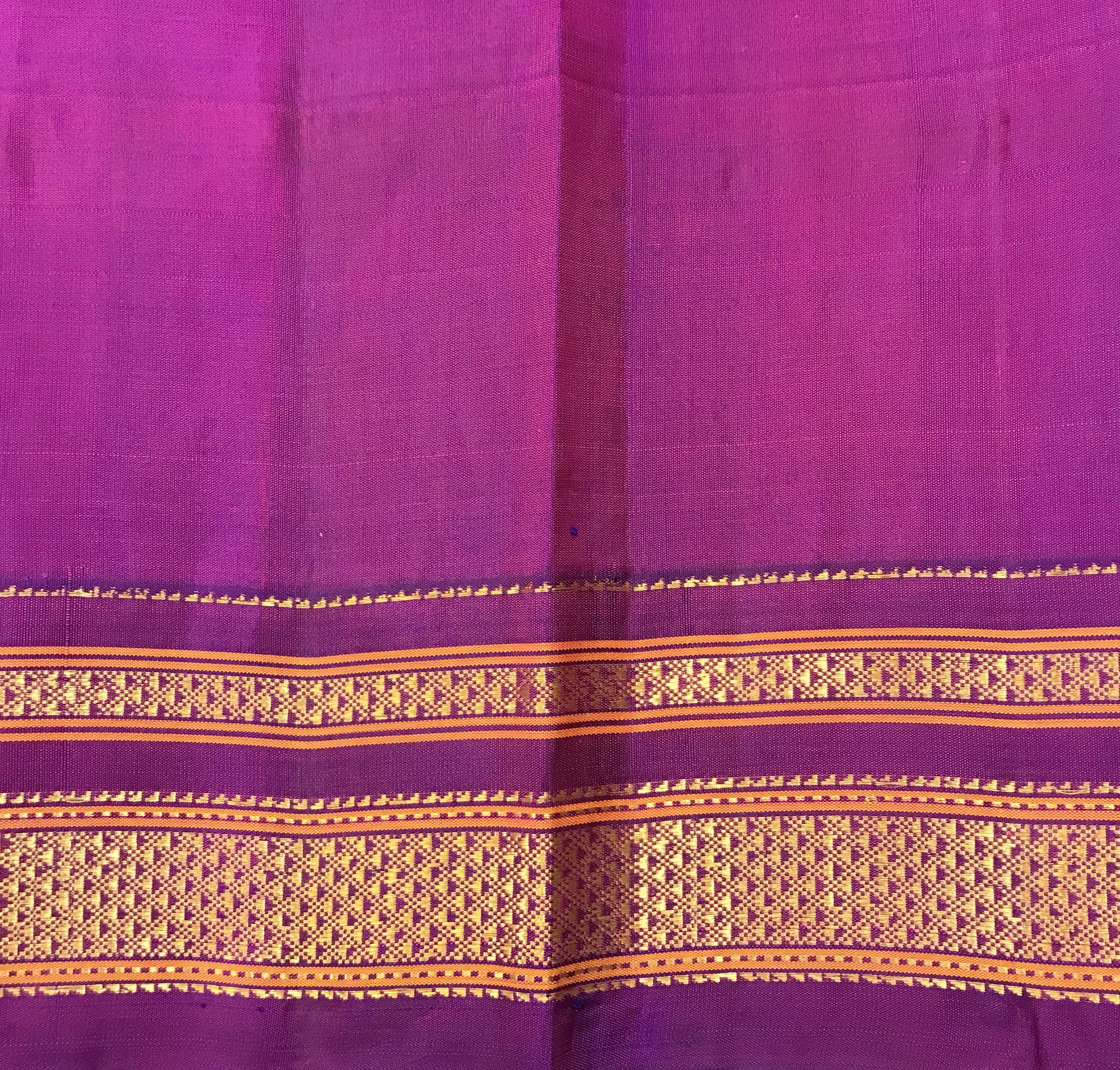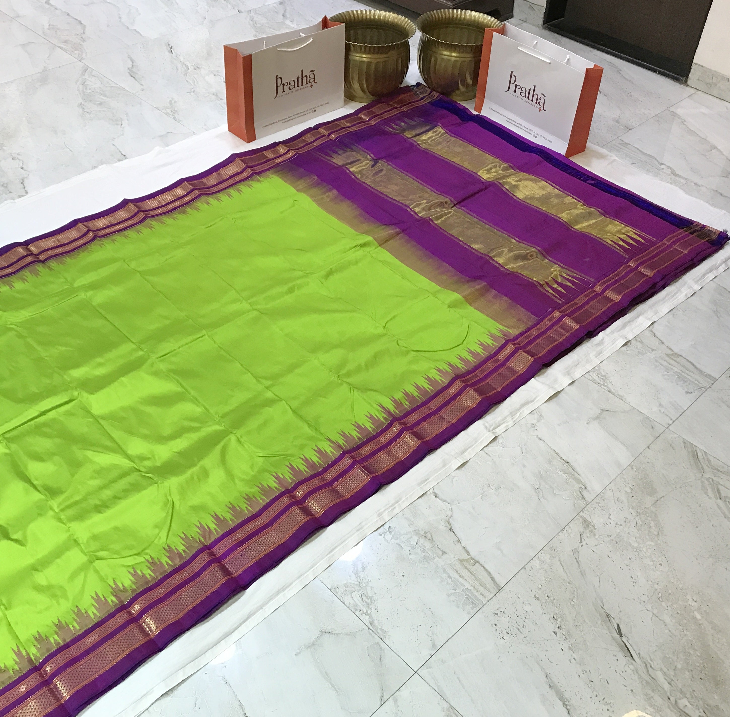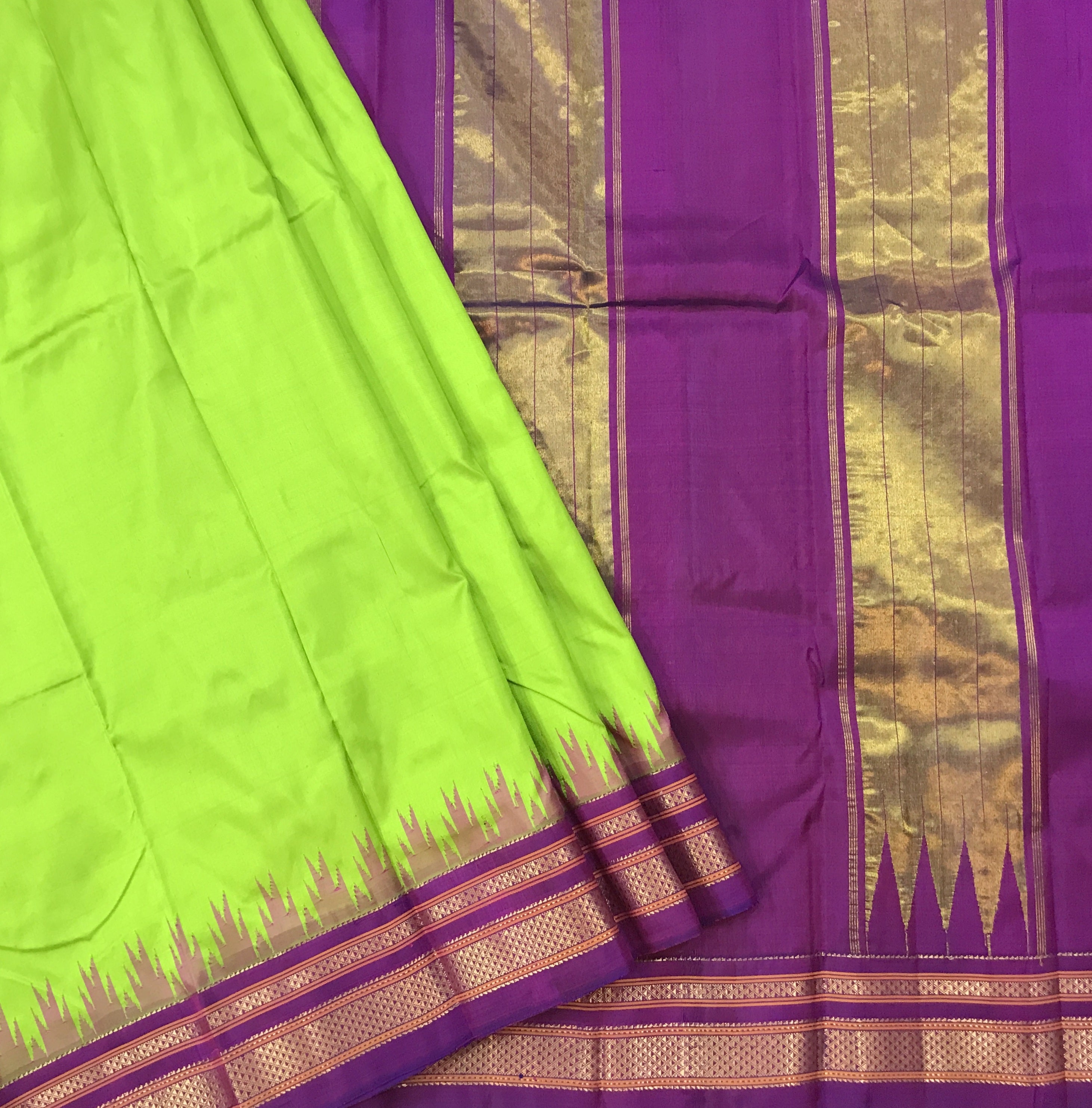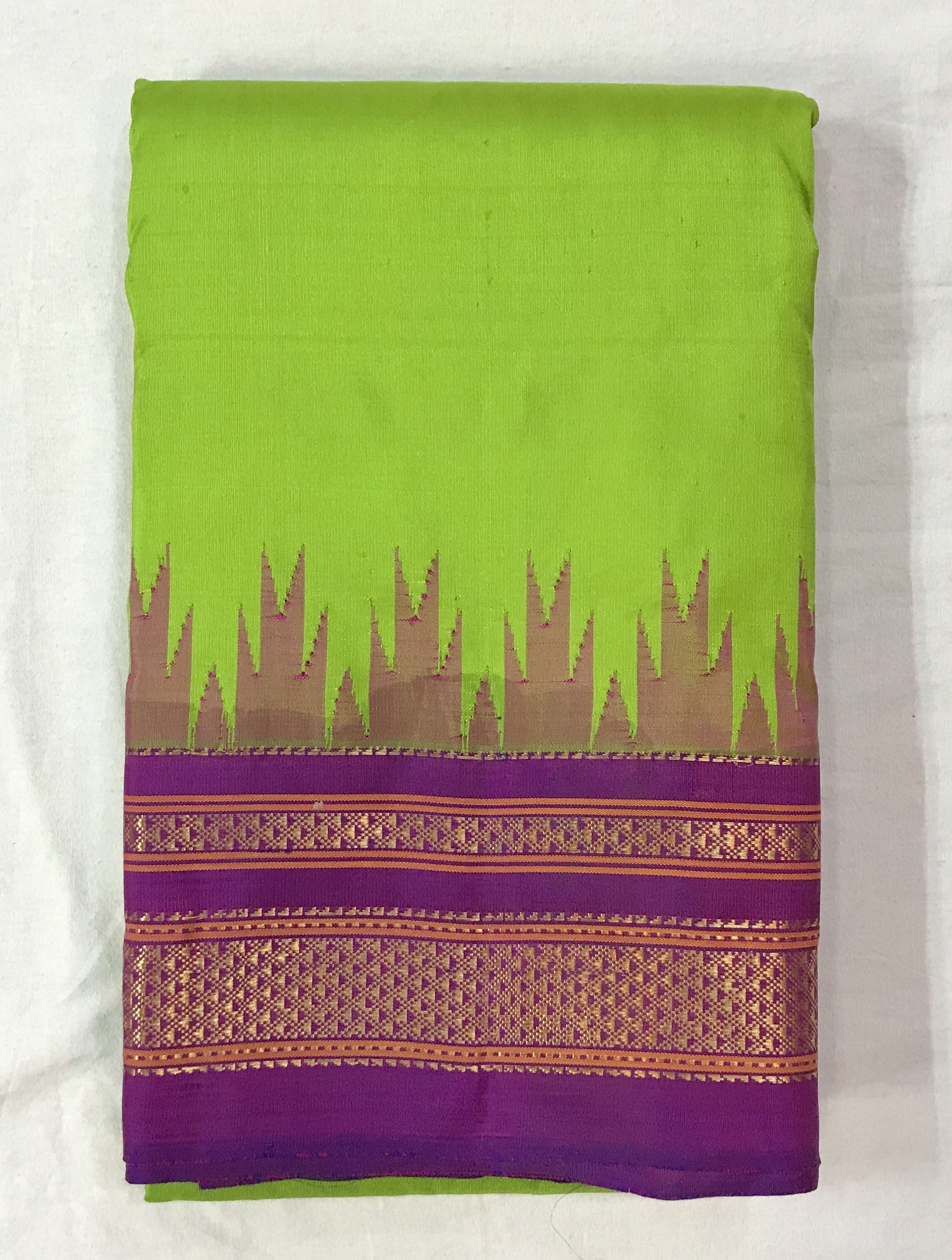 A fresh shade of parrot-green this colour of Irkal always wins hearts, especially when it teams up with a beautiful shade of pinkish purple at its border and pallu. This Irkal has an elaborate temple design at its border. The traditional Irkal ( Ilkal ) zari pallu gives this saree festive touch.